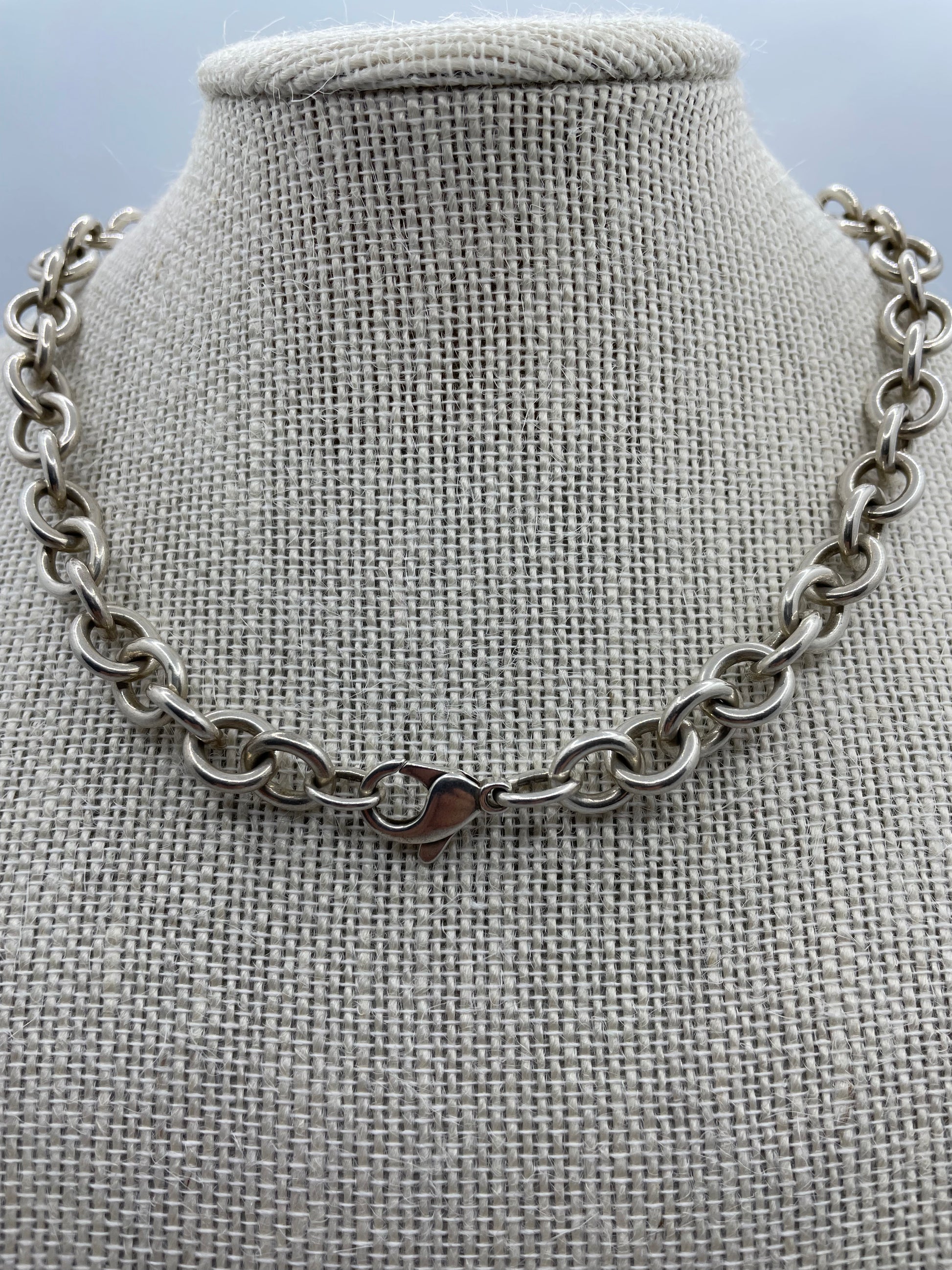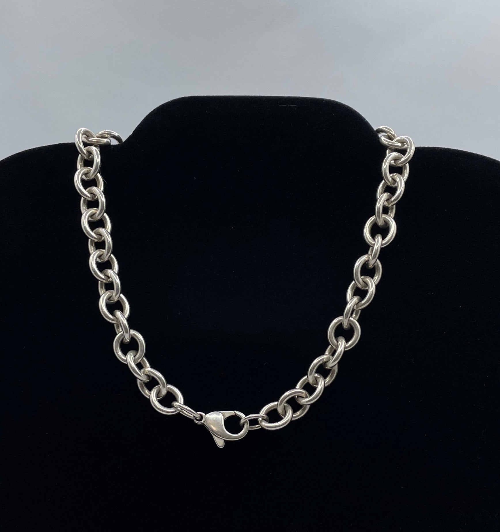 Stunning Tiffany & Co dog tag necklace, stamped for Stirling Silver 925. Super chunky, heavy choker at 69 grams! Large parrot clip clasp and large round links.