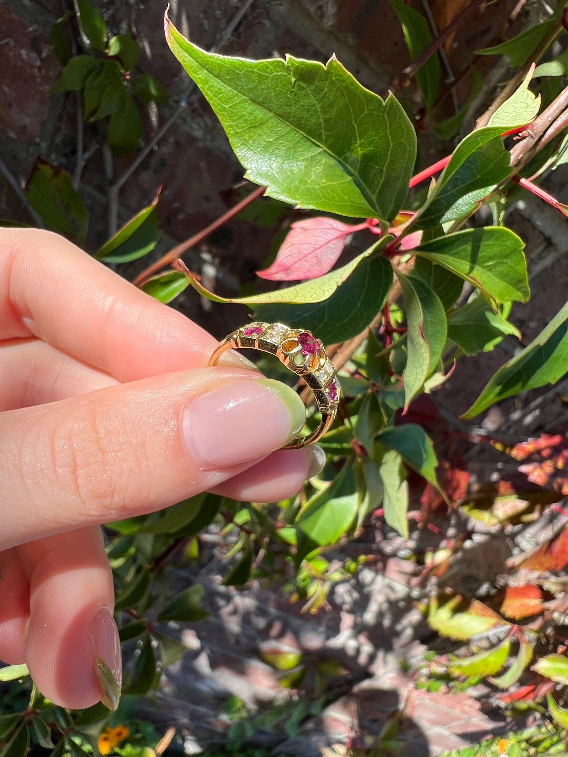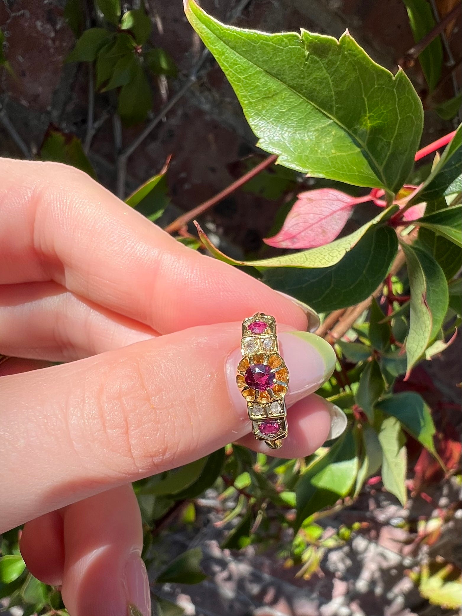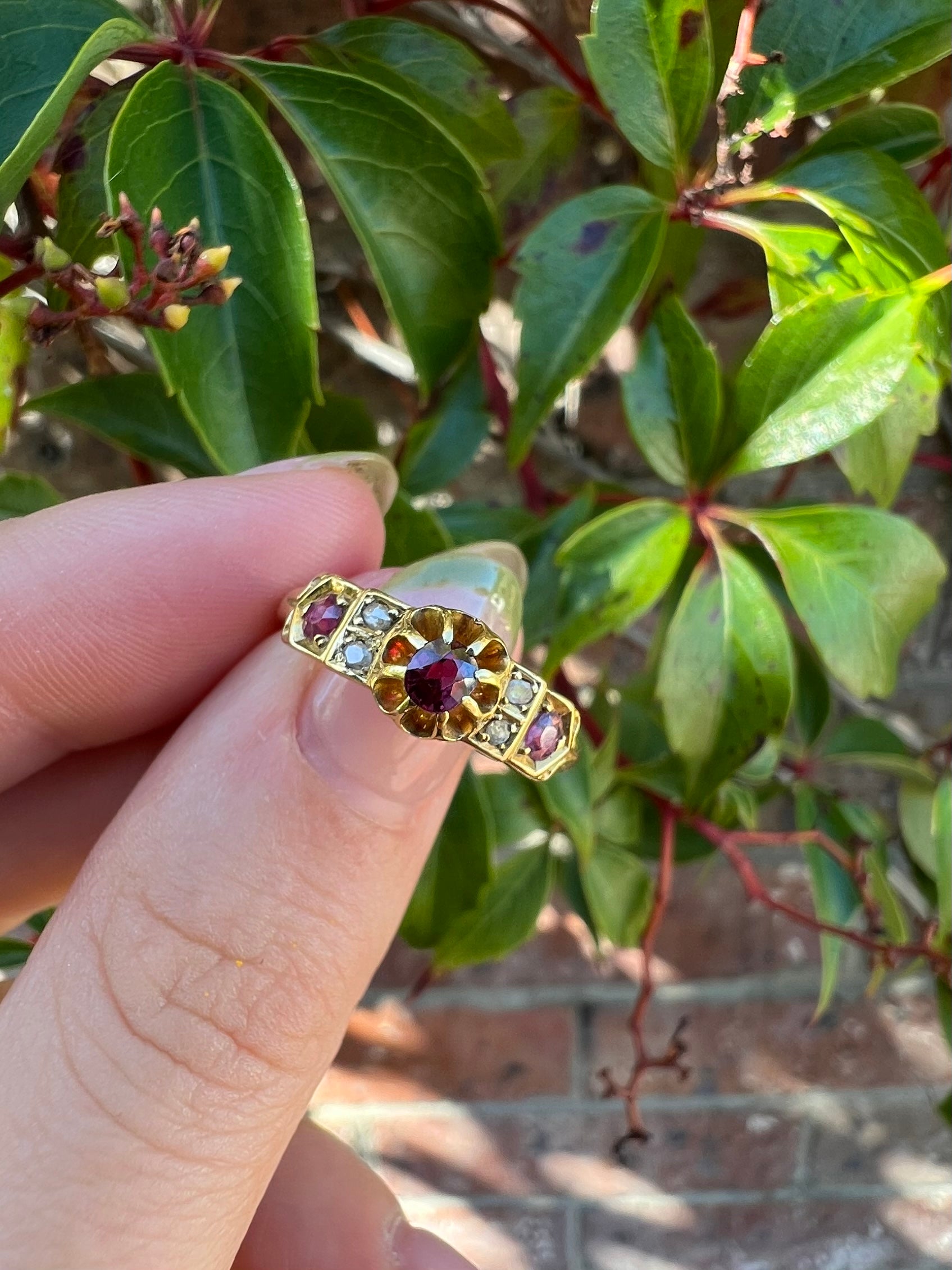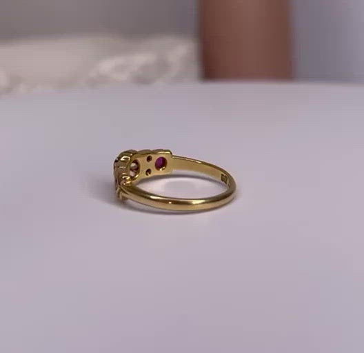 This unique ring is a beautiful example of jewellery made in the Edwardian era. It was made in 1907 and is hallmarked for Birmingham. It has the markers mark T.H to the interior and is set in 18ct gold. The Rubies are a lovely deep natural colour and the shank and setting is in excellent condition. The small video shows the clarity of the hallmarks and the exceptional quality of this lovely piece.