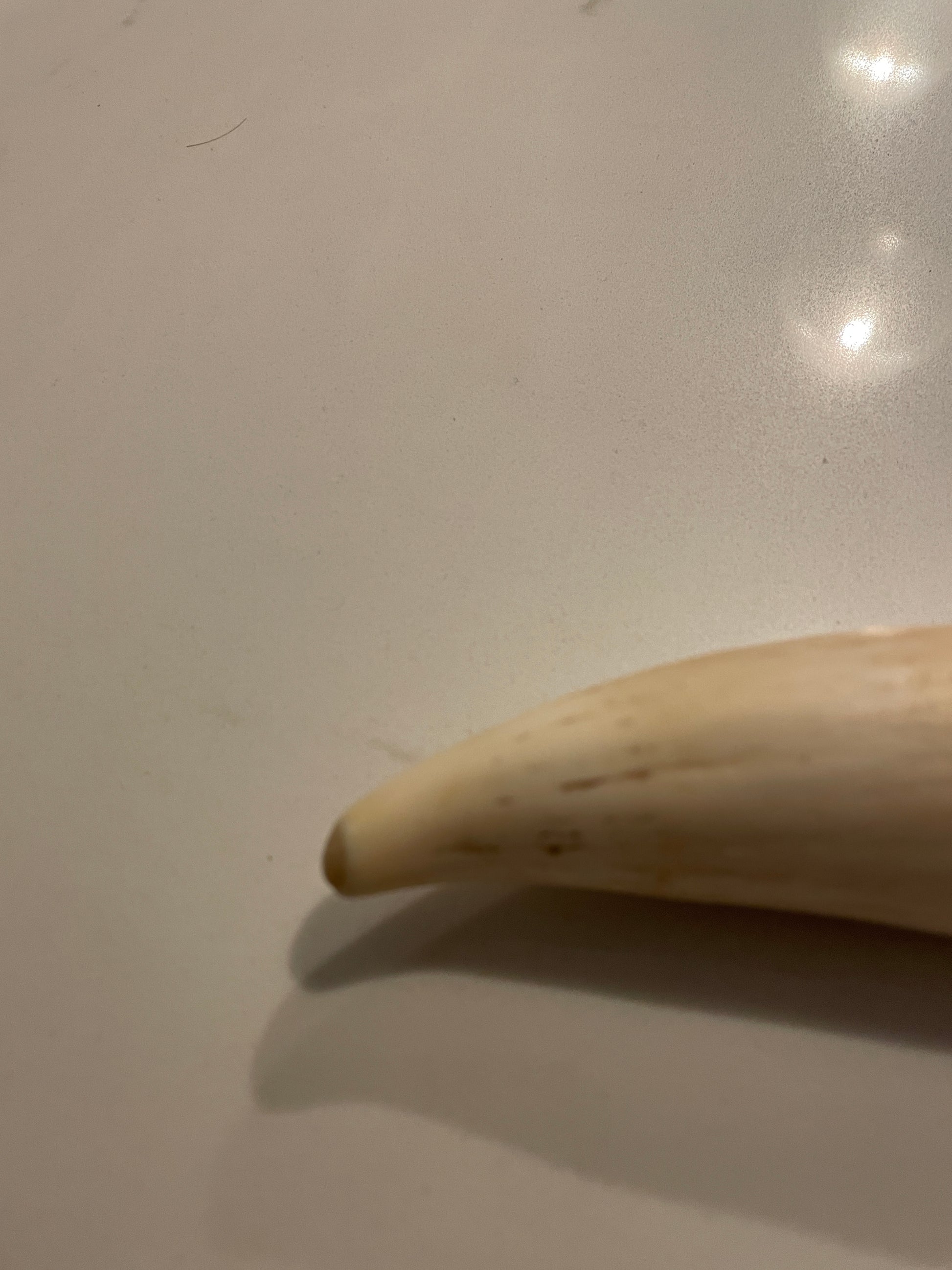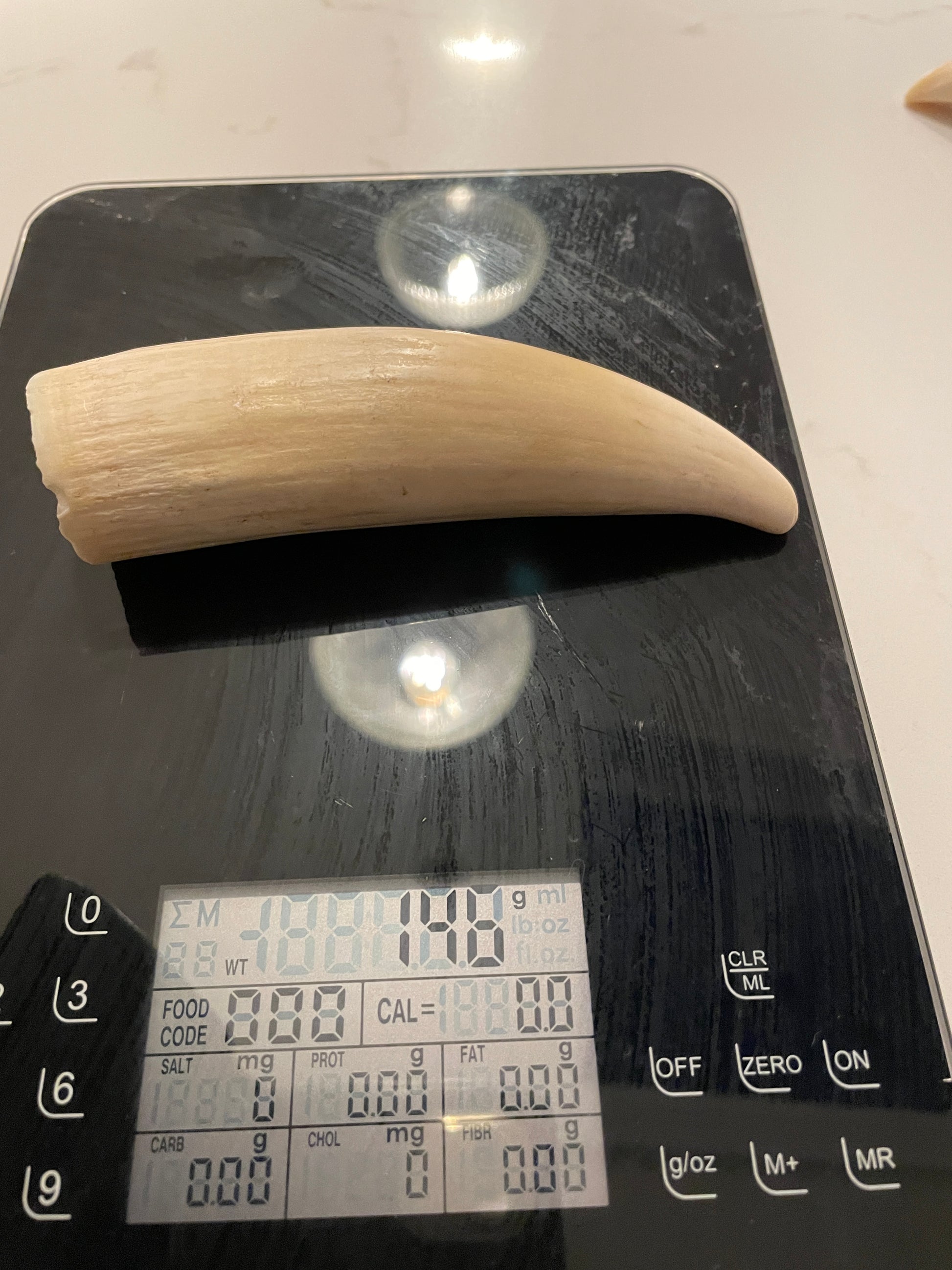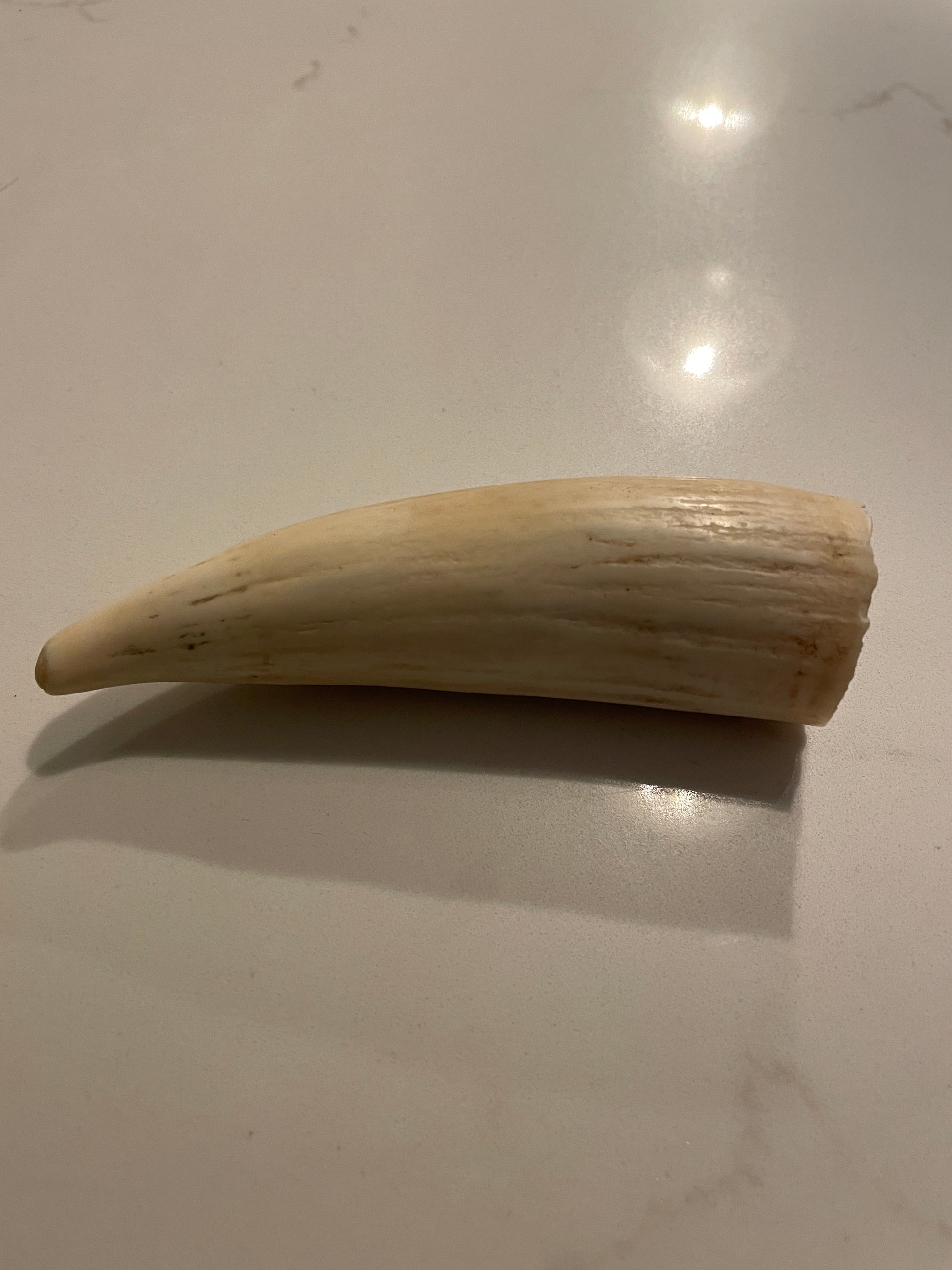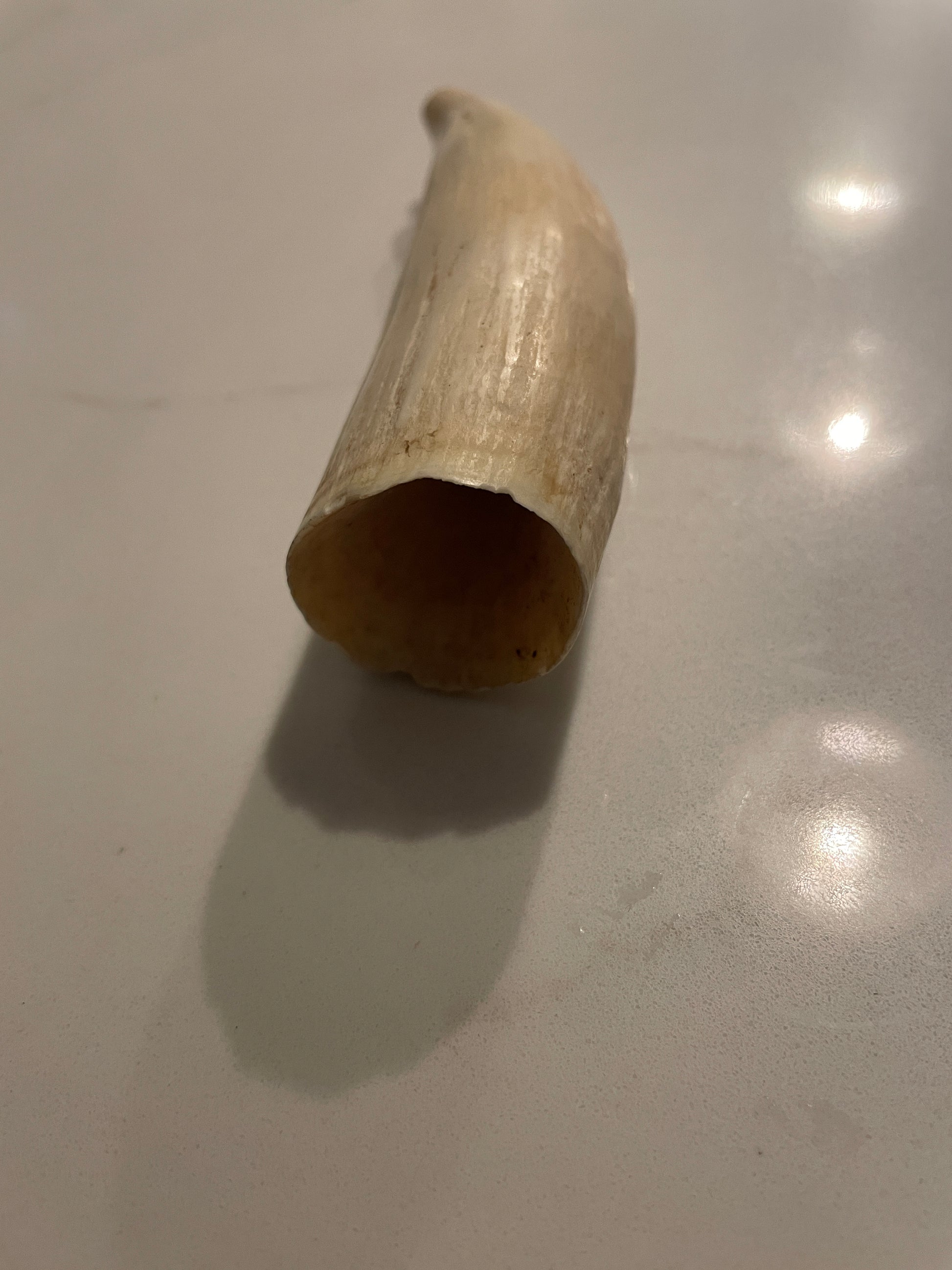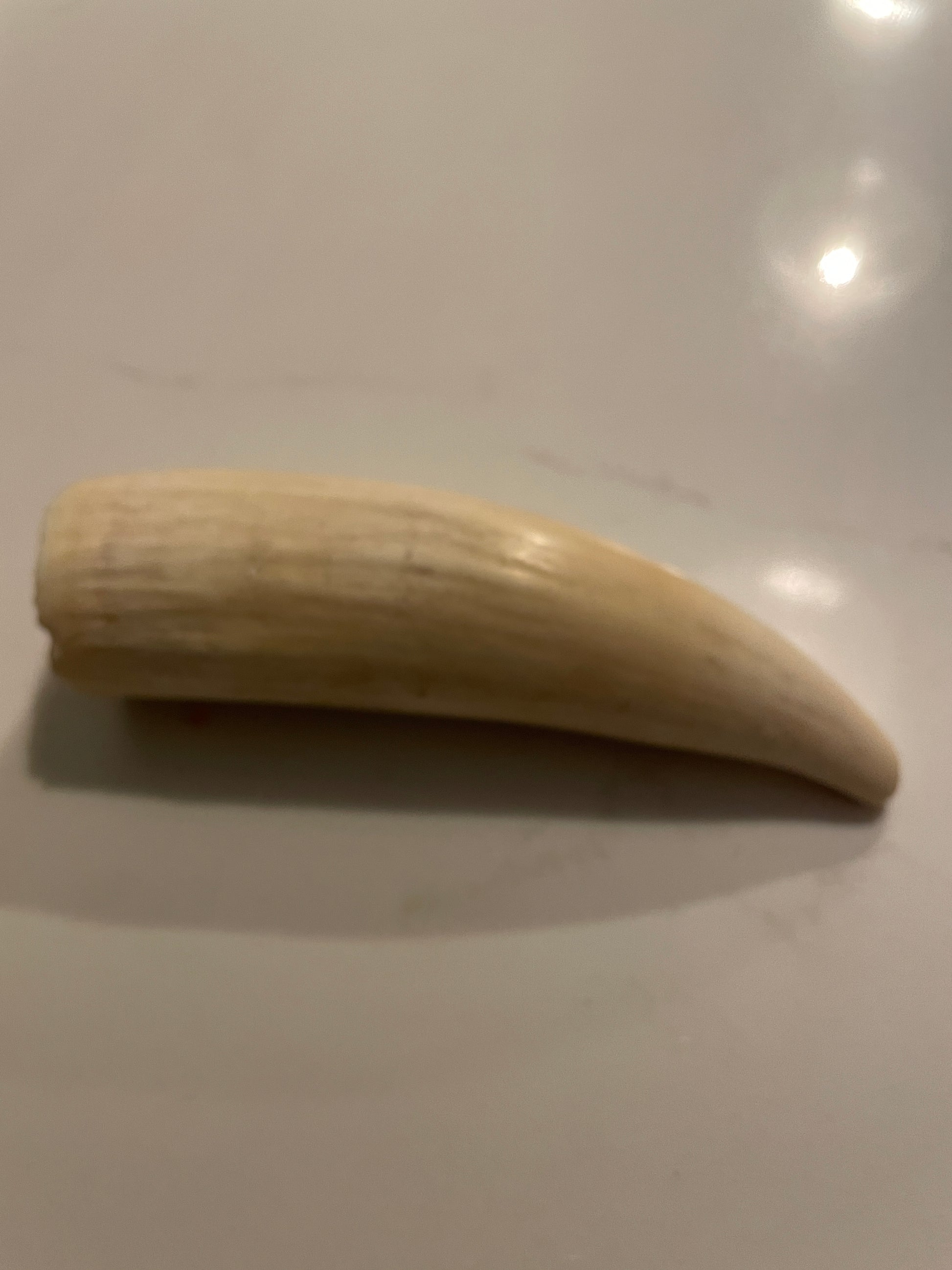 Sperm whale tooth that requires polishing. Approximately 13cm long and 4cm wide at widest point, rounded surface. 146g Hollow inside 2.5cm depth.
