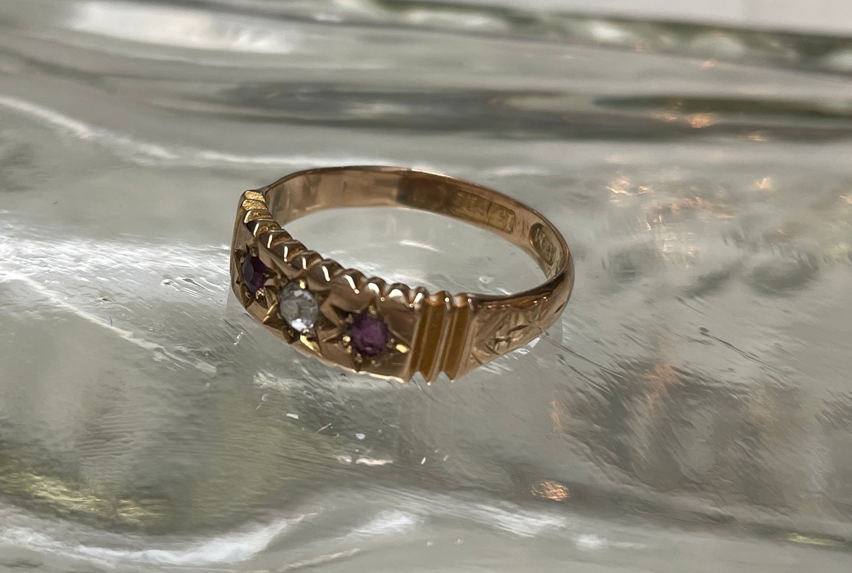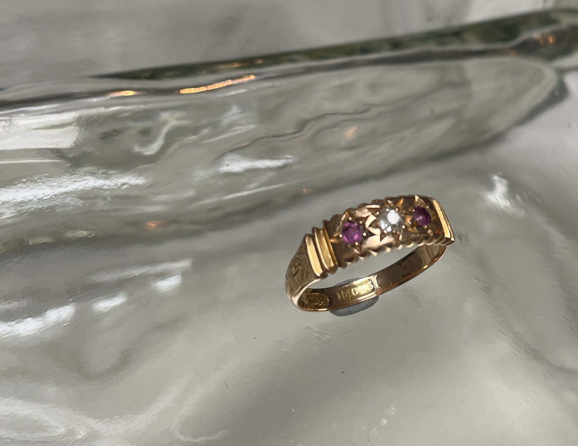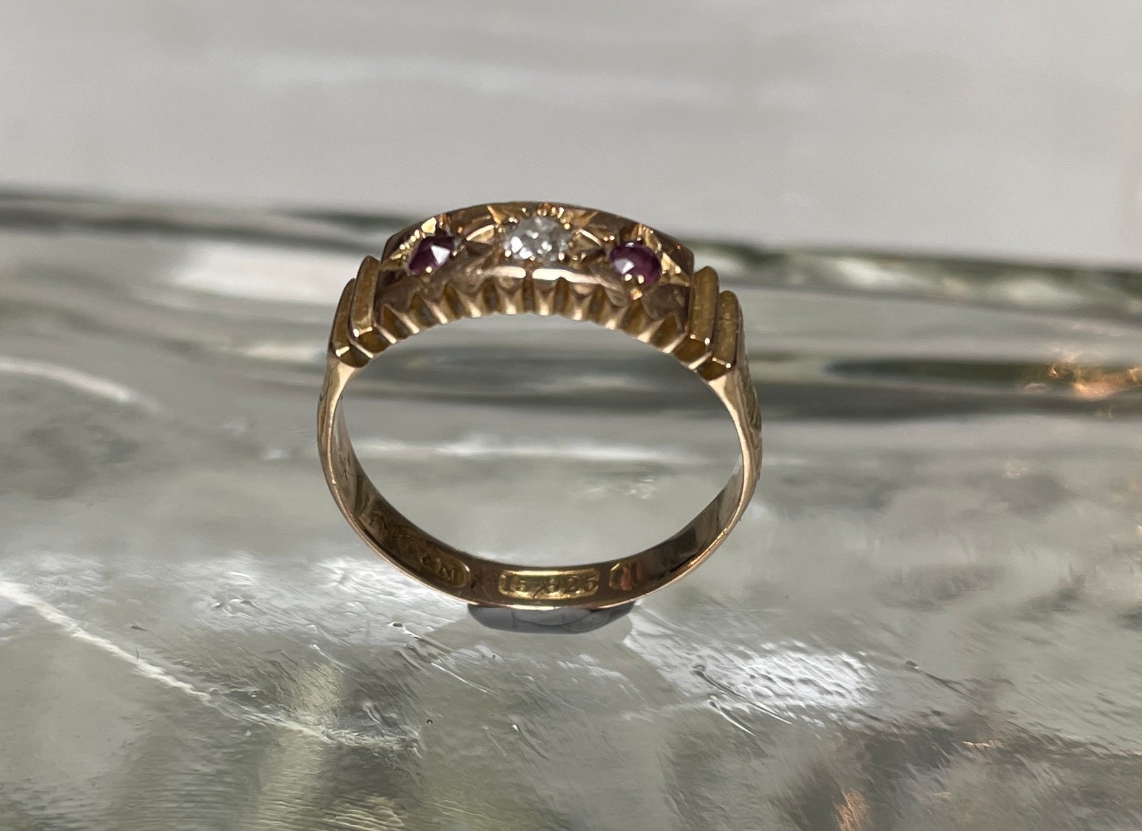 Edwardian three stone band ring cast in 15ct gold. Lovely old cut diamond flanked by two rubies. Maker mark A & M.