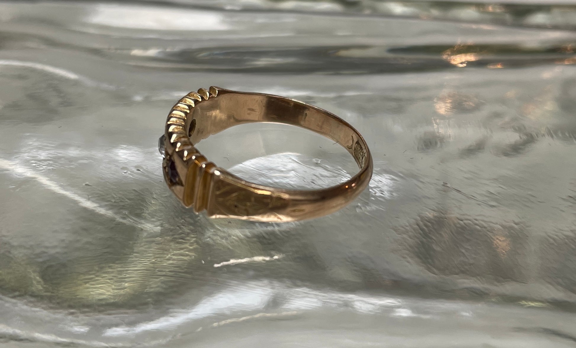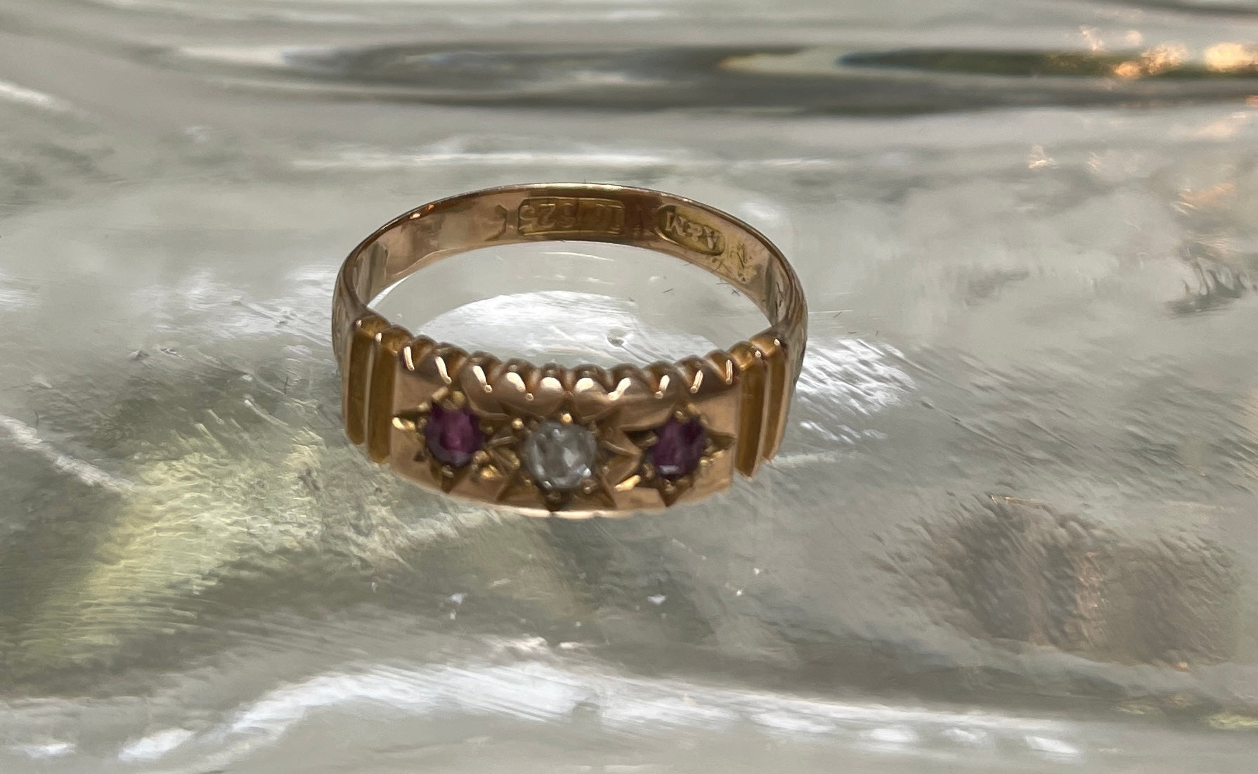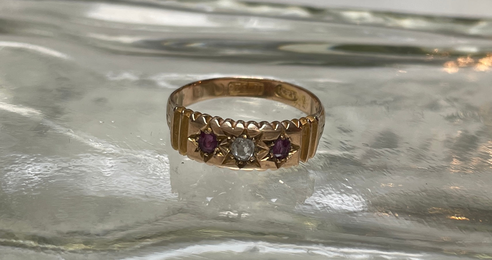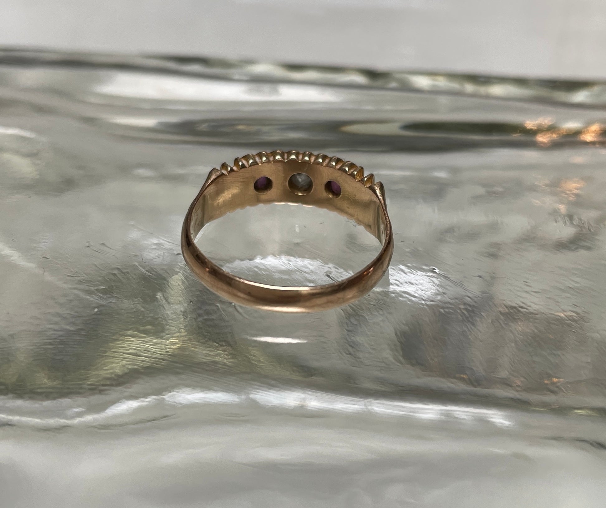 Edwardian three stone band ring cast in 15ct gold. Lovely old cut diamond flanked by two rubies. Maker mark A & M.