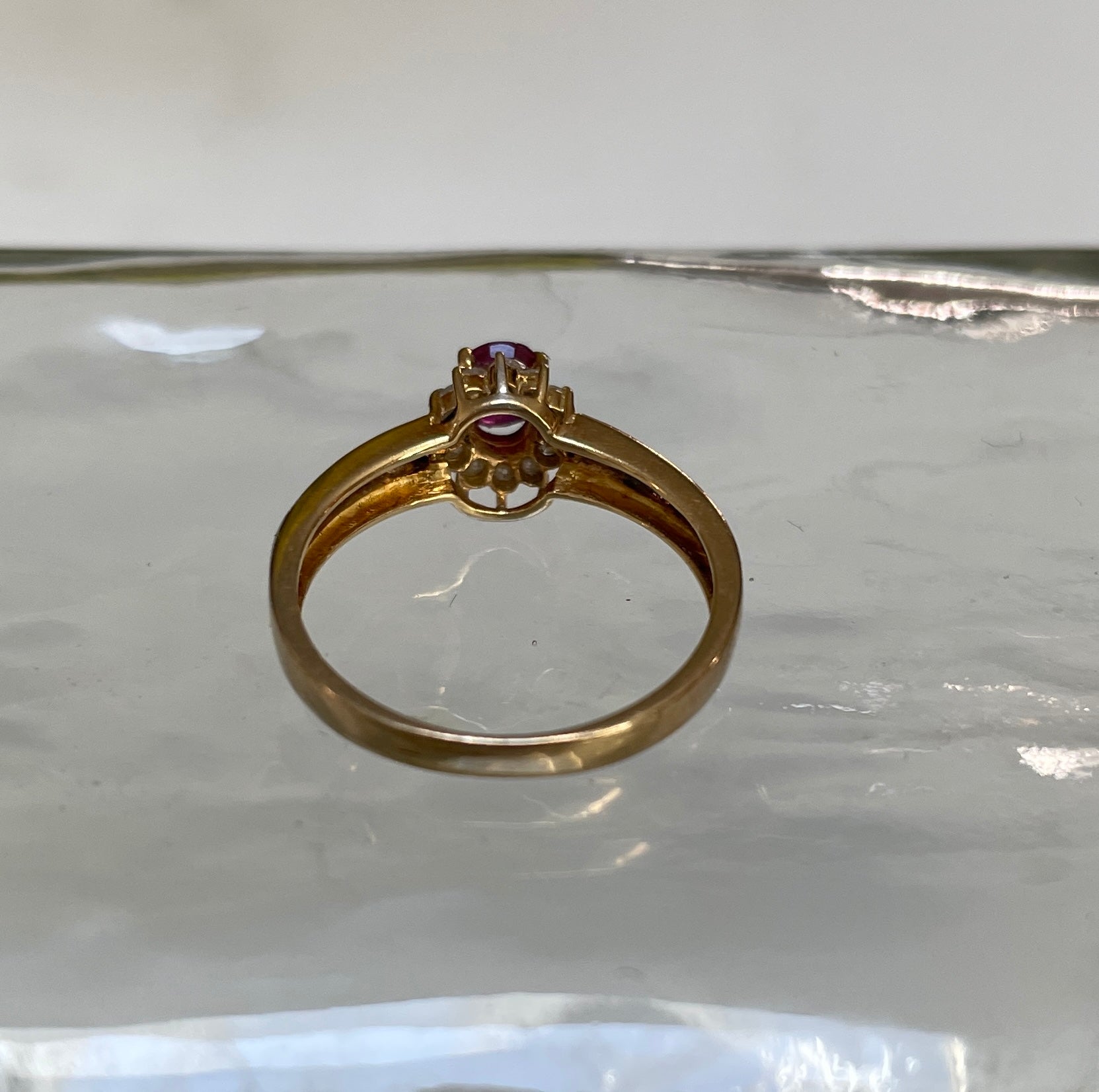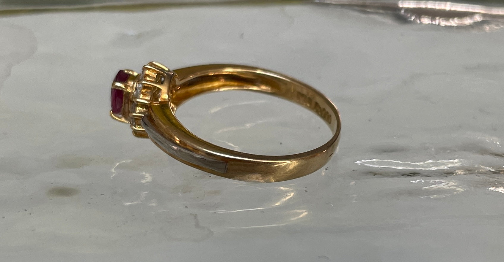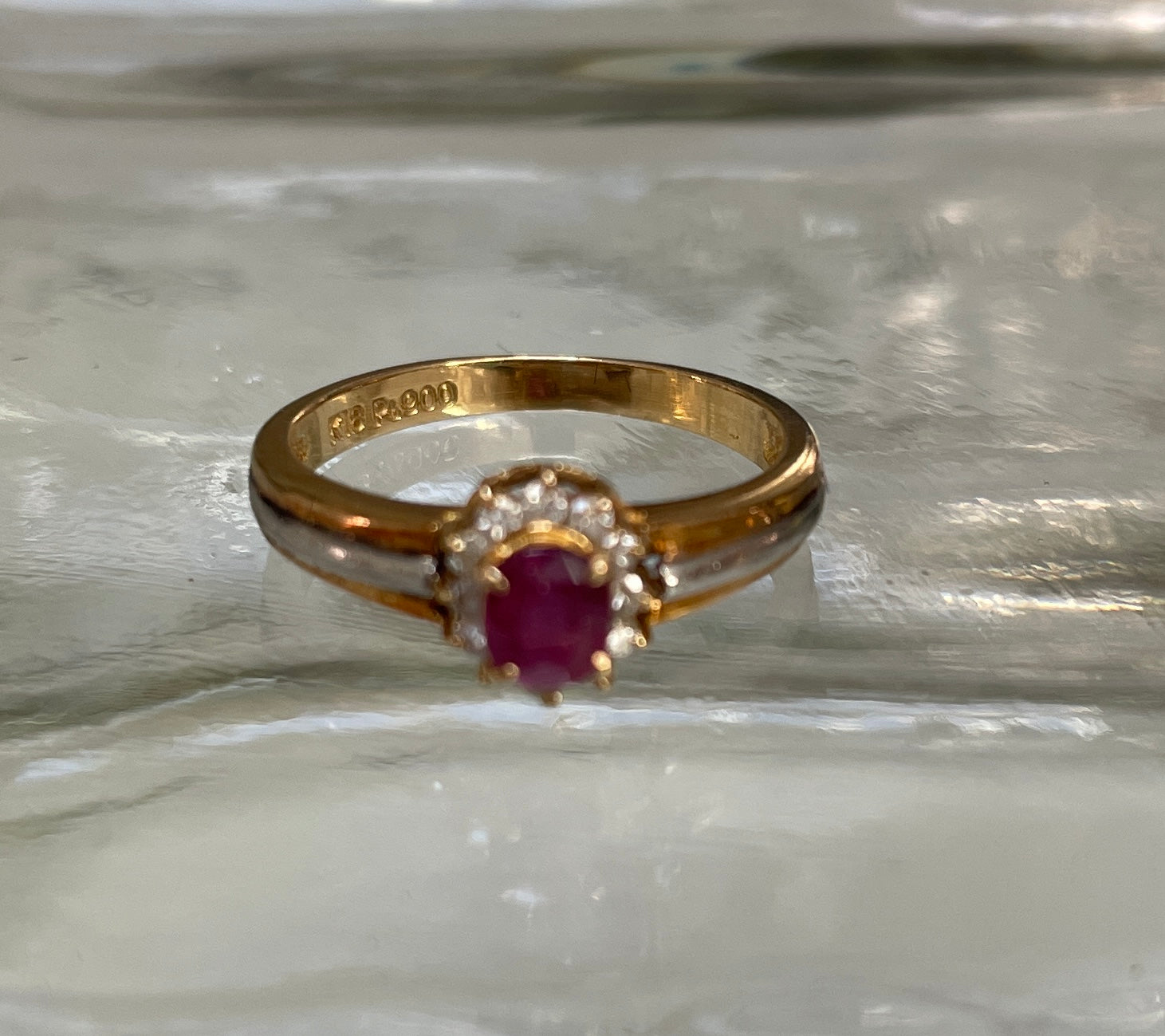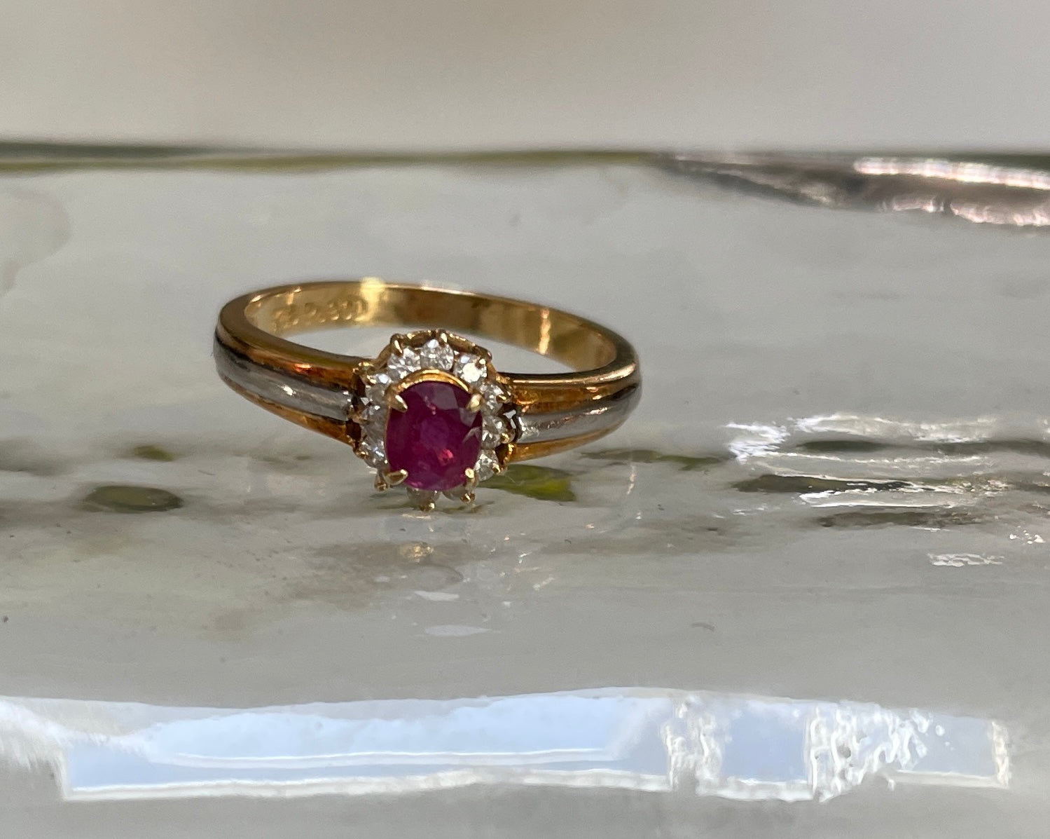 Petite ruby and diamond ring in 18ct gold. Contrasting platinum shoulder strip. Perfect 18th or 21st birthday gift.