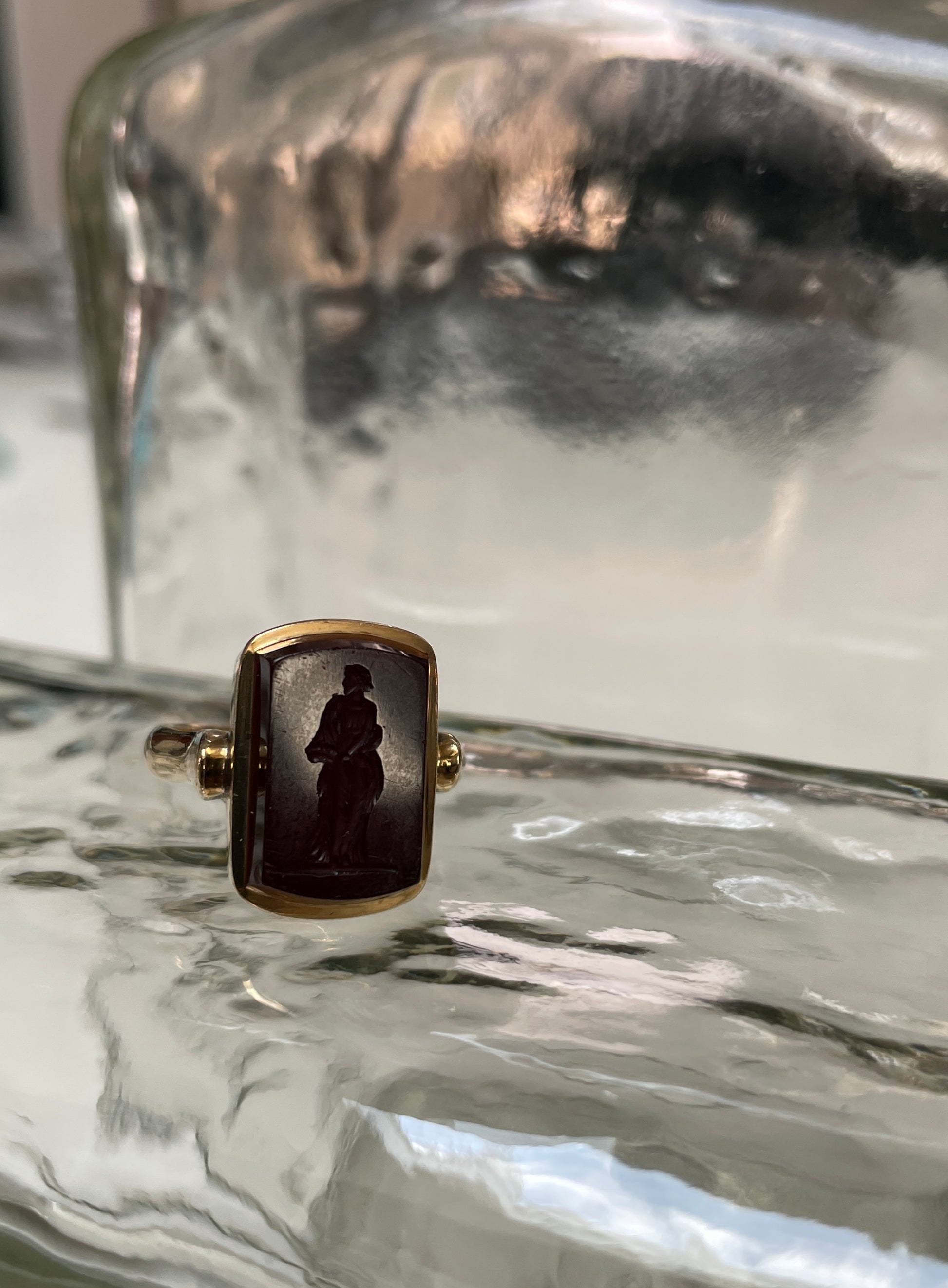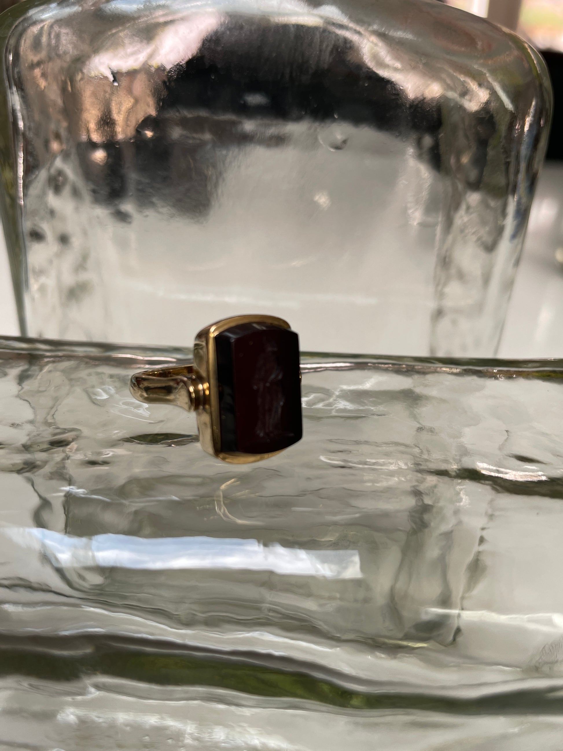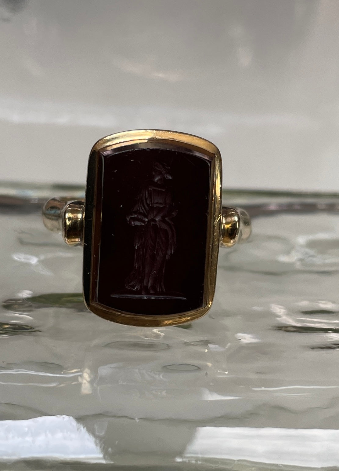 Classic 1930s 9ct gold cut glass ntaglio ring depicting a lady in robes.
