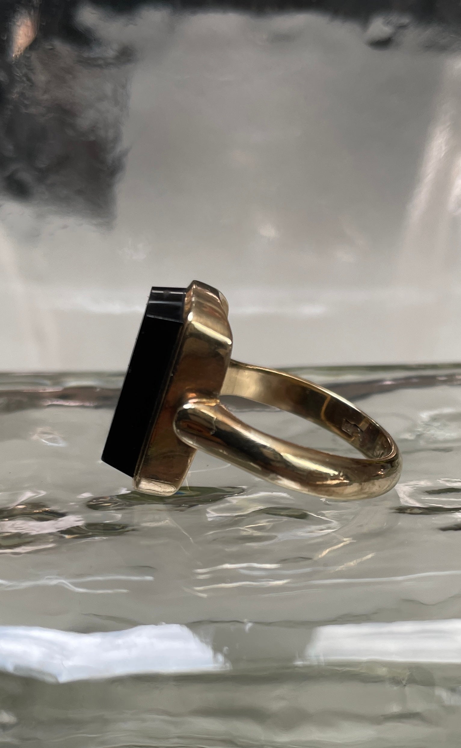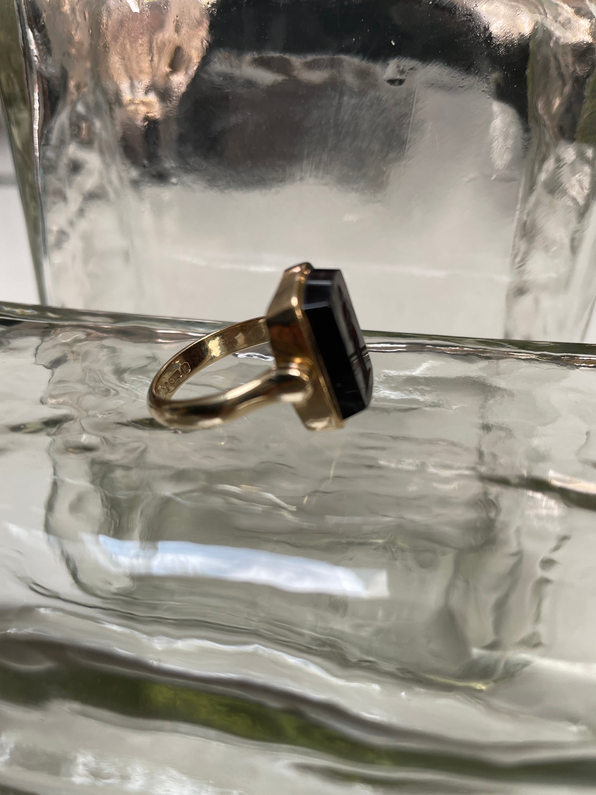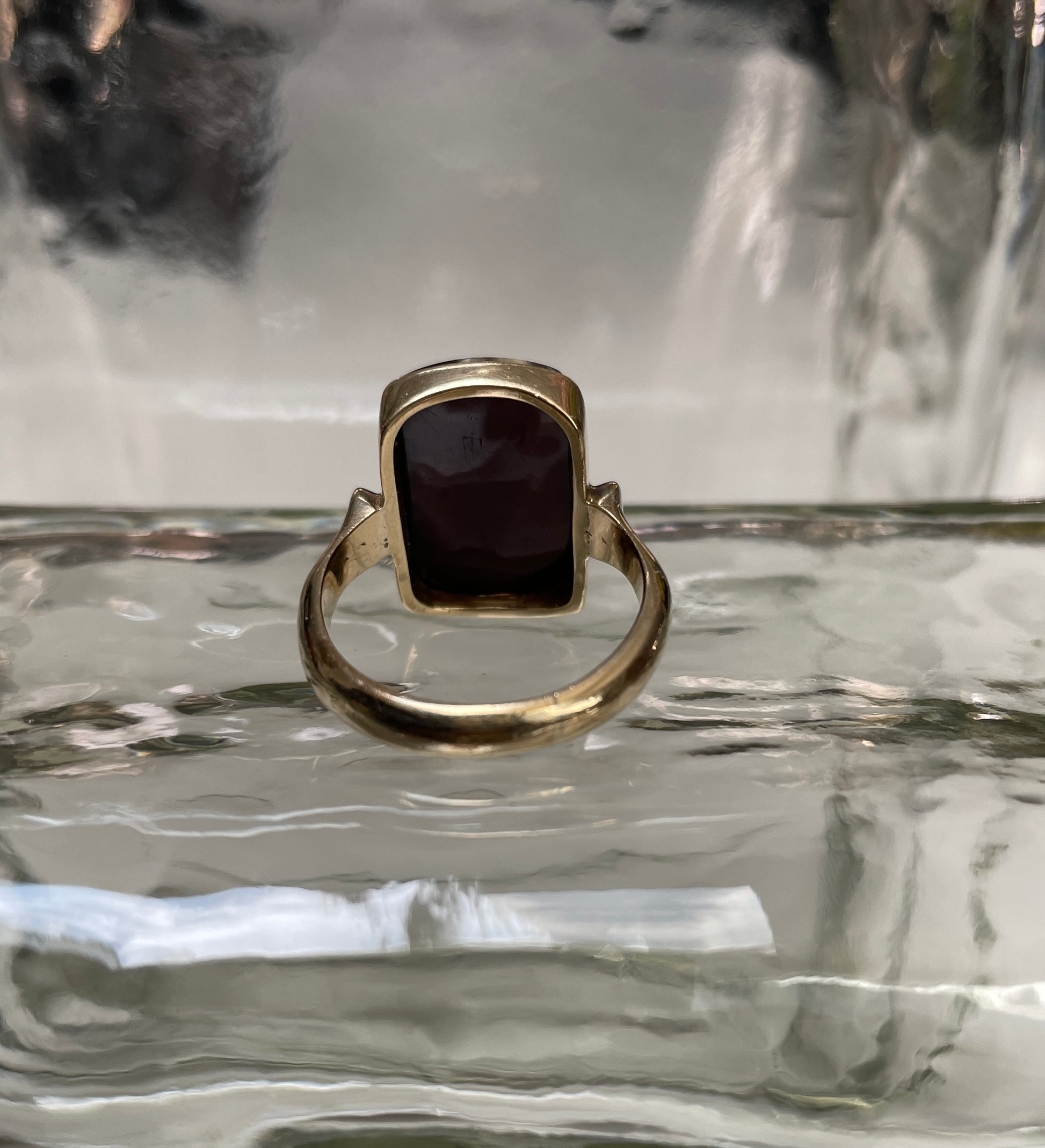 Classic 1930s 9ct gold cut glass ntaglio ring depicting a lady in robes.