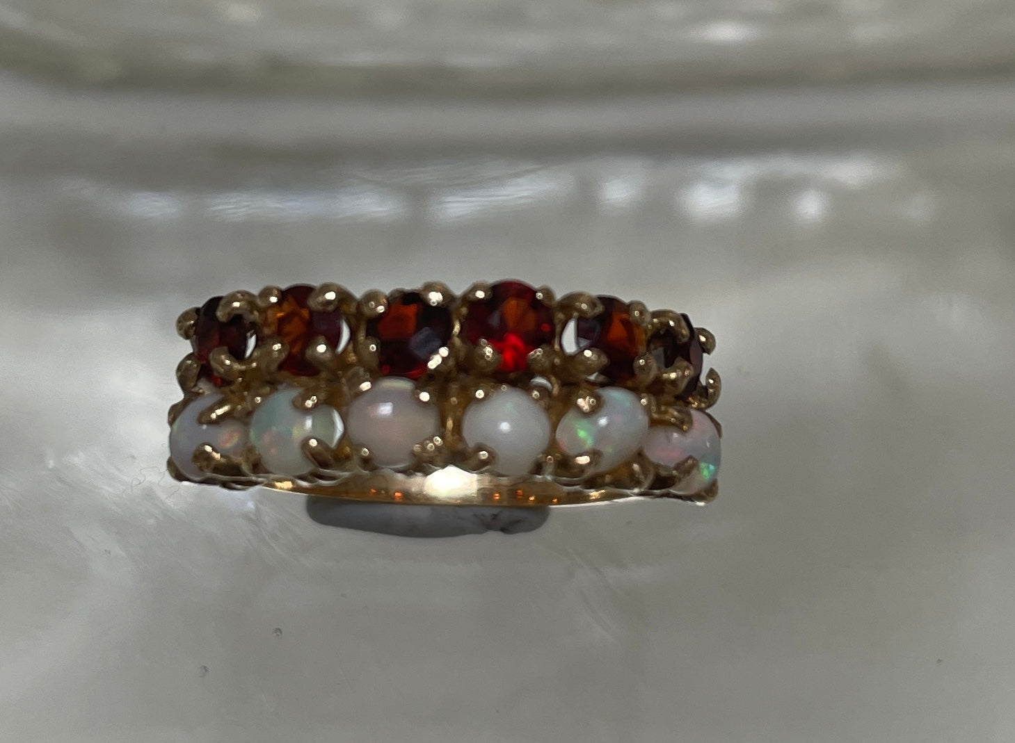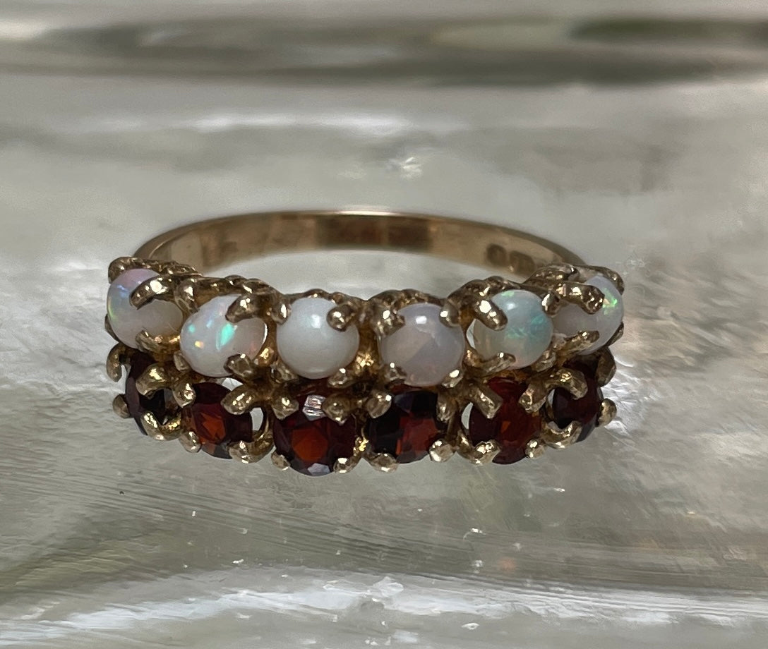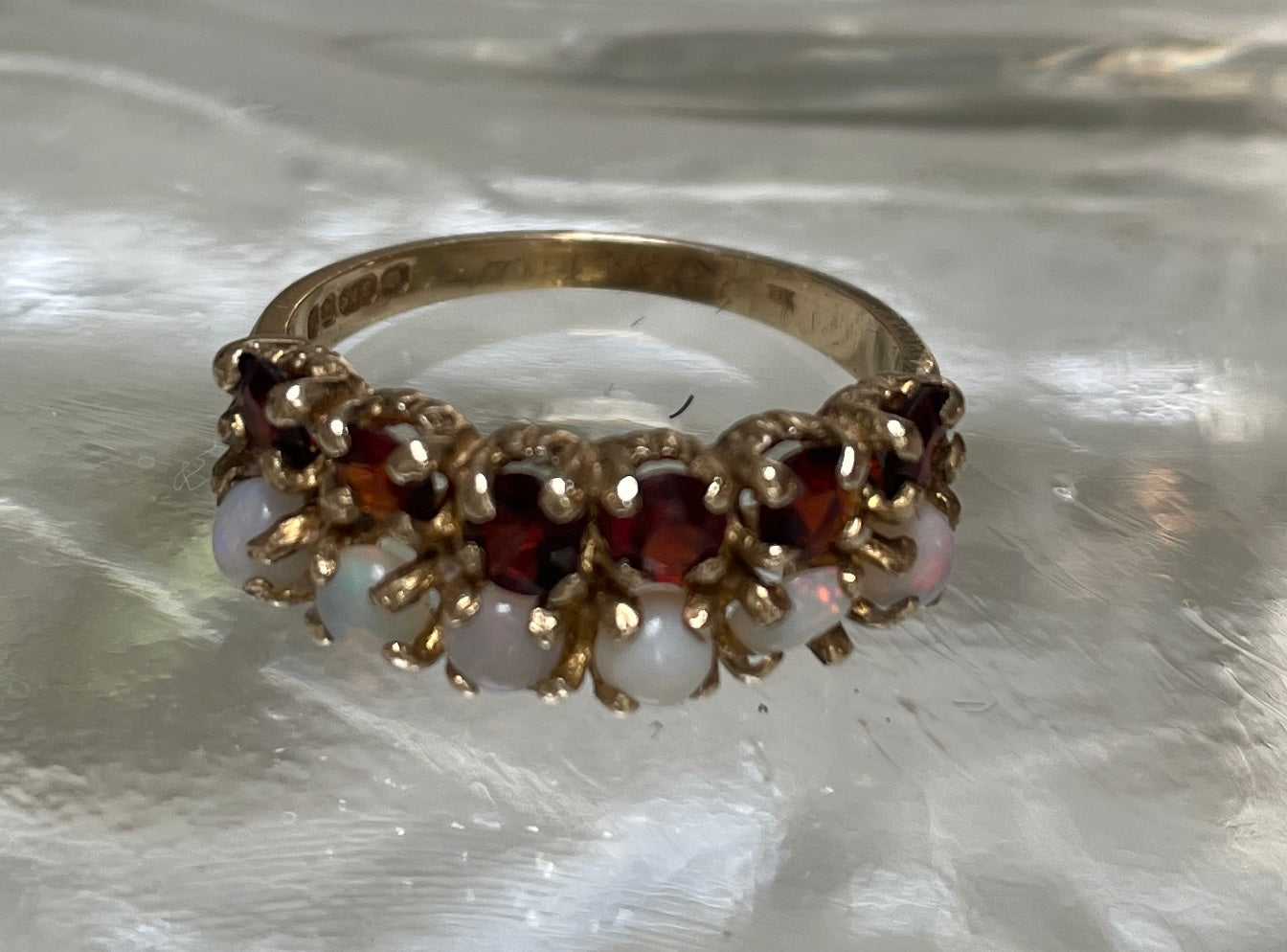 Beautiful ring featuring two rows of 6 opals and 6 garnets. Cast in 9ct gold it is hallmarked for London 1979