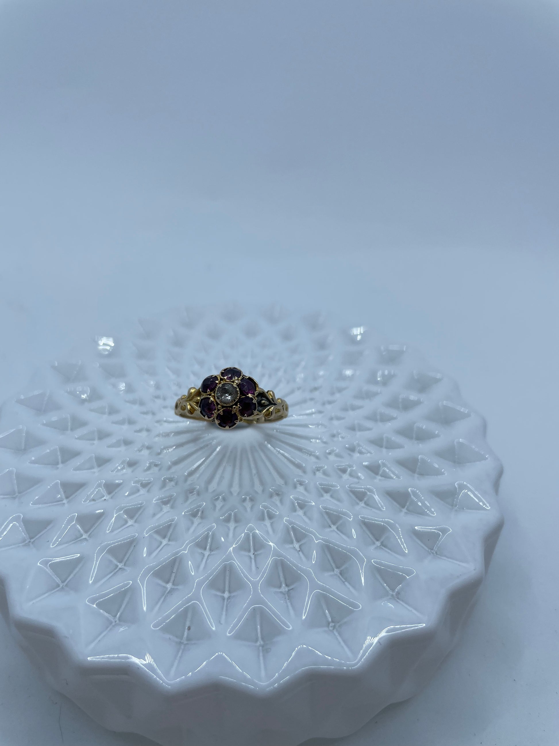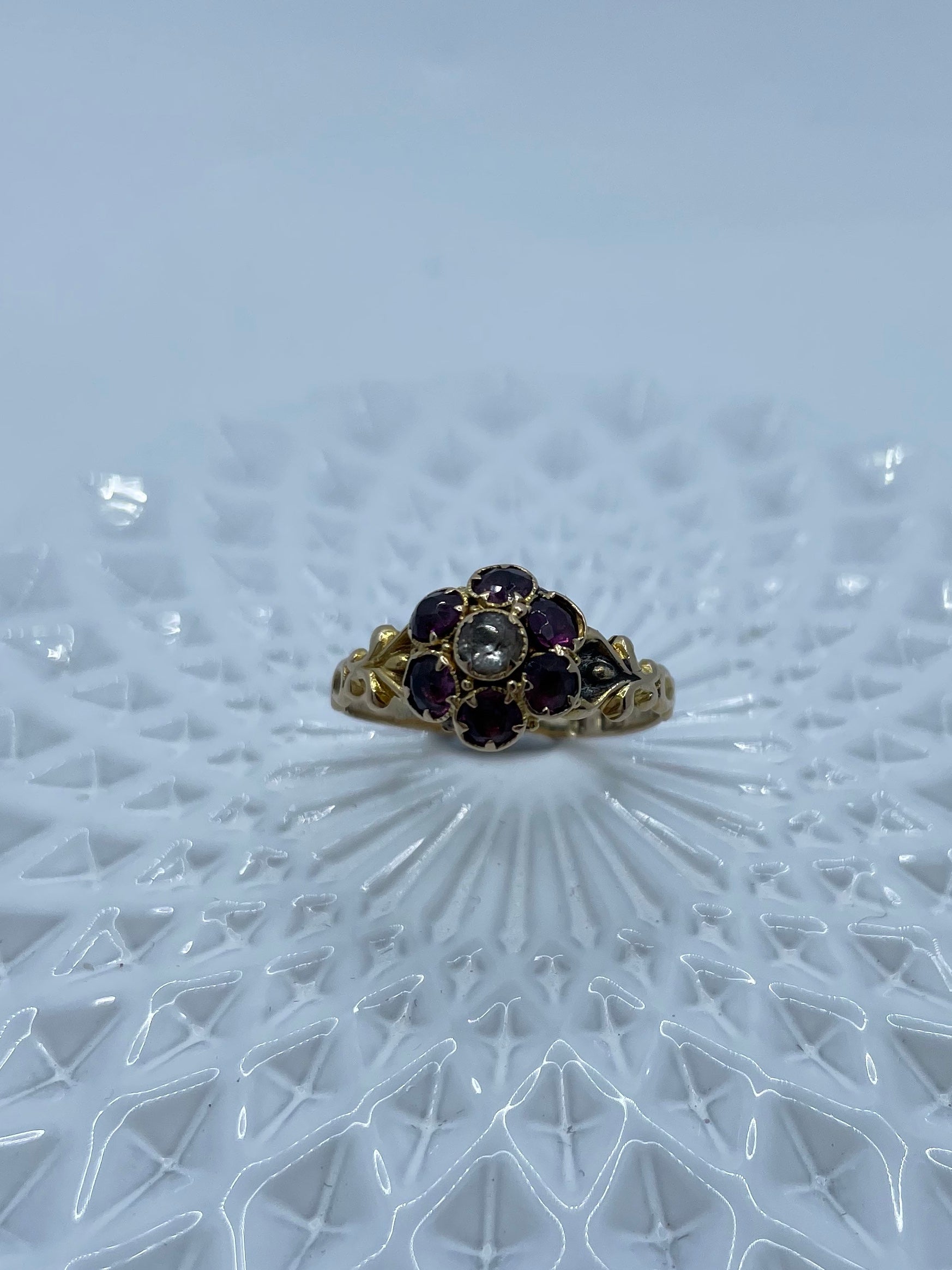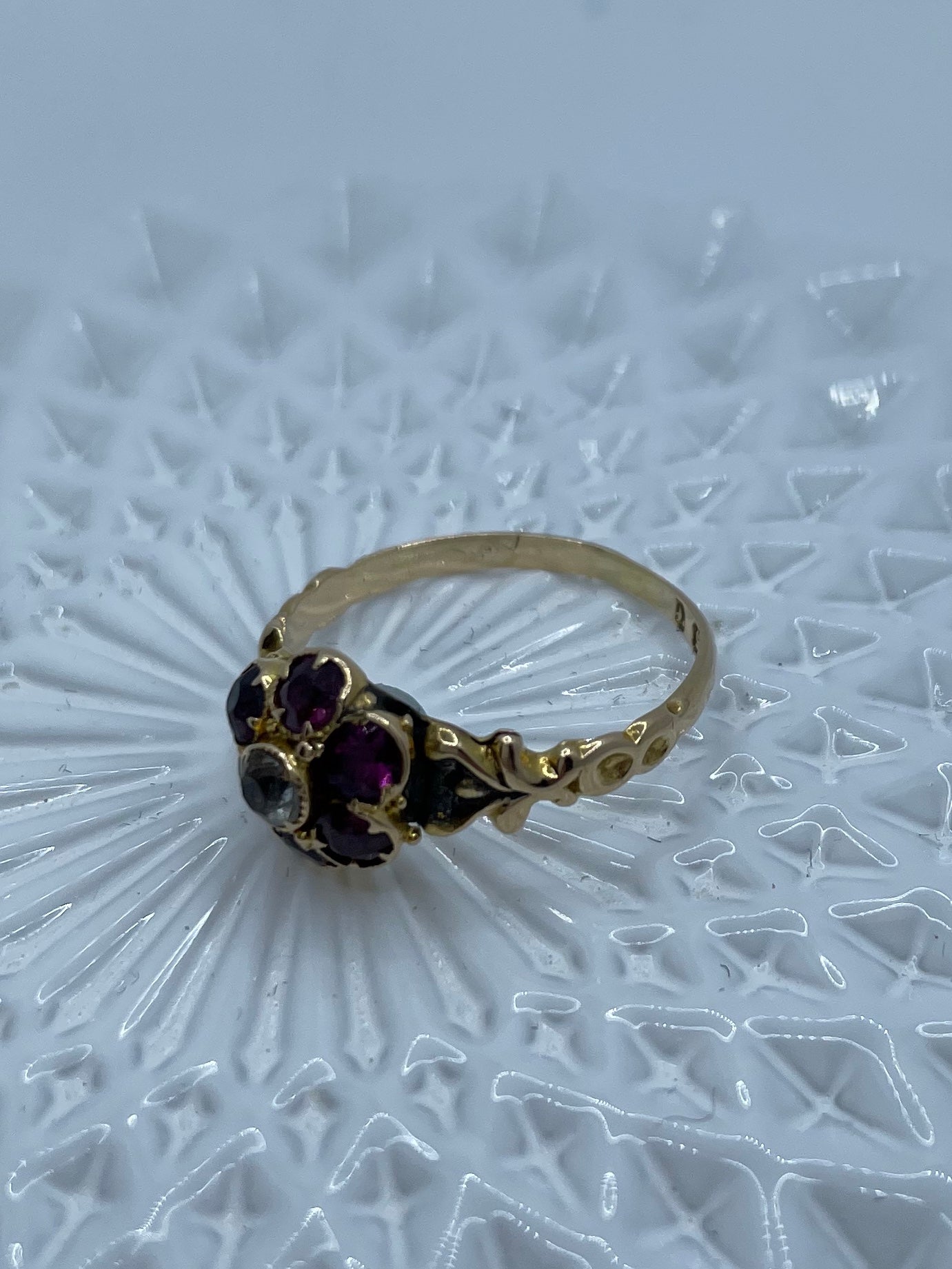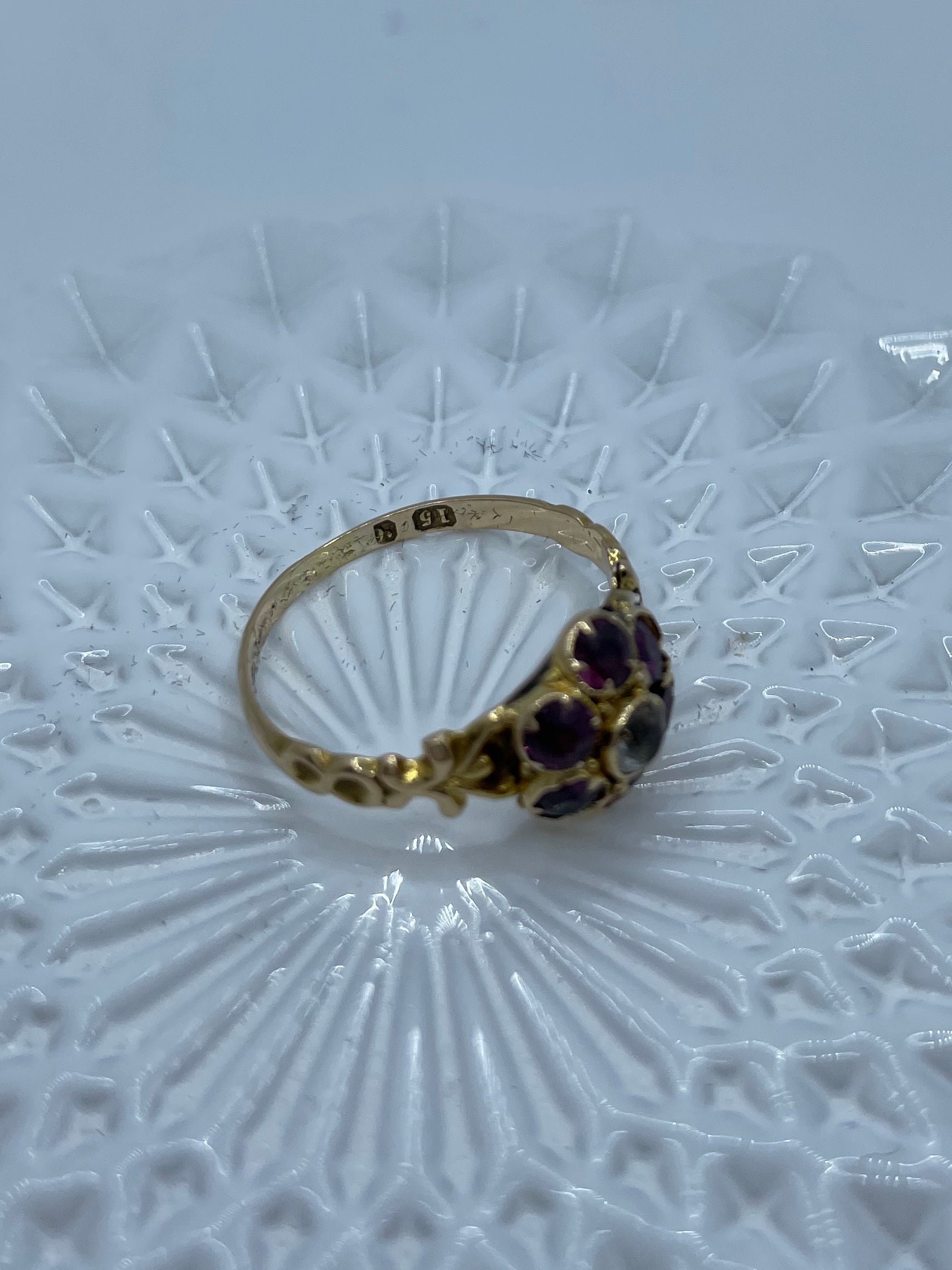 Delicate early 20th century, 15ct gold garnet and colourless paste flower ring. Small ring perfect for the pinky. These beautiful cluster rings were popular in both the Victorian and Edwardian eras and were often given as gifts to signify love or friendship. Still a perfect gift today for someone special, maybe just a gift to yourself.