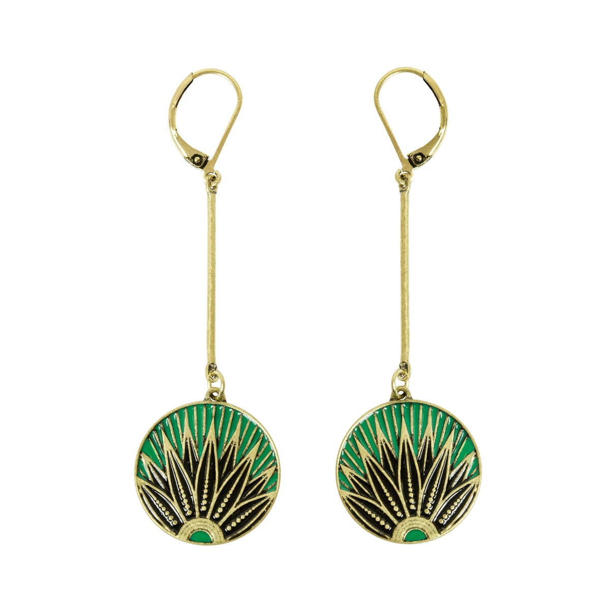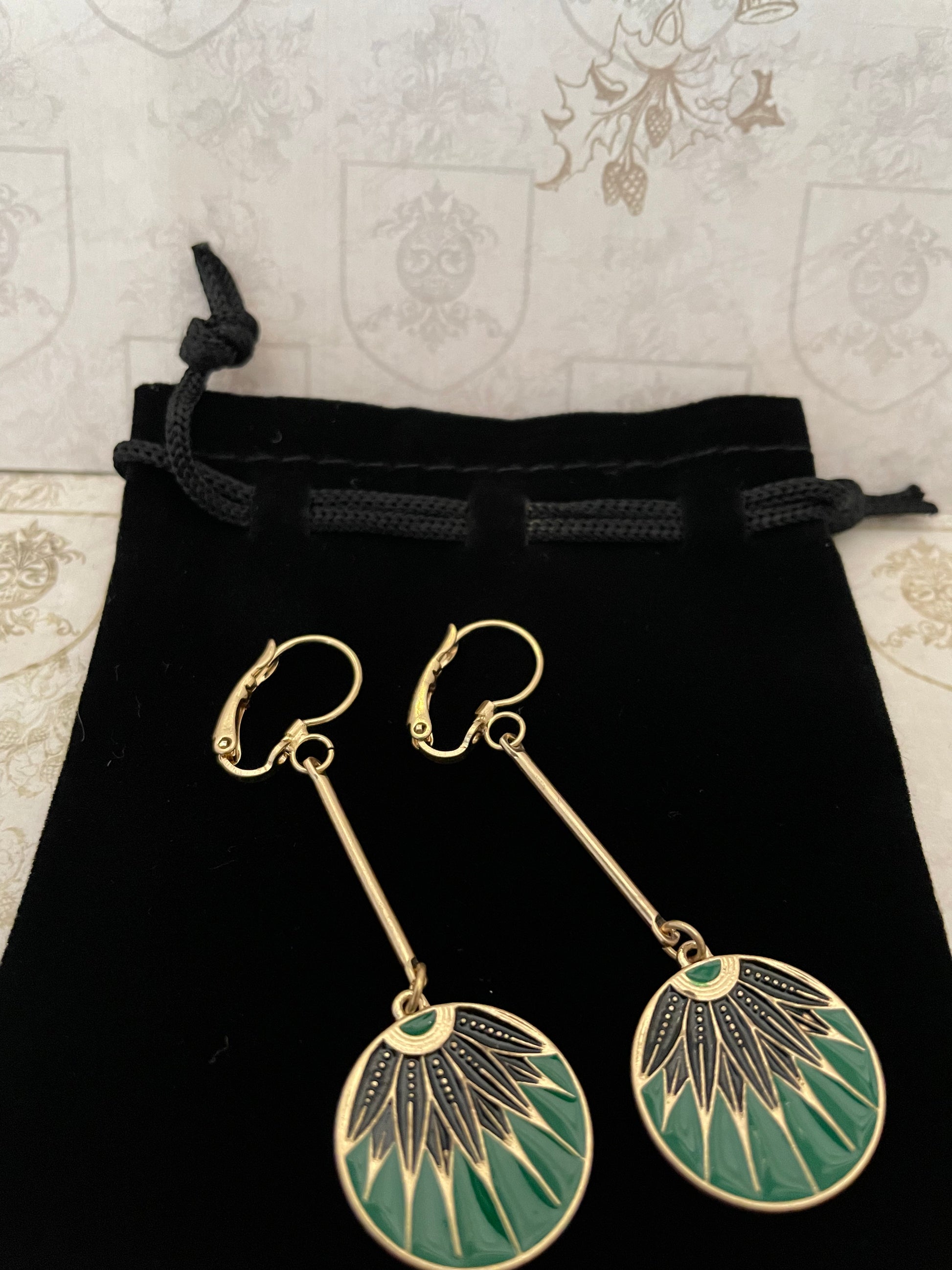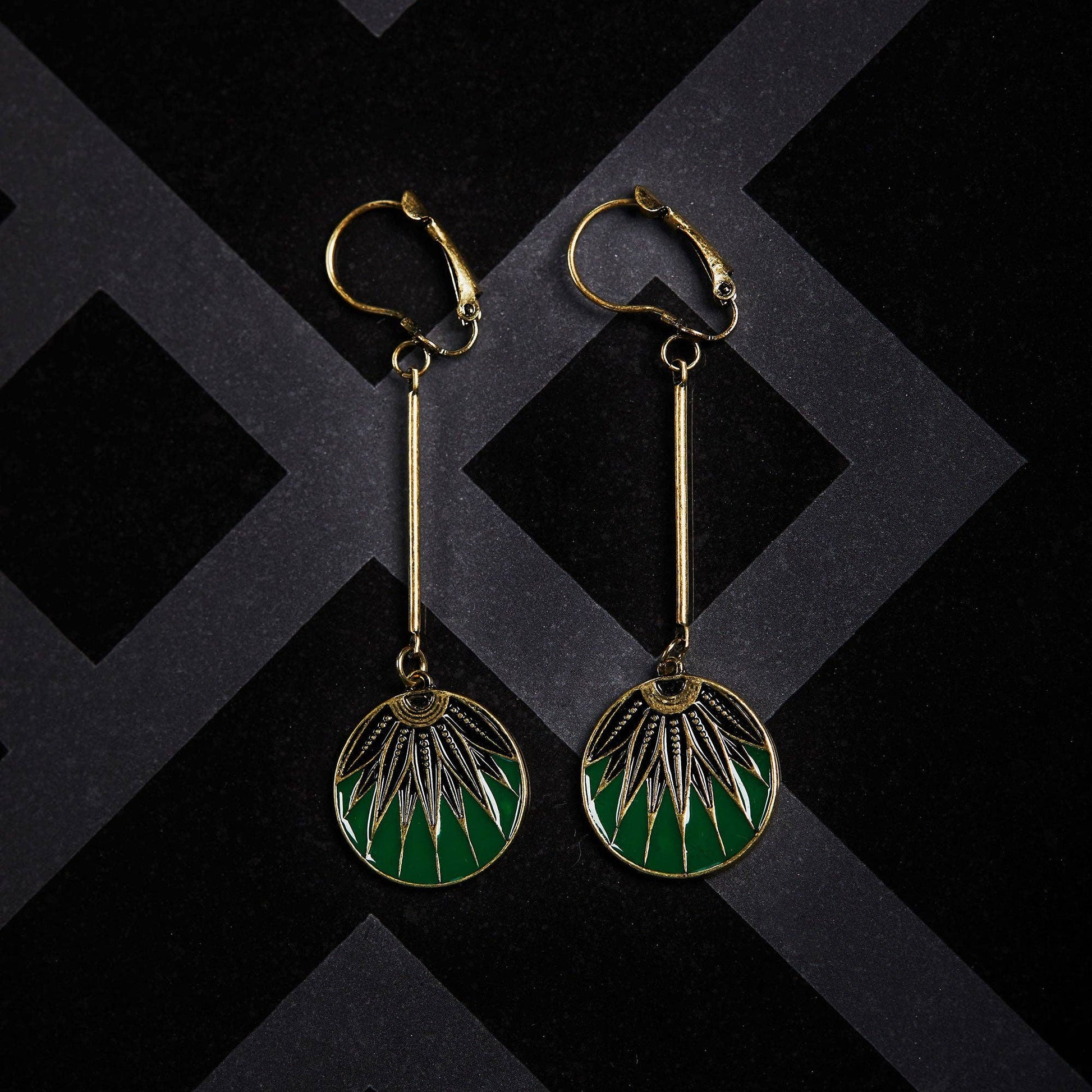 Inspired by an original 1920s compact mirror case, these Art Deco leaf design disc earrings are intricate and unique. Reminiscent of the 1920s fascination of all things Egyptian these are a real treasure to be discovered and desired.