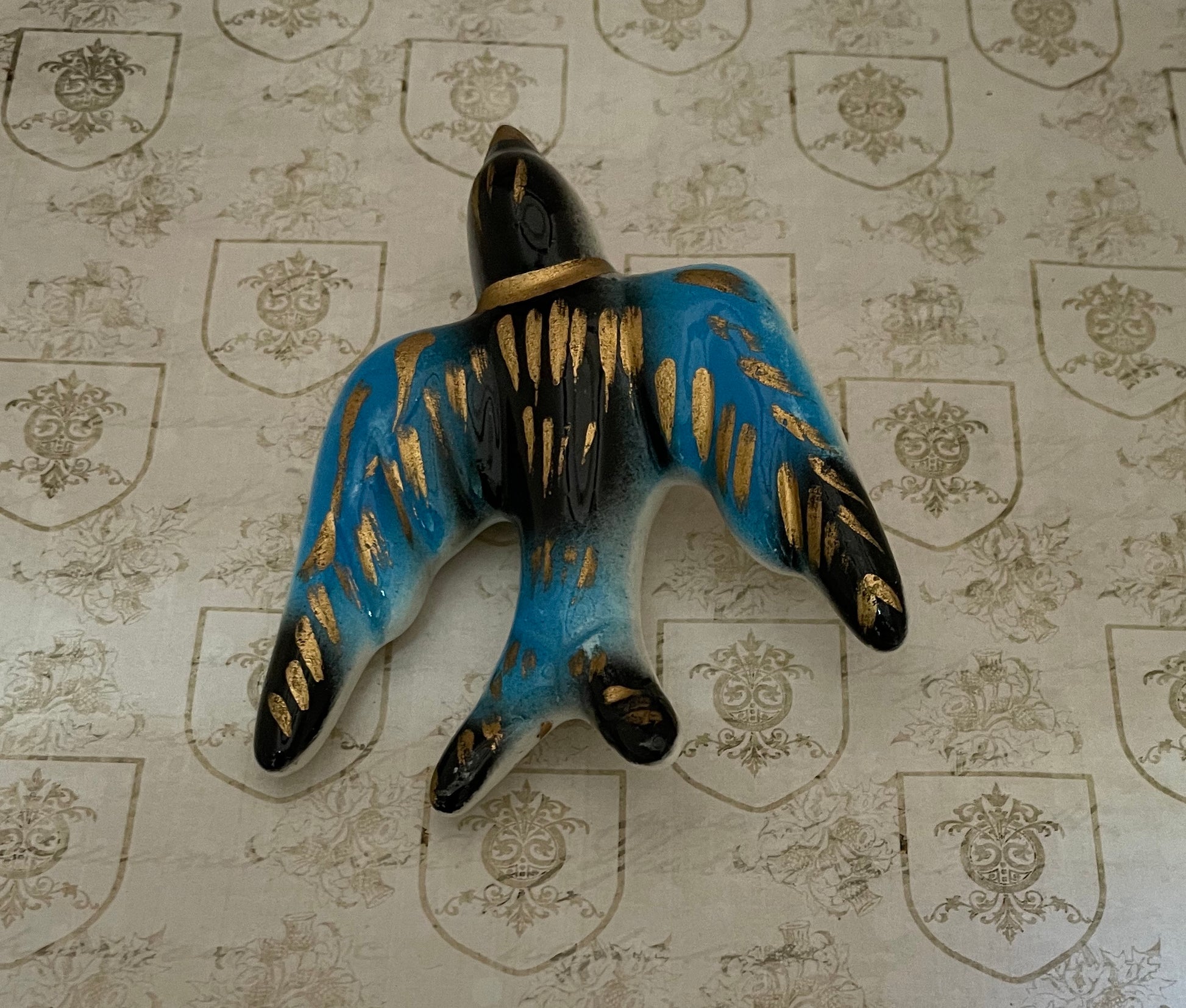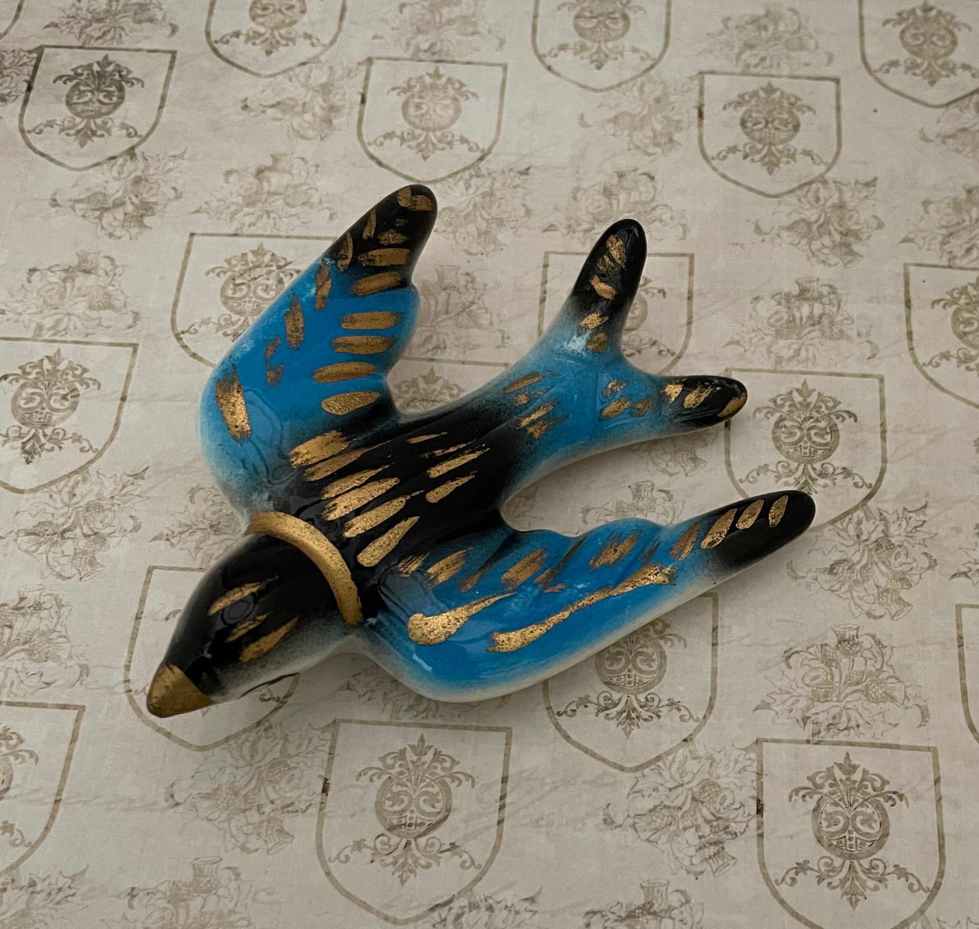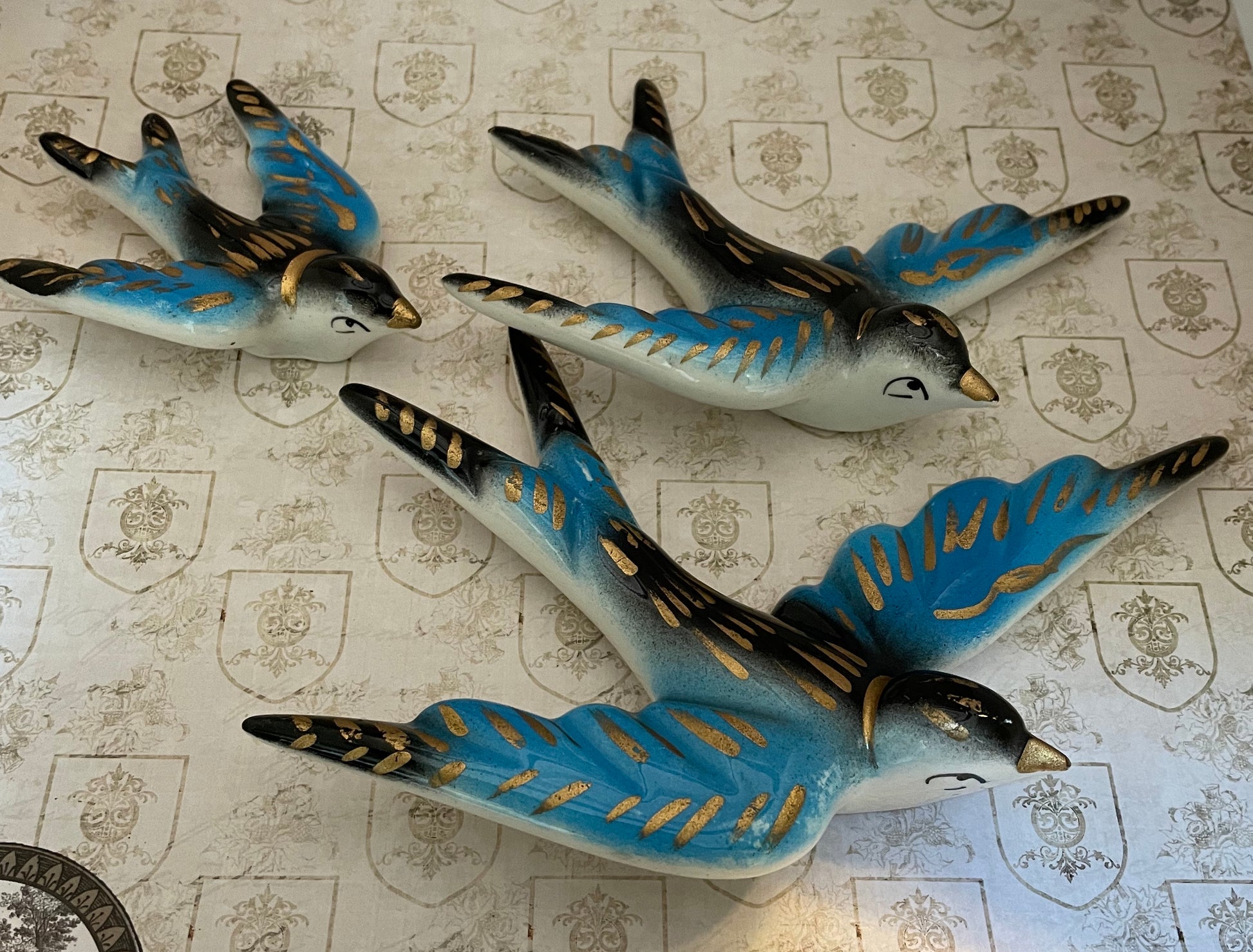 Vintage set of three 1960s graduated blue, black and gold wall swallows. Lovely condition for their age, with no breaks. There is minor crazing and mild paint loss in some areas. Please use the picture as a main part of this items description of condition. These have been released from my private collection and were purchased in the 1990s.
