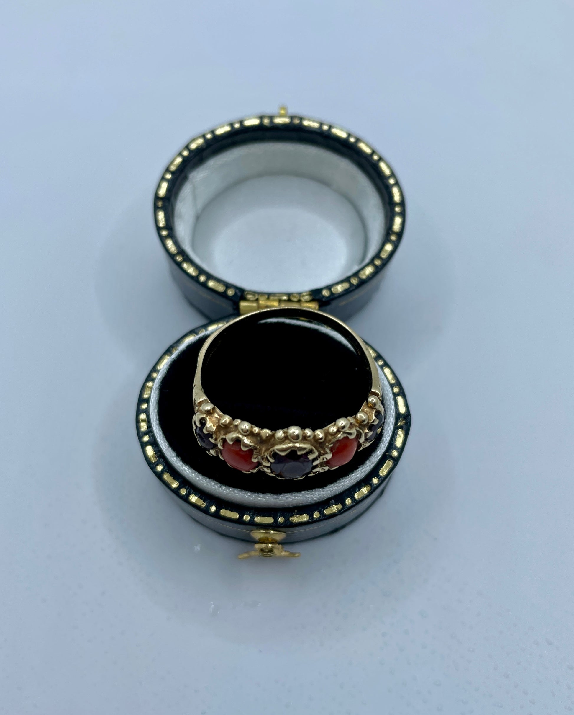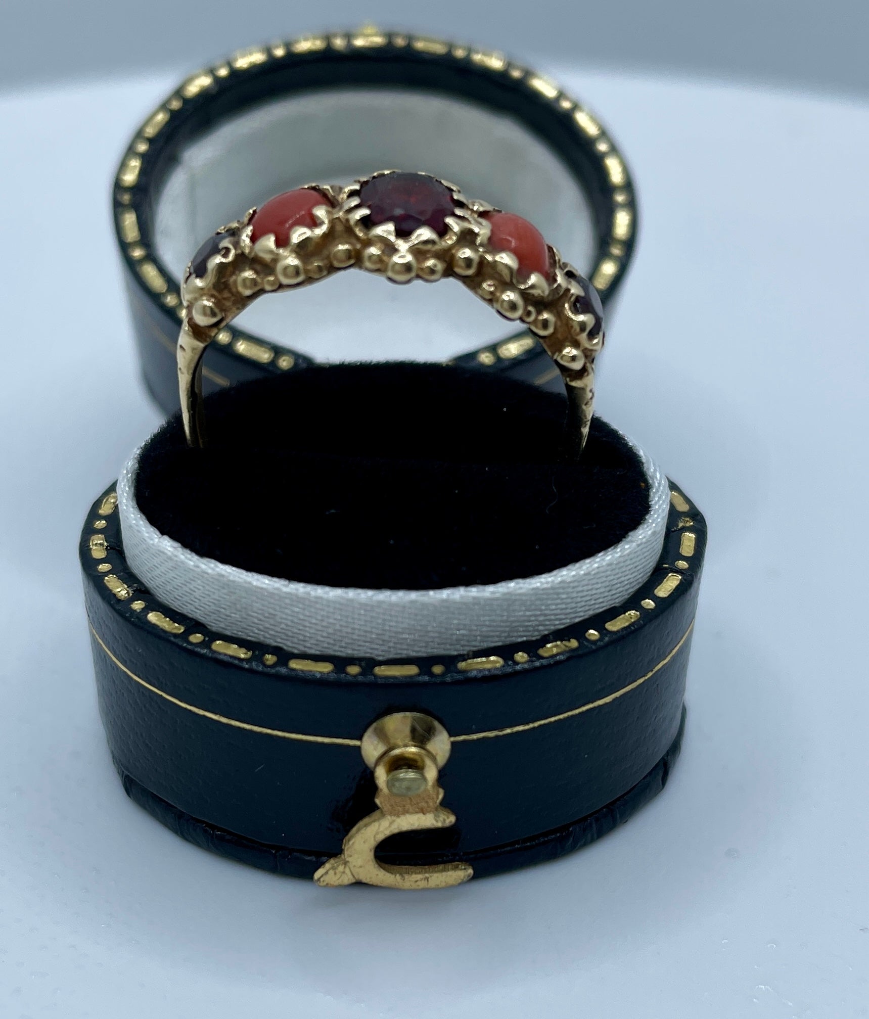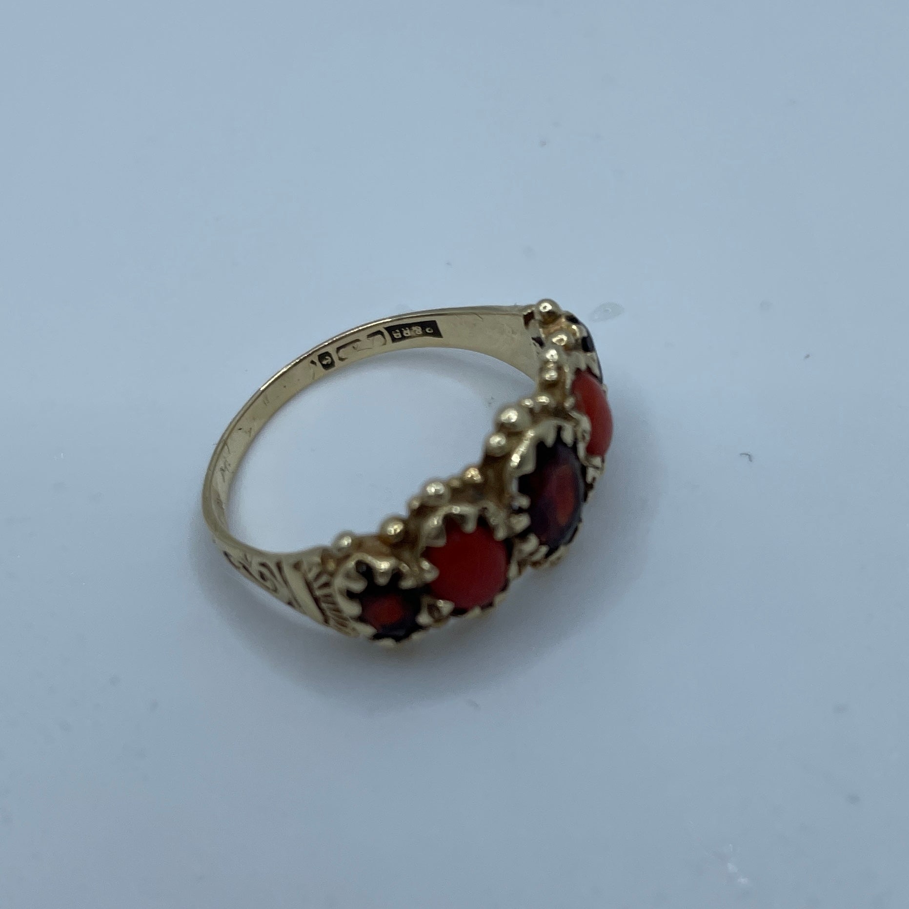 Unique bridge ring set with coral and garnets, in 9ct gold. Weighty 3.5gms and hallmarked for Birmingham. This is such a lovely combination.