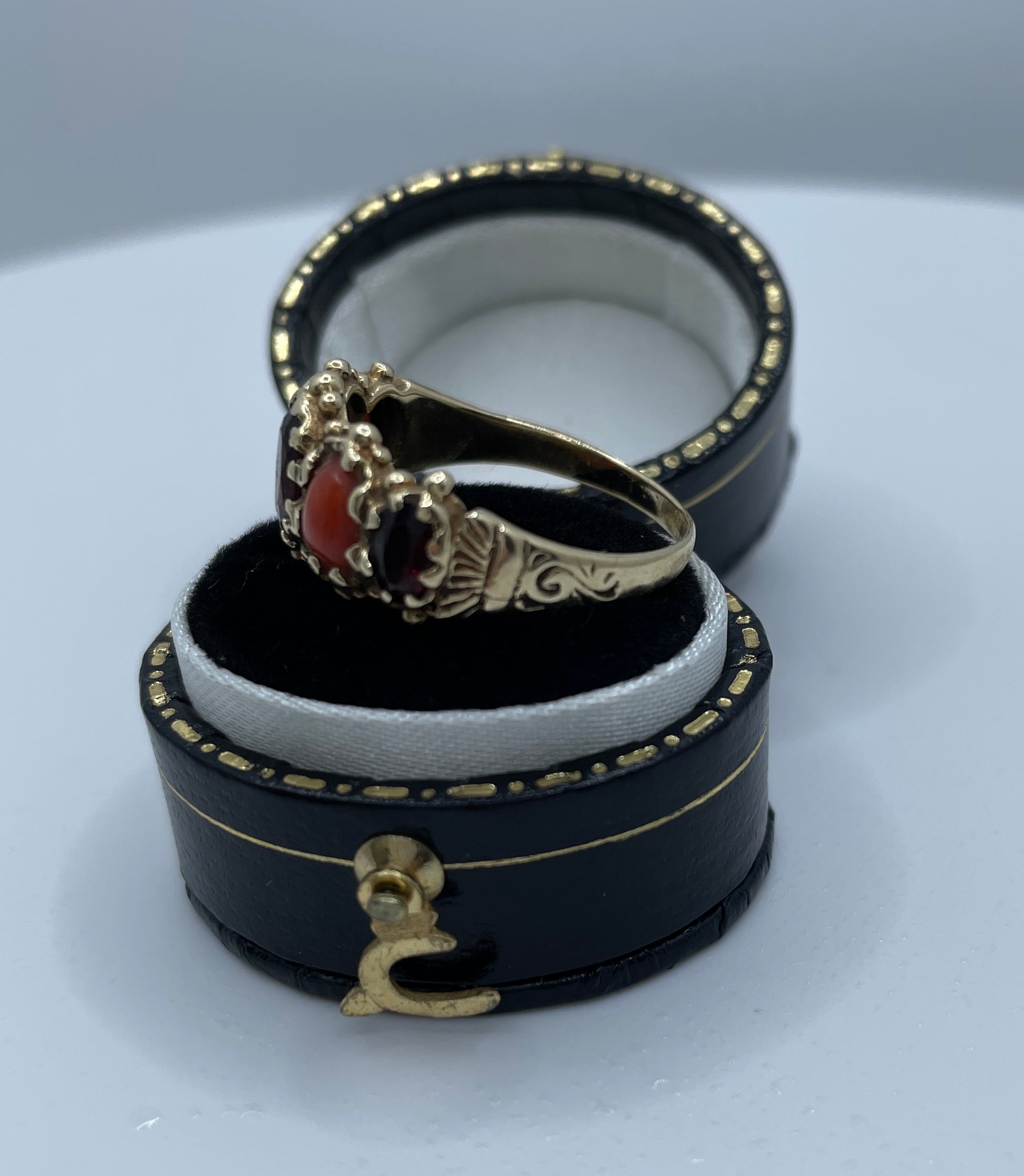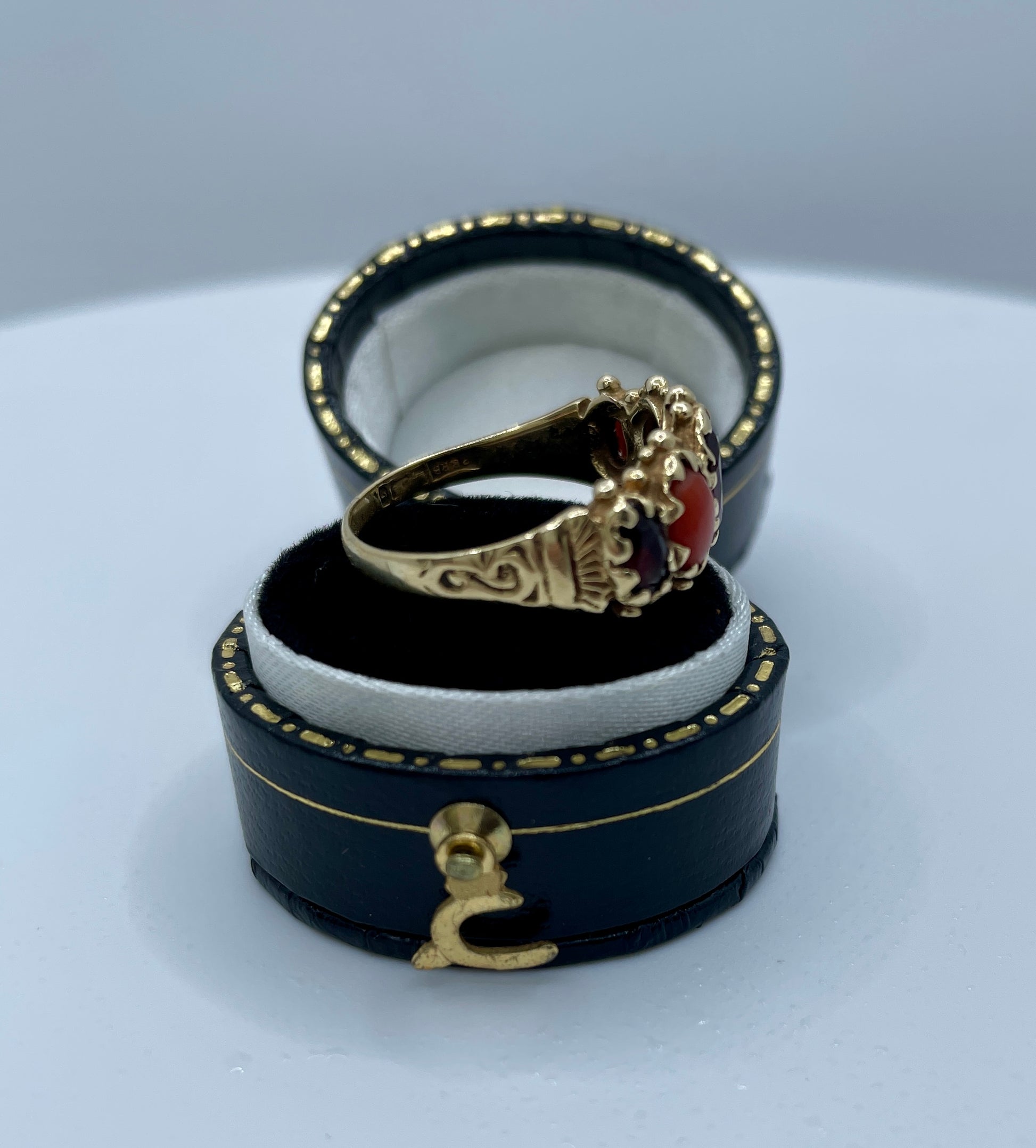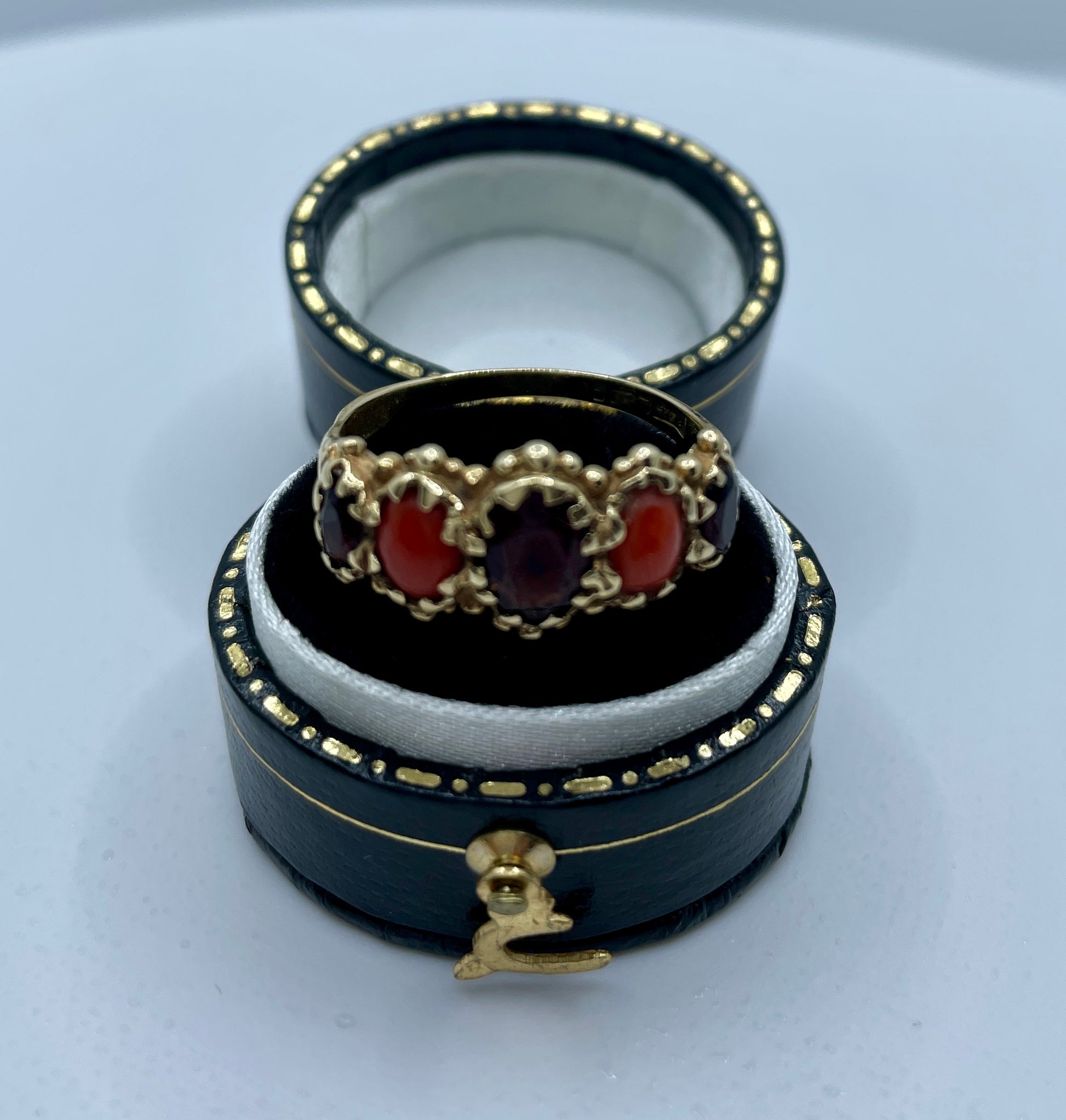 Unique bridge ring set with coral and garnets, in 9ct gold. Weighty 3.5gms and hallmarked for Birmingham. This is such a lovely combination.