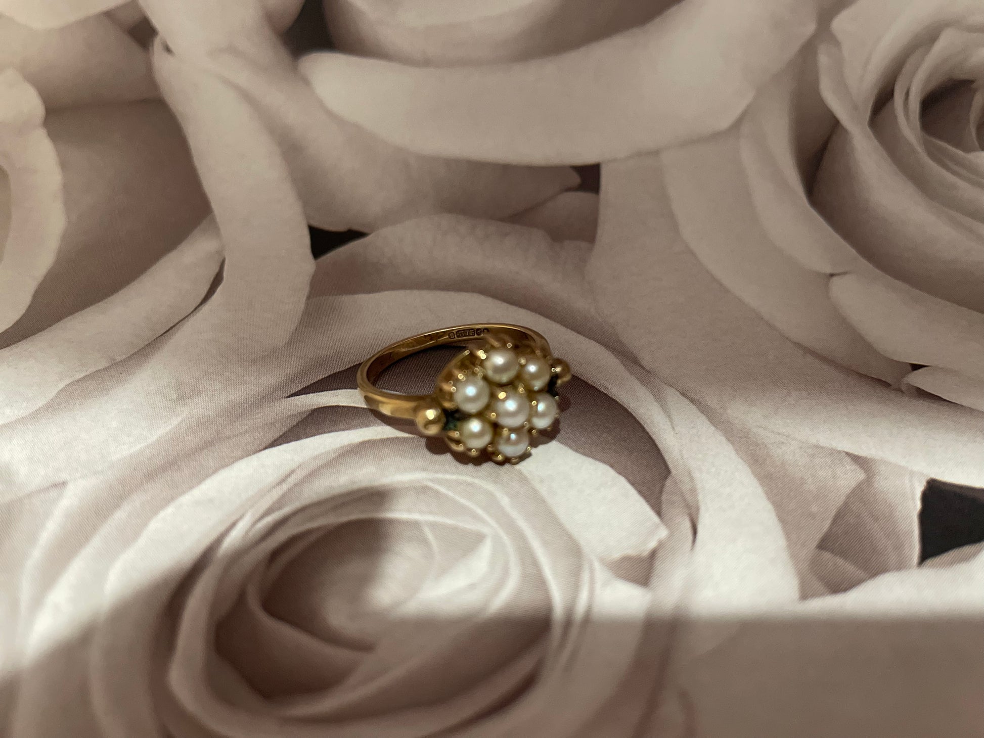 Gorgeous vintage cluster ring, hallmarked for London 1959 and in 9ct gold. This ring is such a 1950’s classic piece.