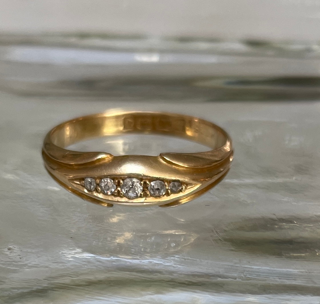 Classic Edwardian five stone diamond bridge ring in 18ct gold. Hallmarked for Birmingham 1913/14.