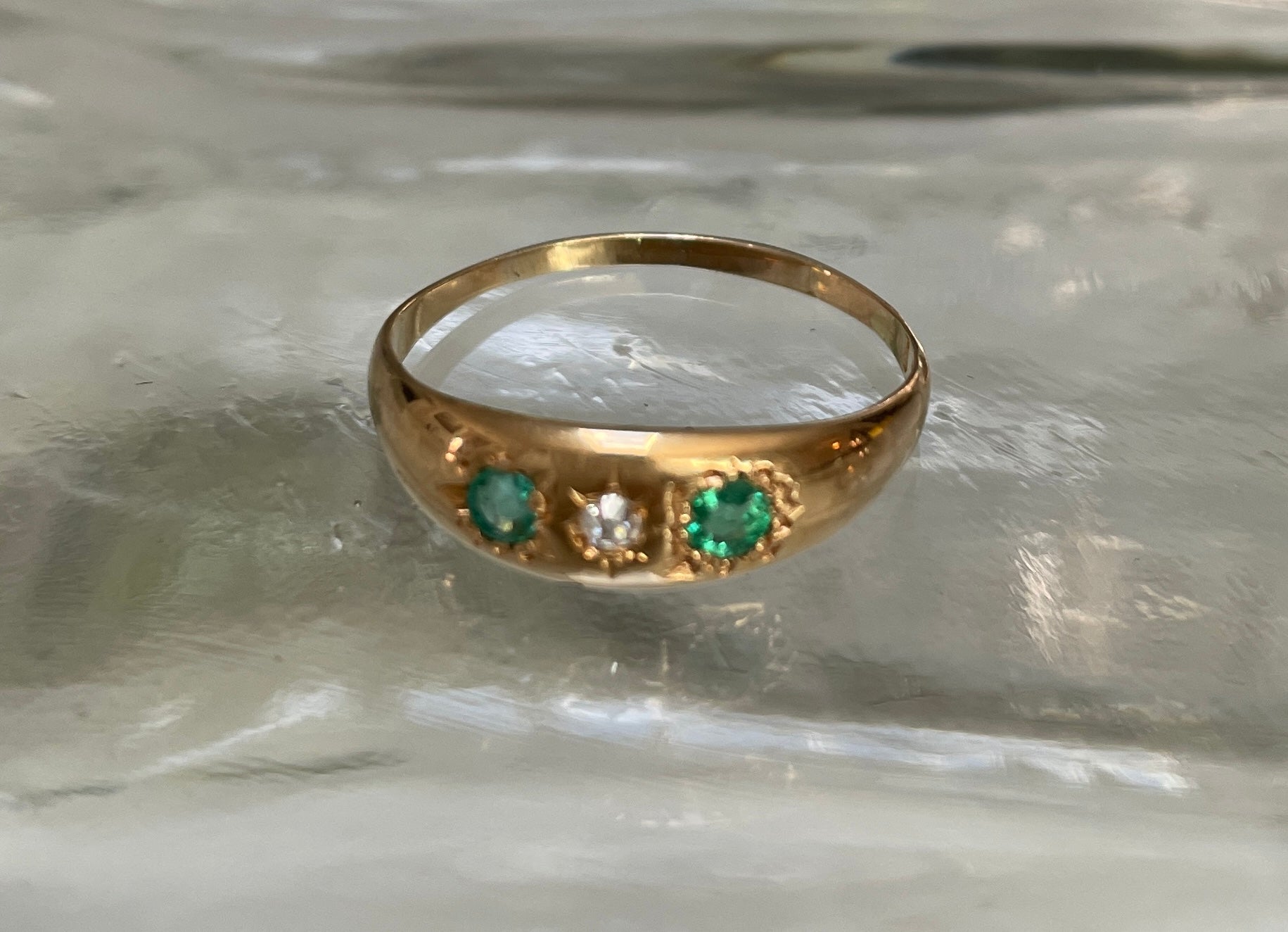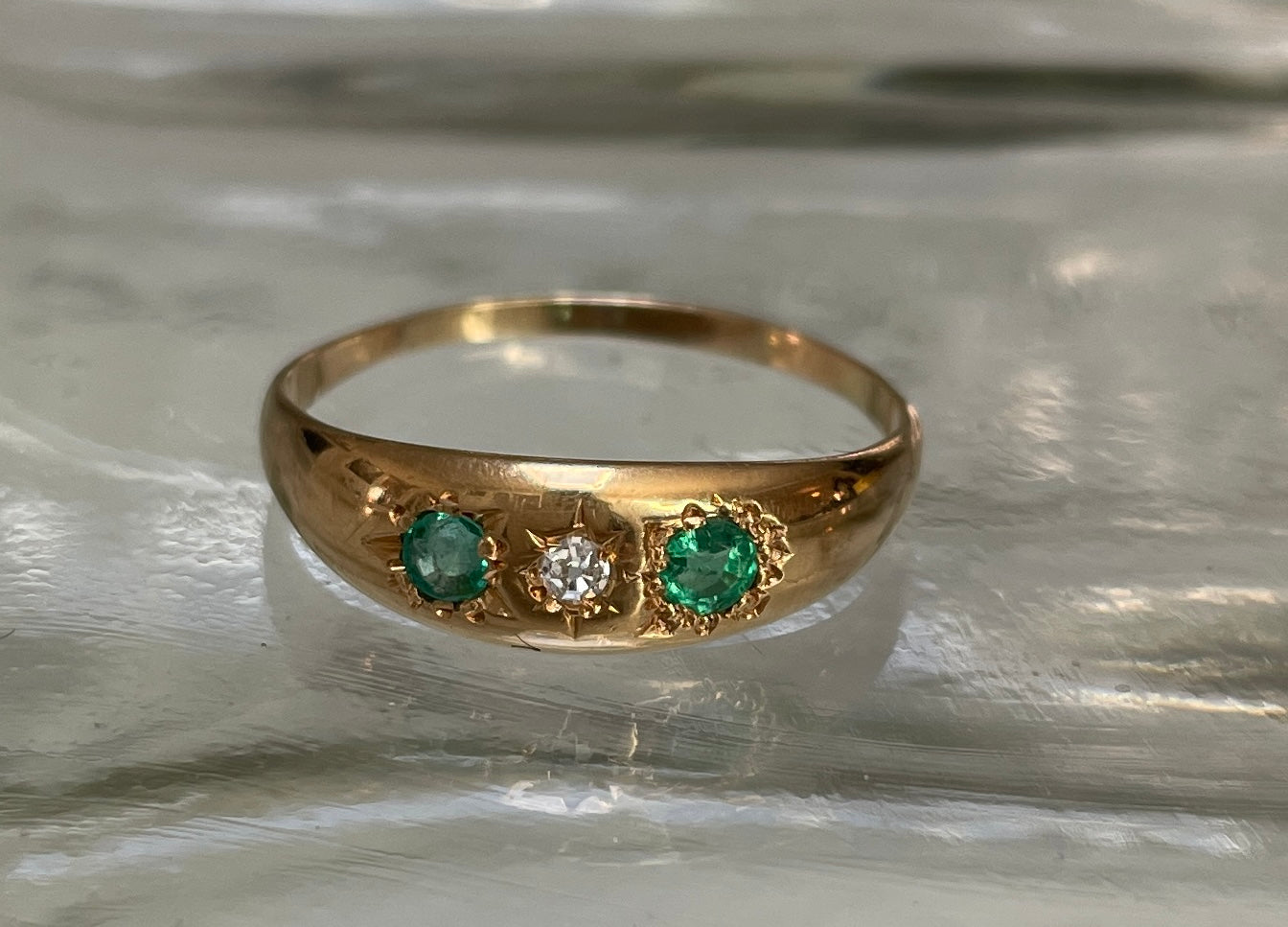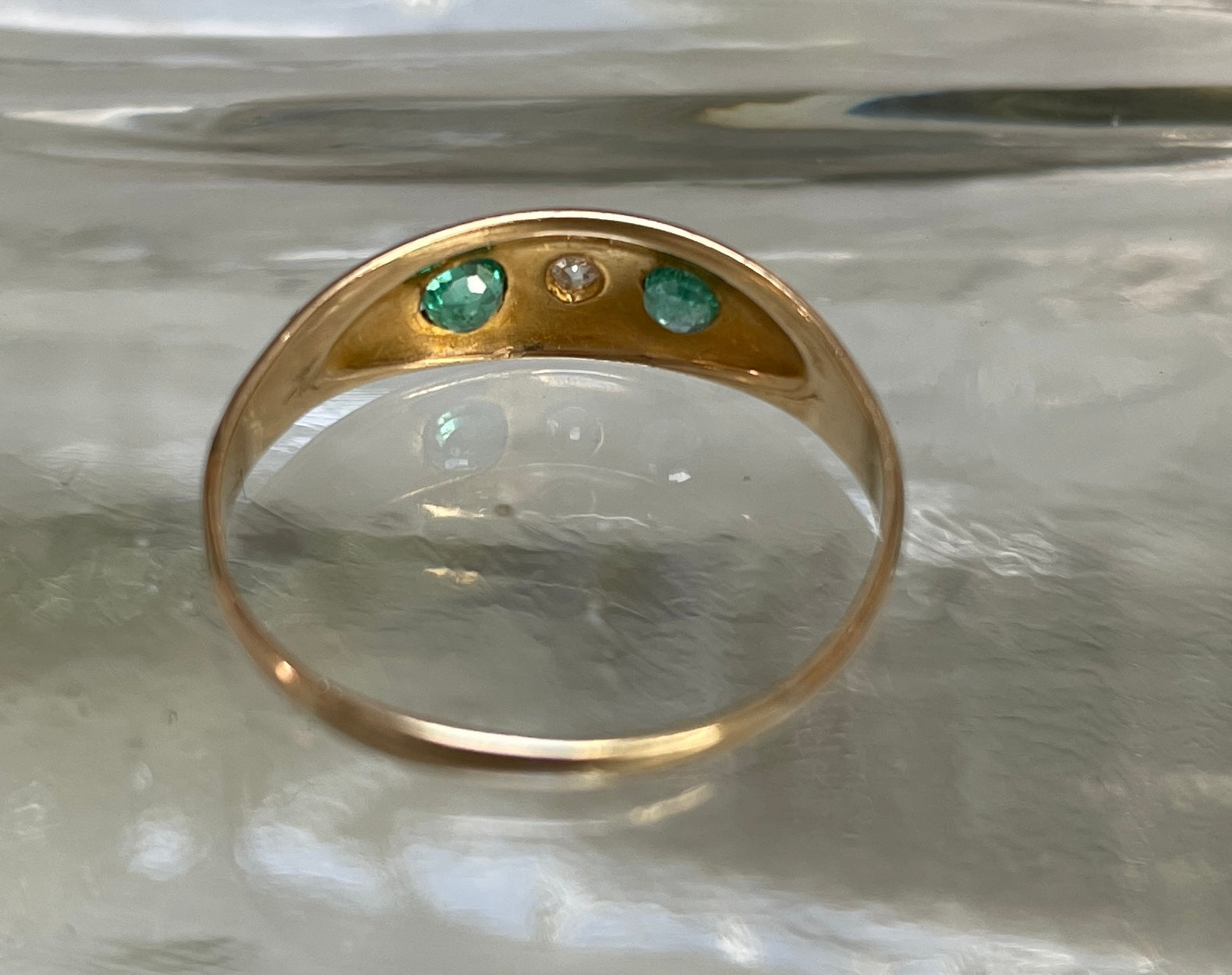 Edwardian emerald and diamond three stone ring in 18ct gold.