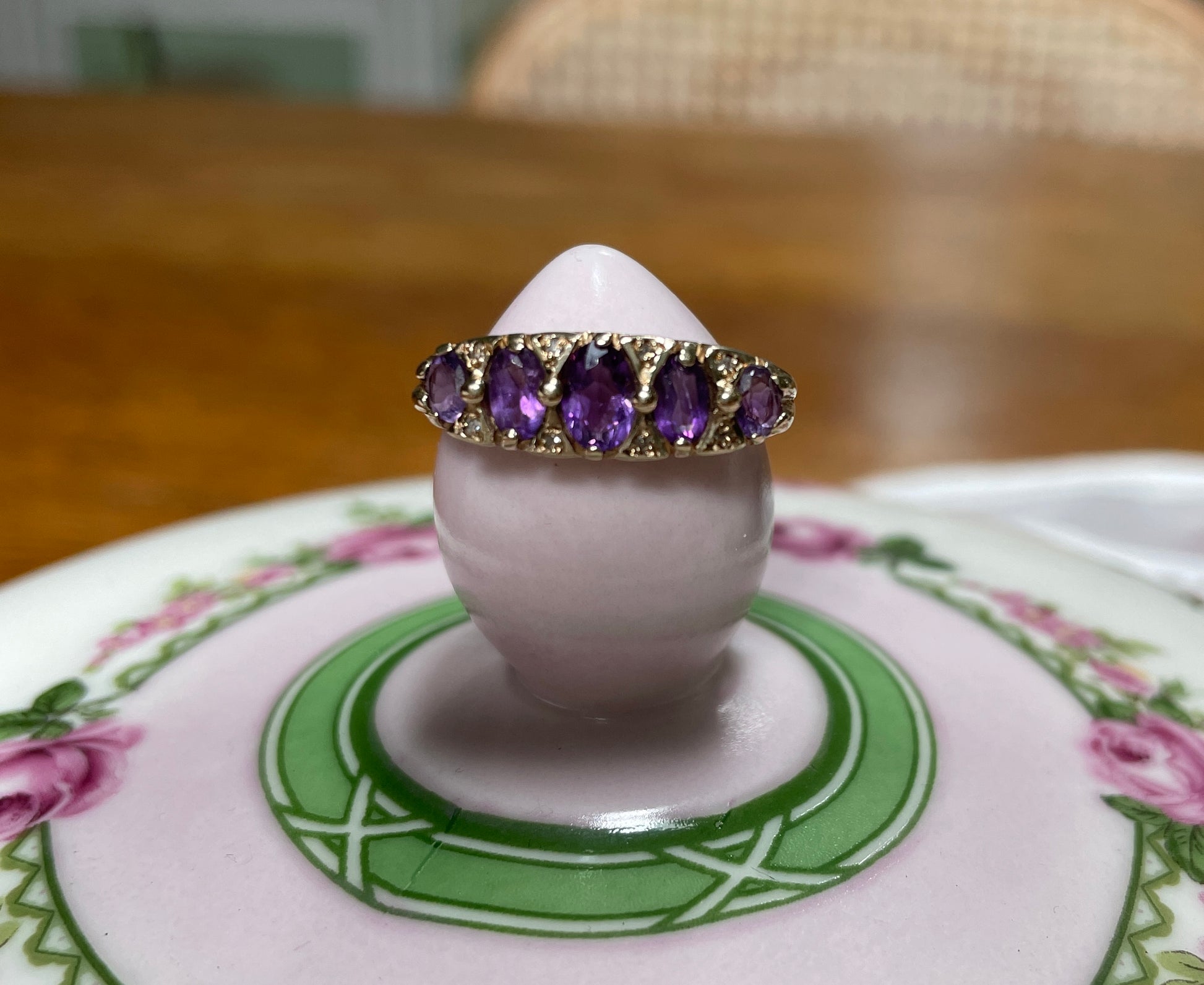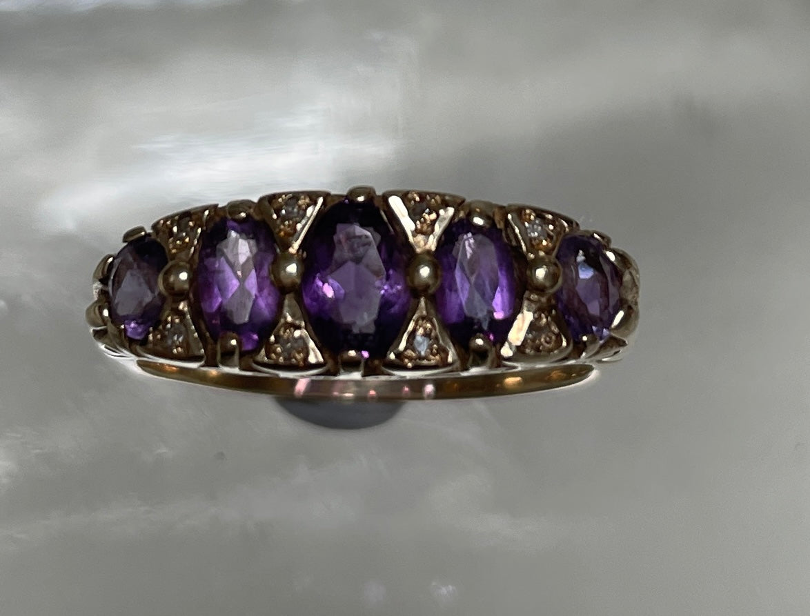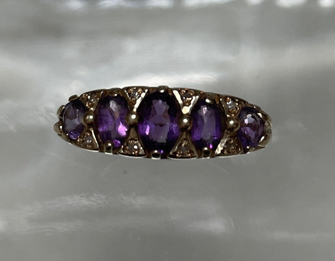 Stunning 9ct gold ring hallmarked for Birmingham 1943. Set with five amethysts and single cut diamond accents. In beautiful condition.