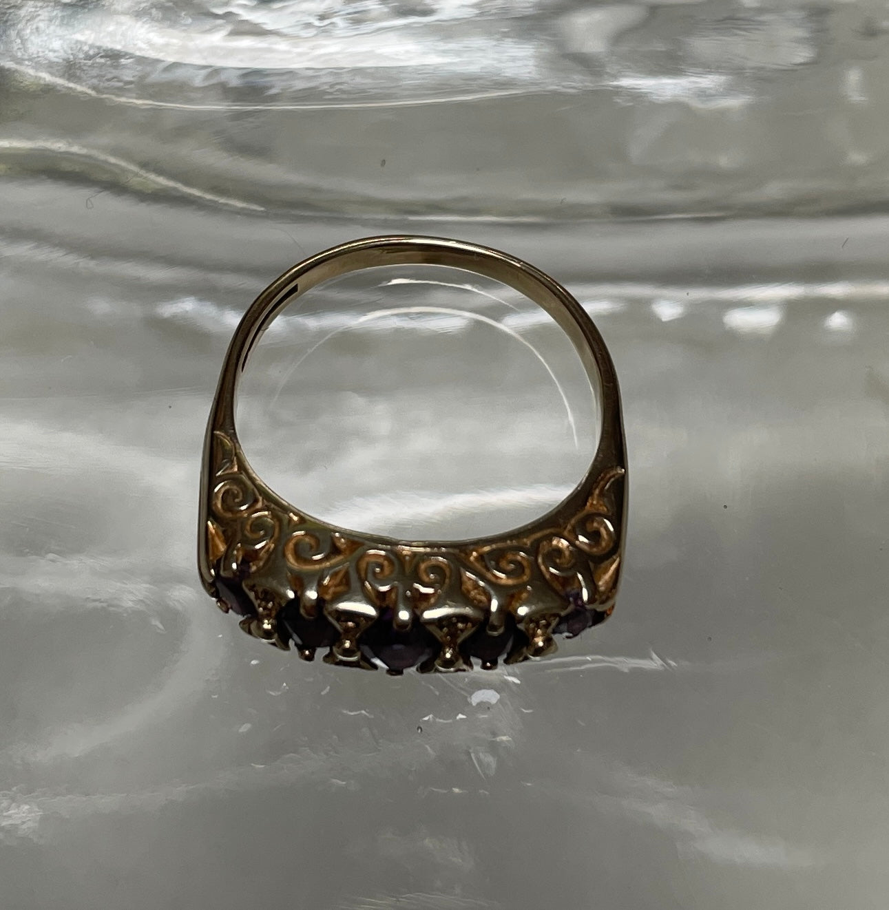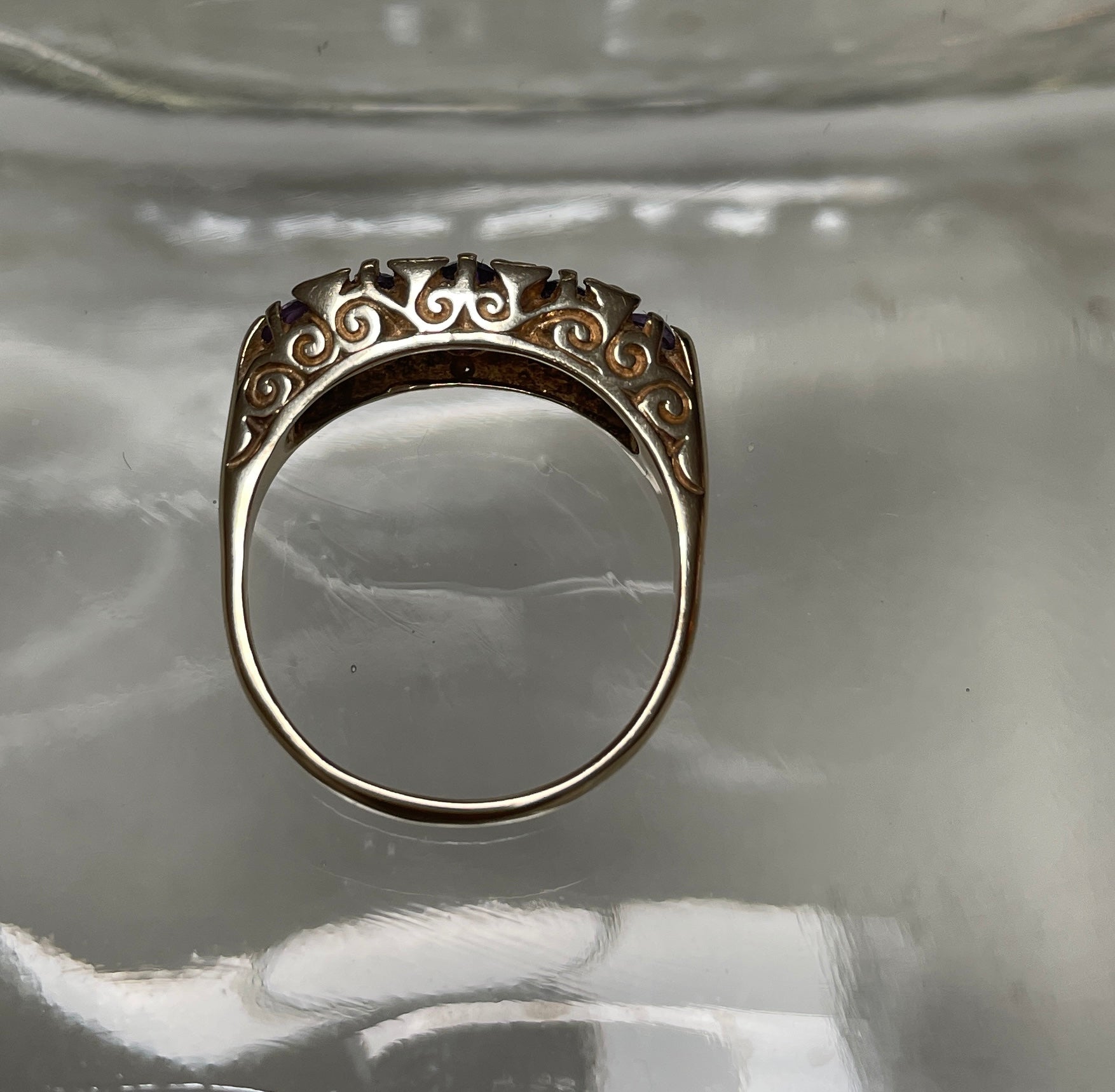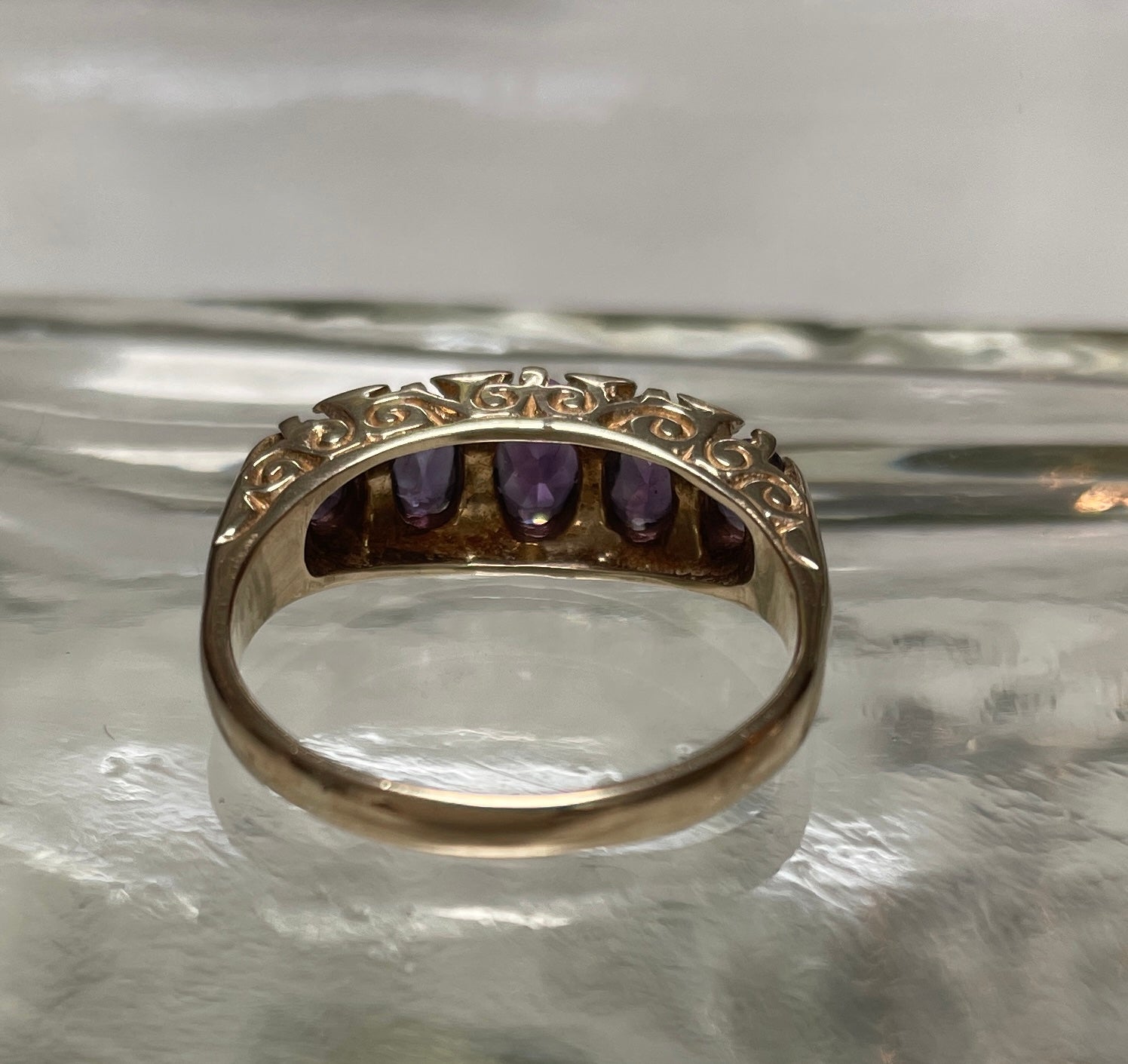 Stunning 9ct gold ring hallmarked for Birmingham 1943. Set with five amethysts and single cut diamond accents. In beautiful condition.