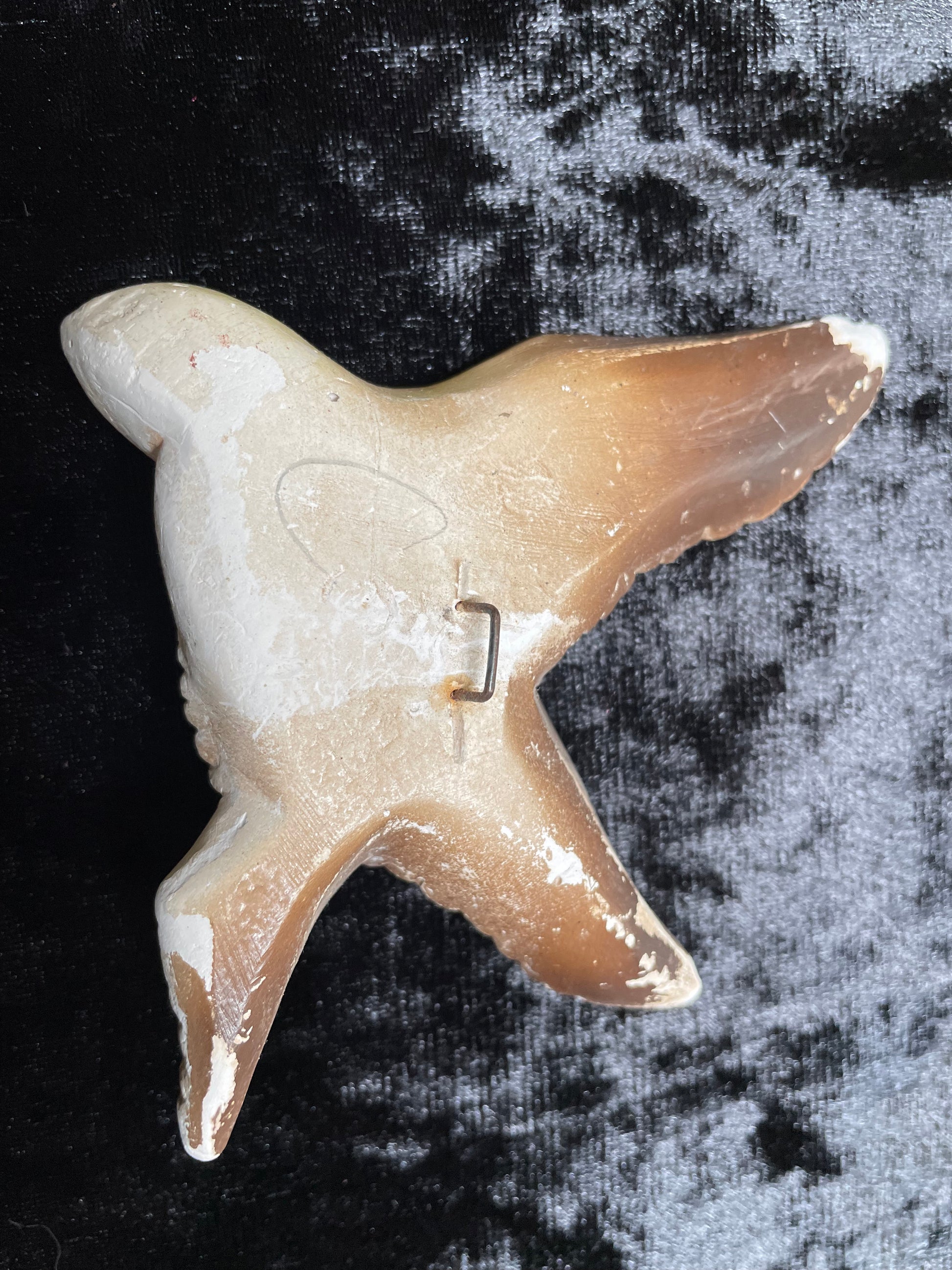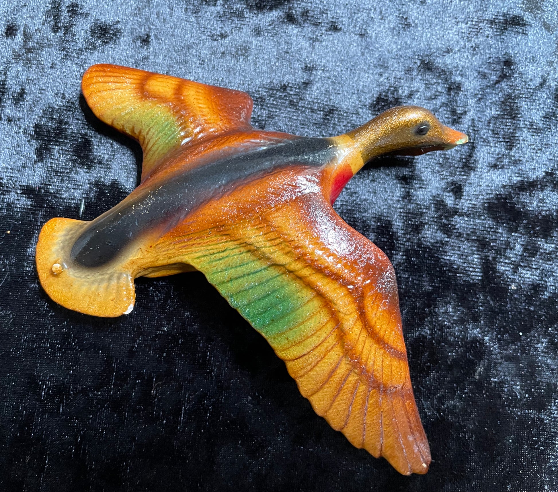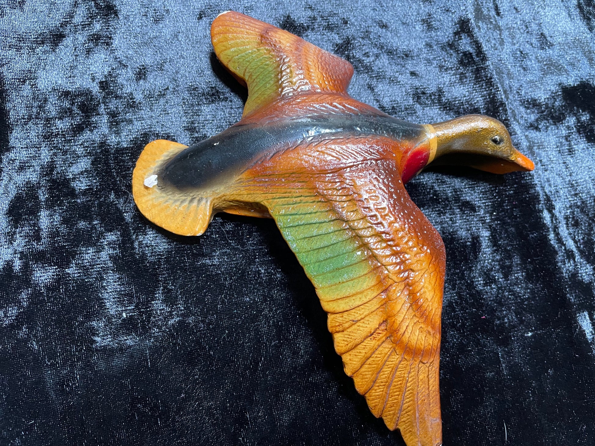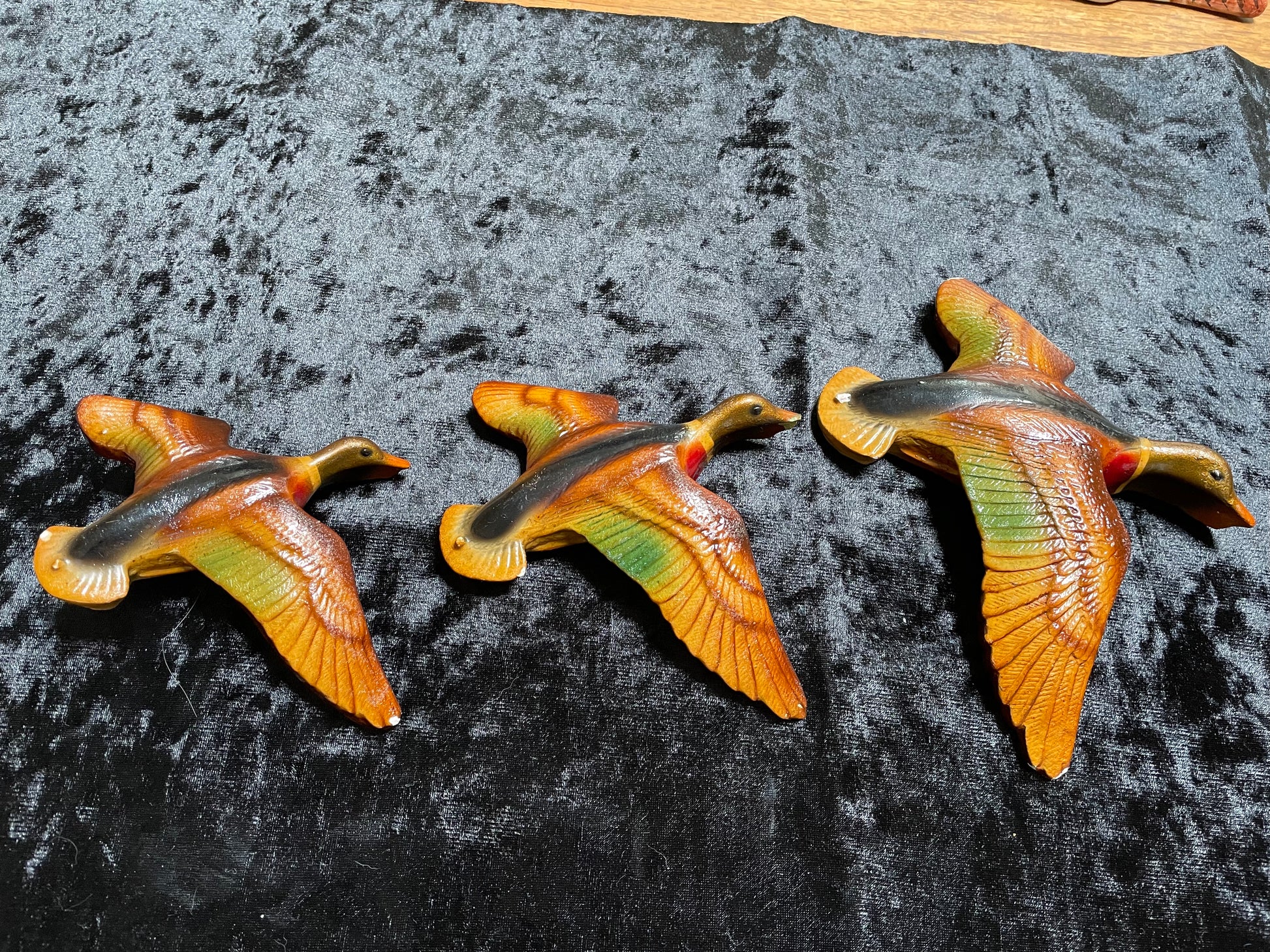 Another set of birds from my collection. A set of three flying plaster ducks in Autumn tones. No makers marks and they look as if they have been painted with a top coat of varnish at some point in time. They all have a few slight nicks and small chips. The middle one is chipped to the underside of the beak. They look great on the wall and they are all about 2cm thick.