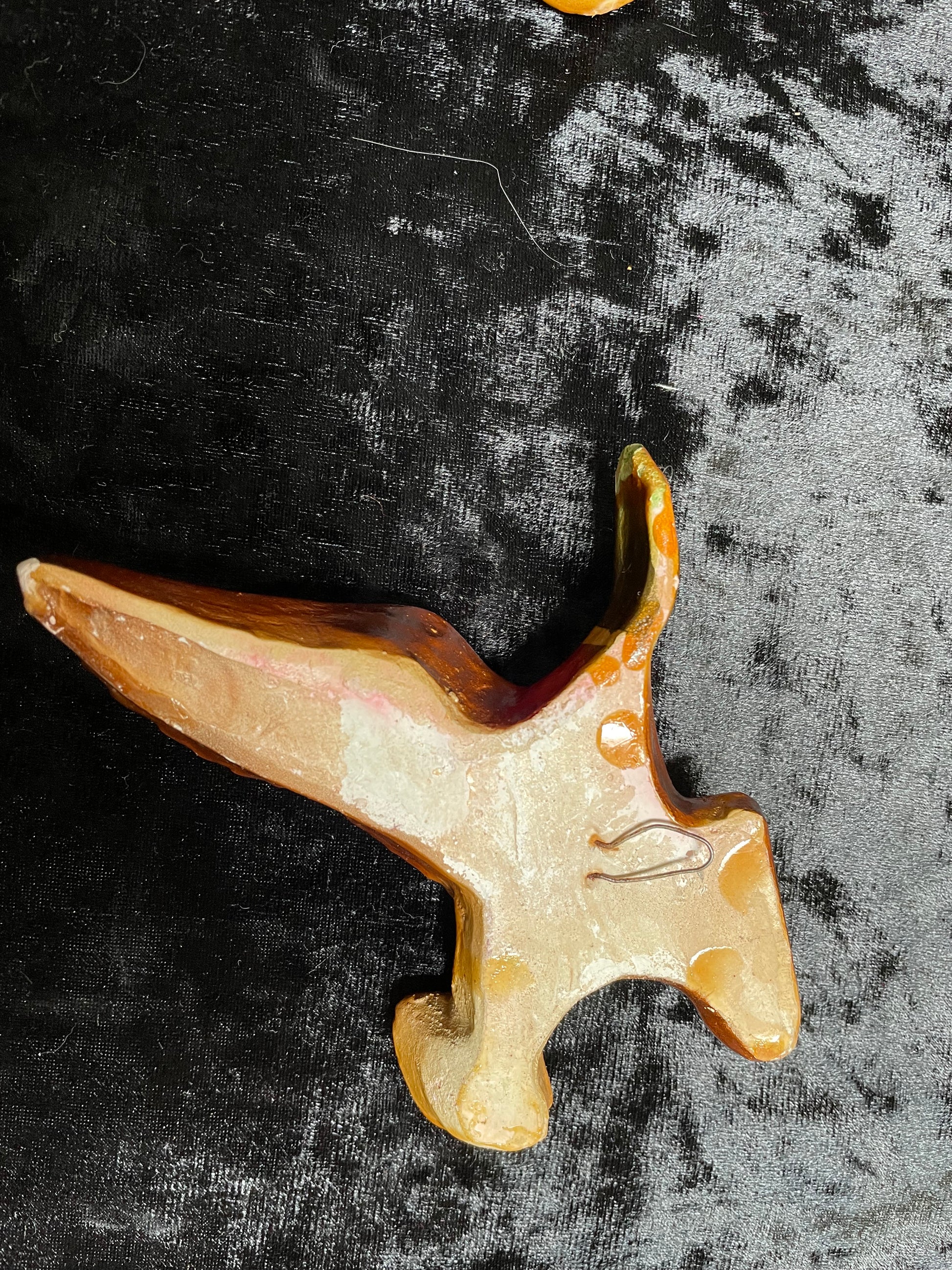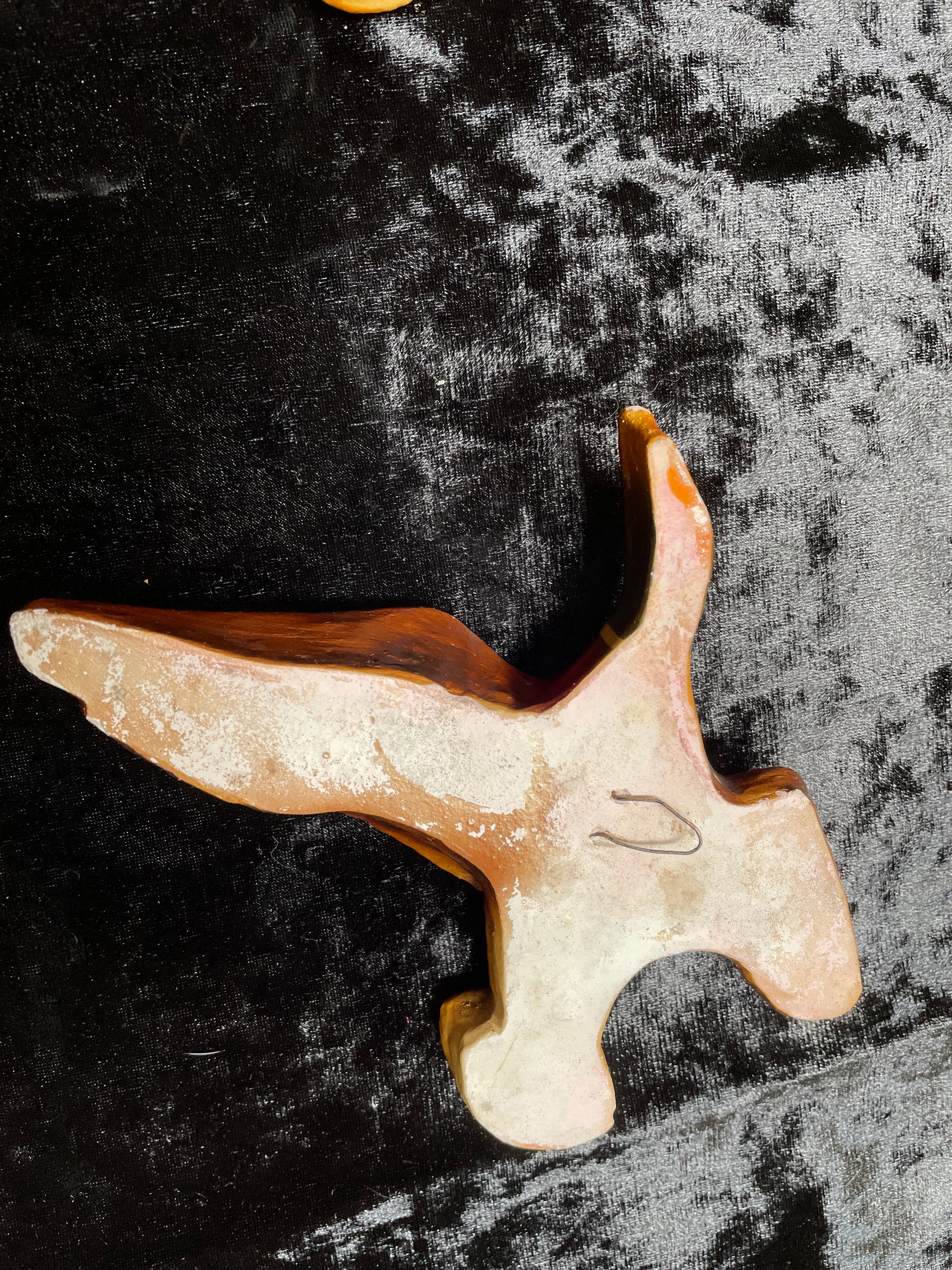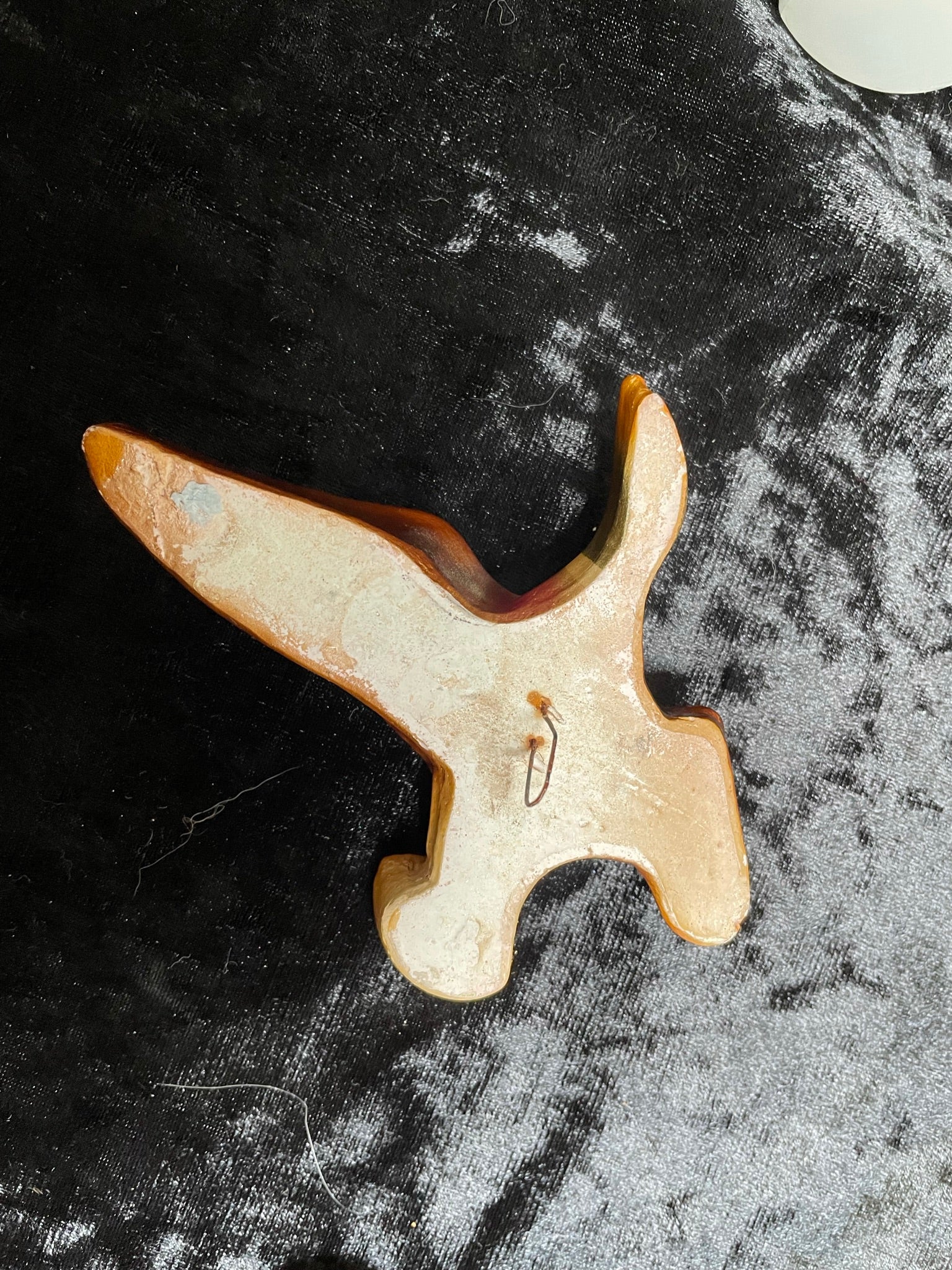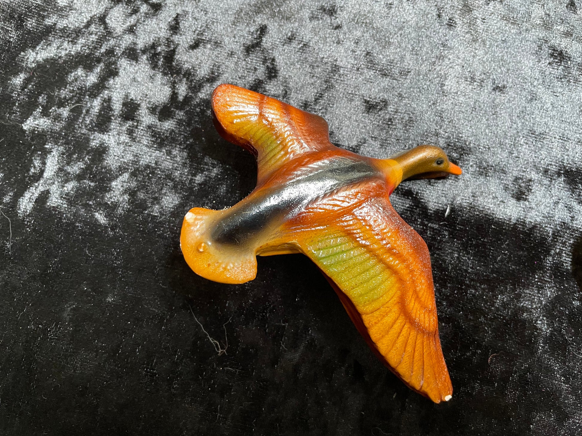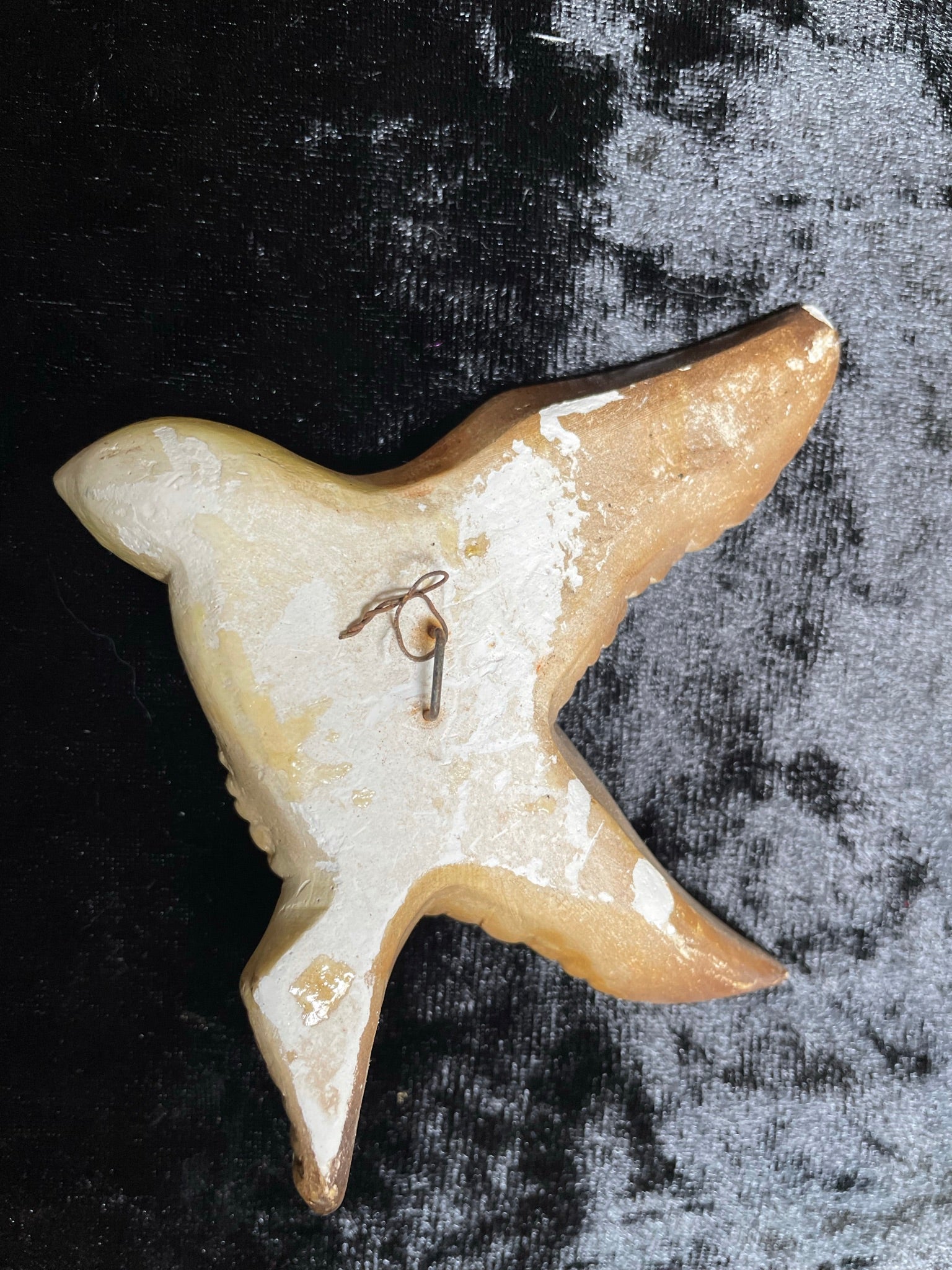 Another set of birds from my collection. A set of three flying plaster ducks in Autumn tones. No makers marks and they look as if they have been painted with a top coat of varnish at some point in time. They all have a few slight nicks and small chips. The middle one is chipped to the underside of the beak. They look great on the wall and they are all about 2cm thick.