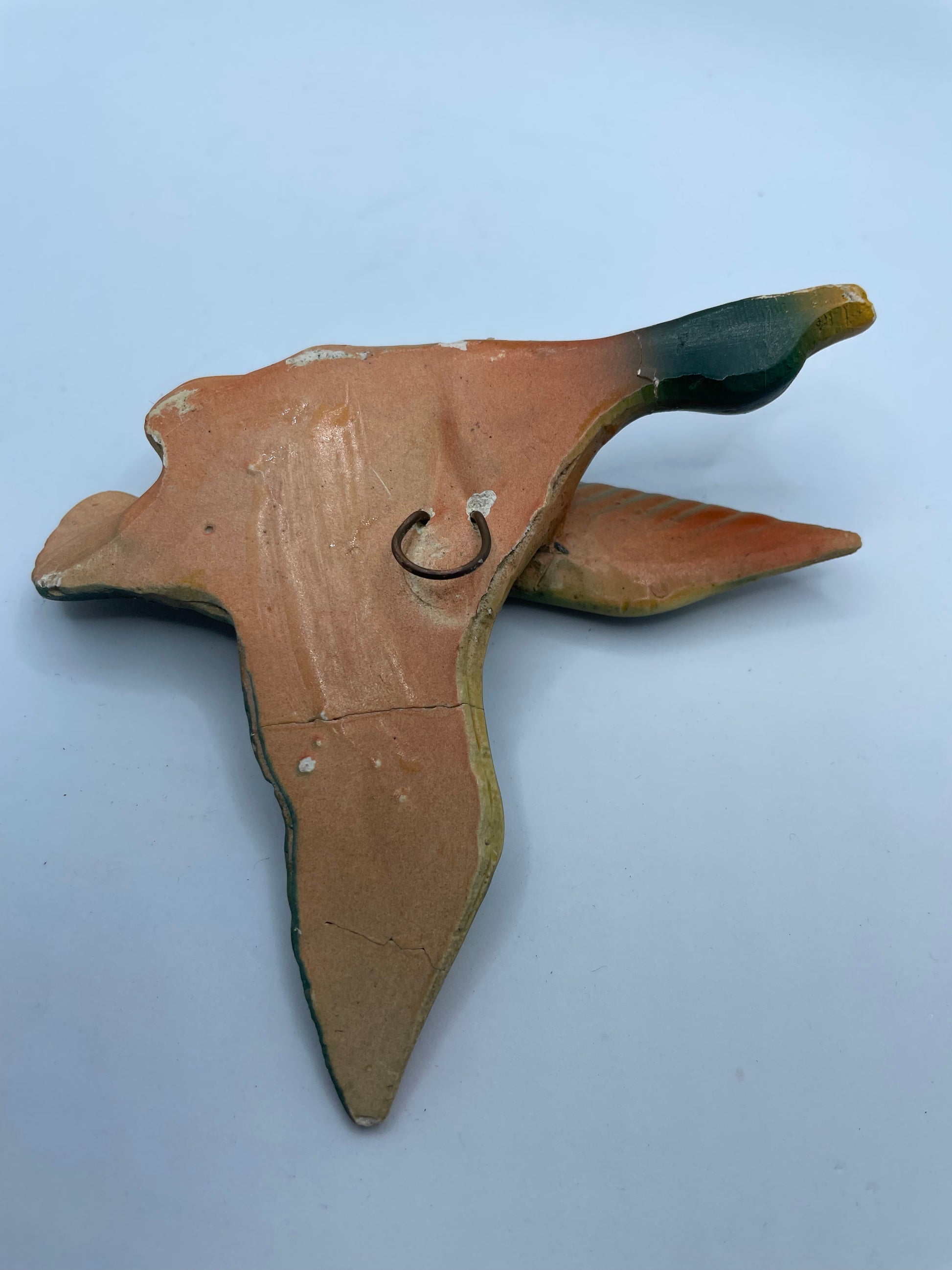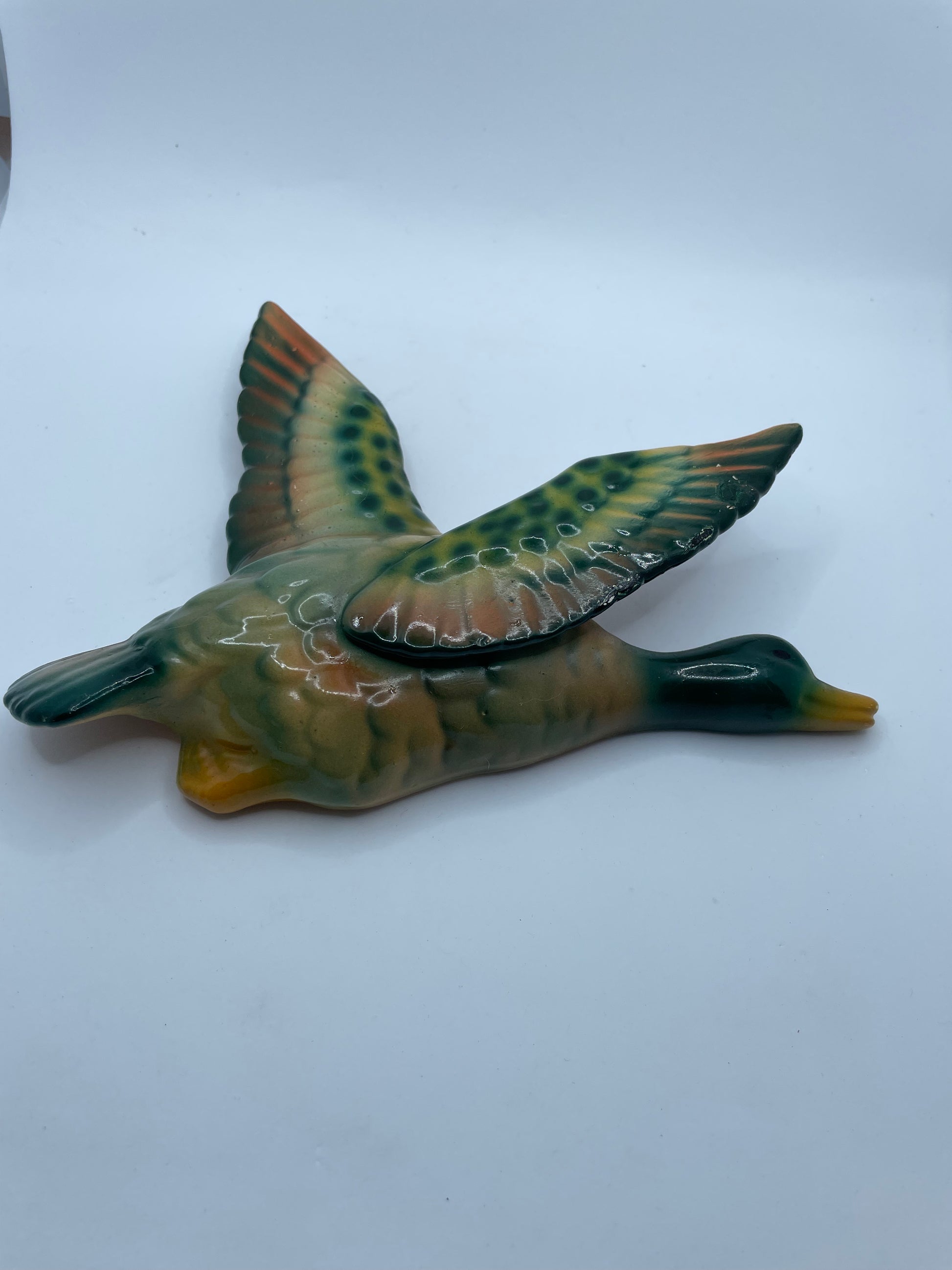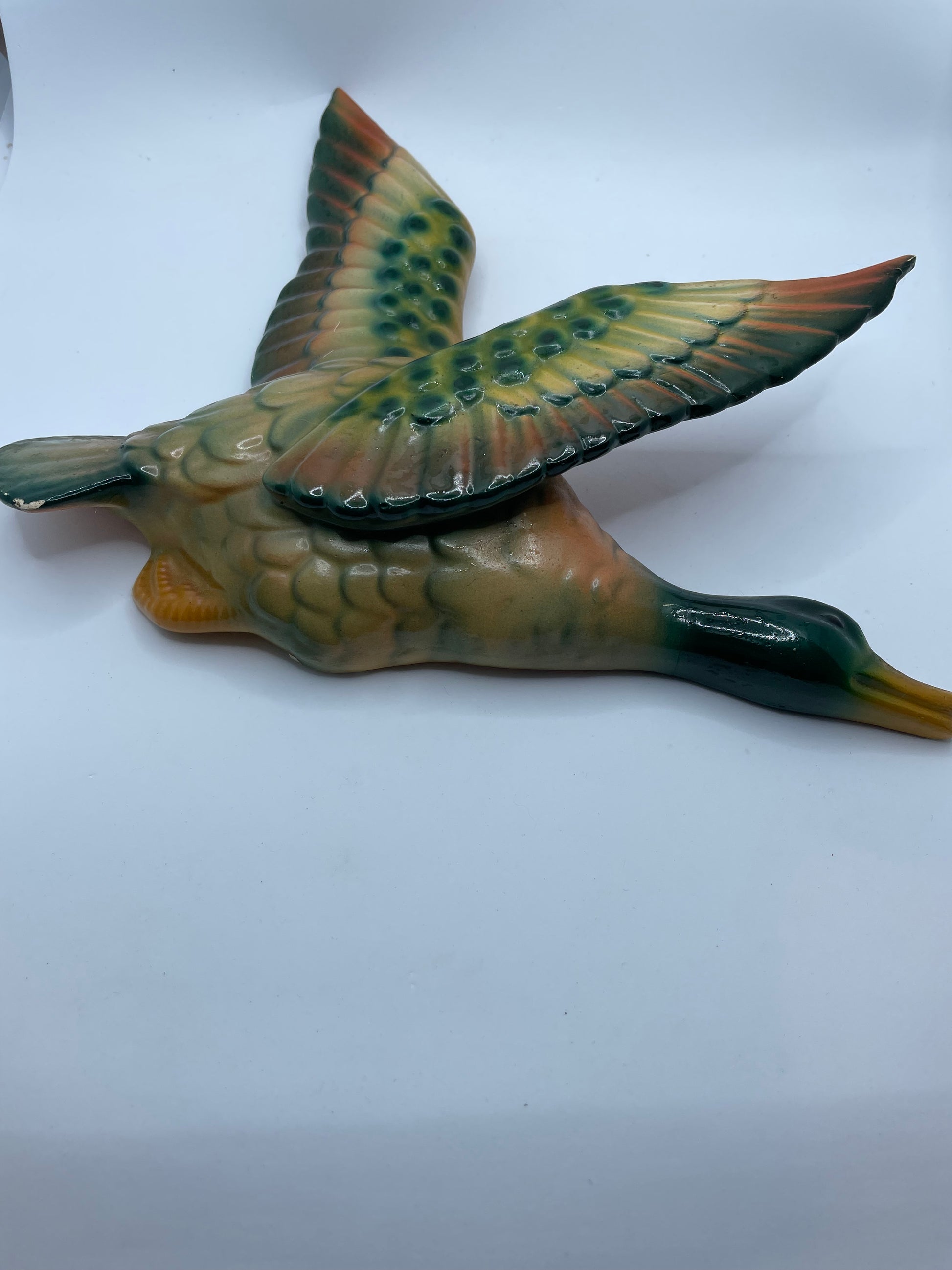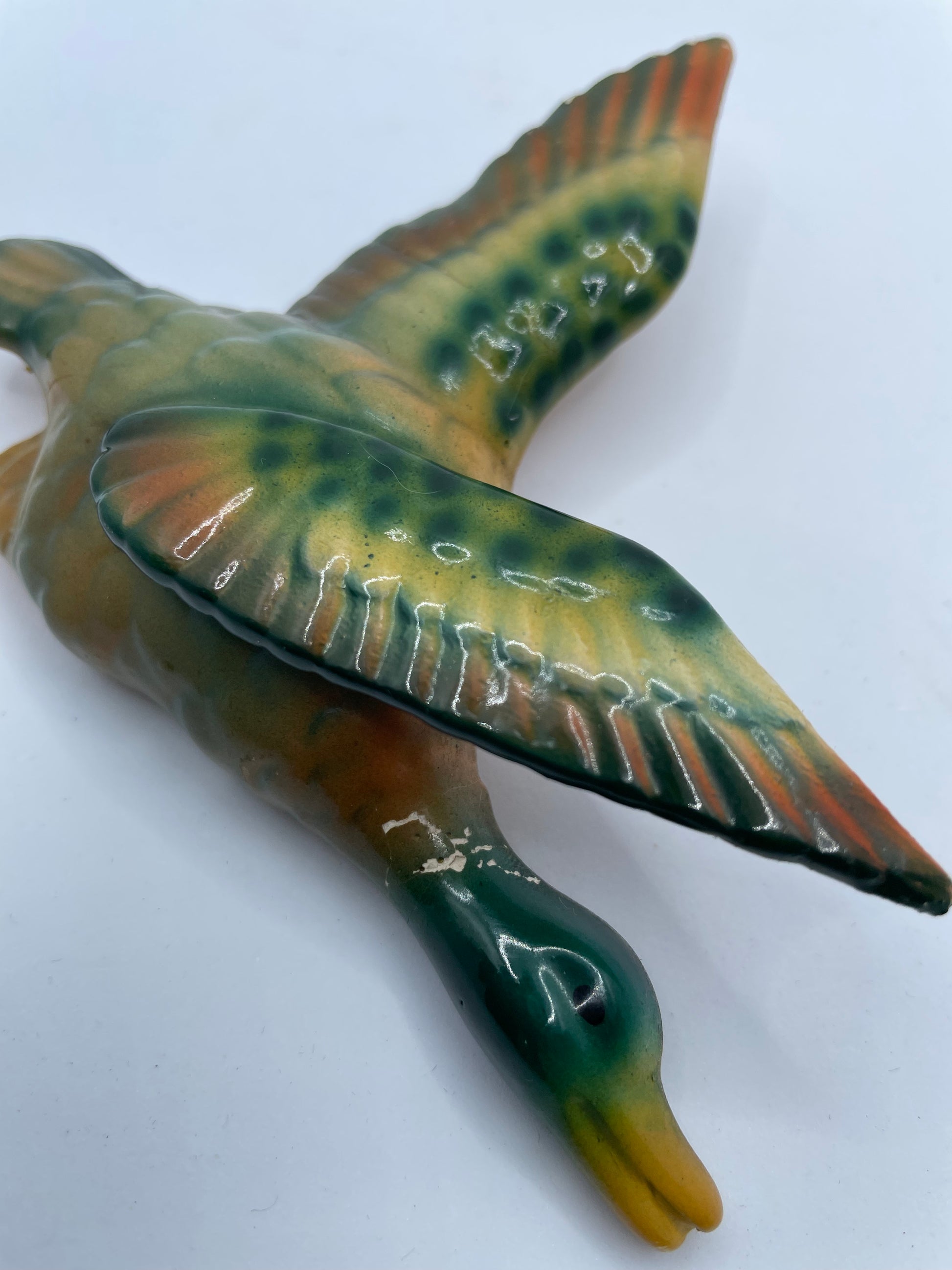 Large duck has paint missing on tail, medium duck has repair to wing tip and edge of wing, small duck has repair to wing in two places and head. Please look carefully at photos as these form part of the product description. They do have some faults, but these do not detract from this lovely set once on the wall.