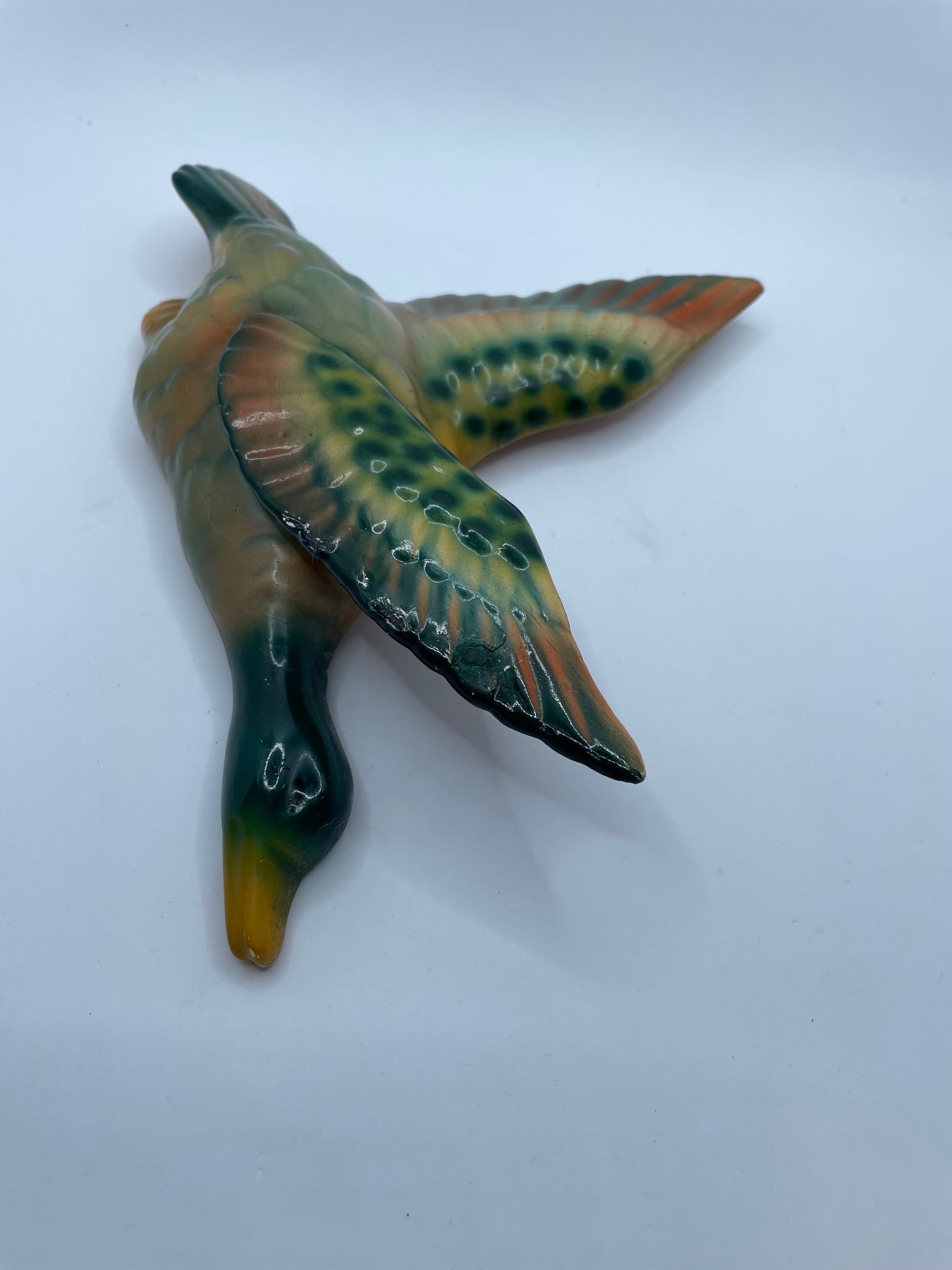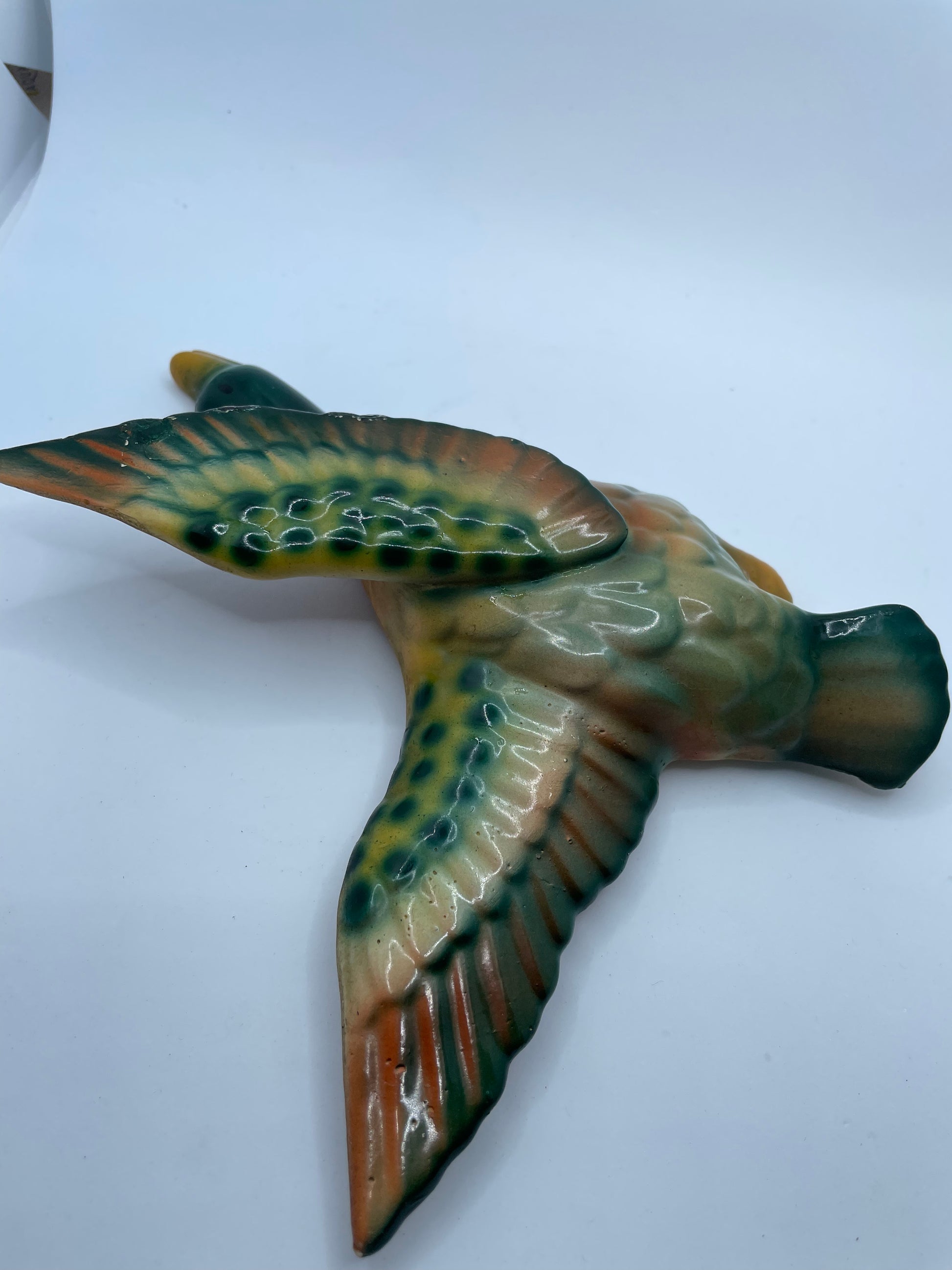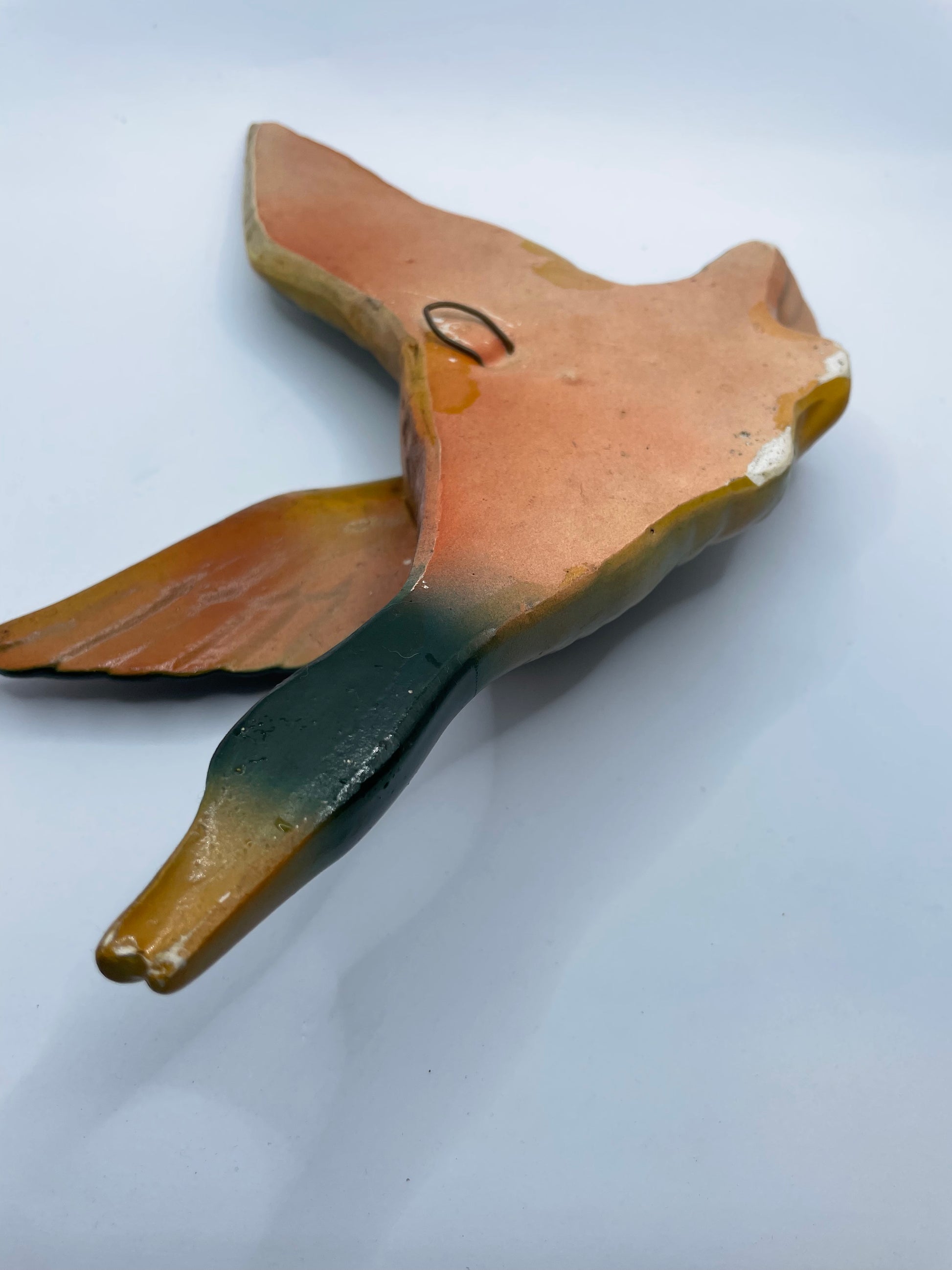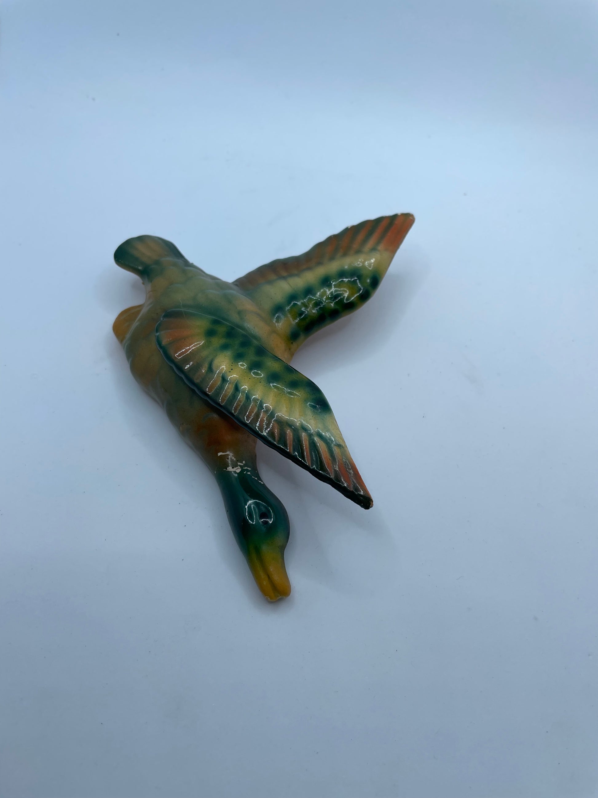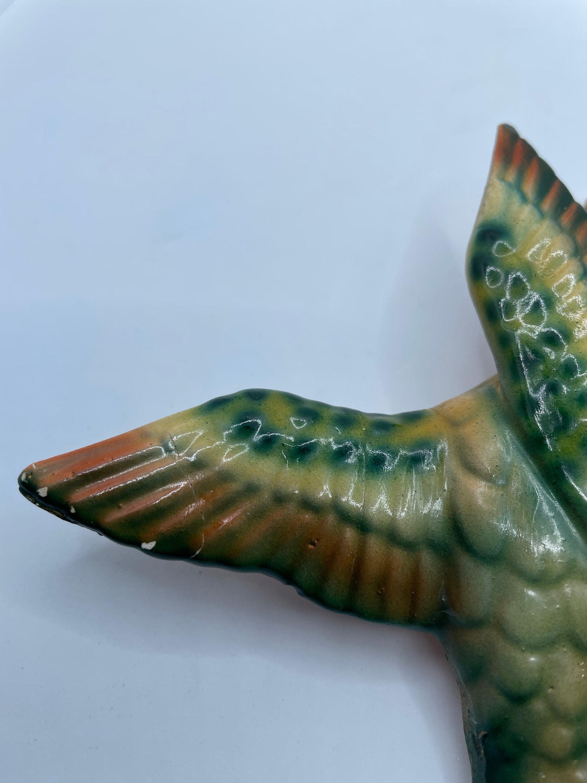 Large duck has paint missing on tail, medium duck has repair to wing tip and edge of wing, small duck has repair to wing in two places and head. Please look carefully at photos as these form part of the product description. They do have some faults, but these do not detract from this lovely set once on the wall.