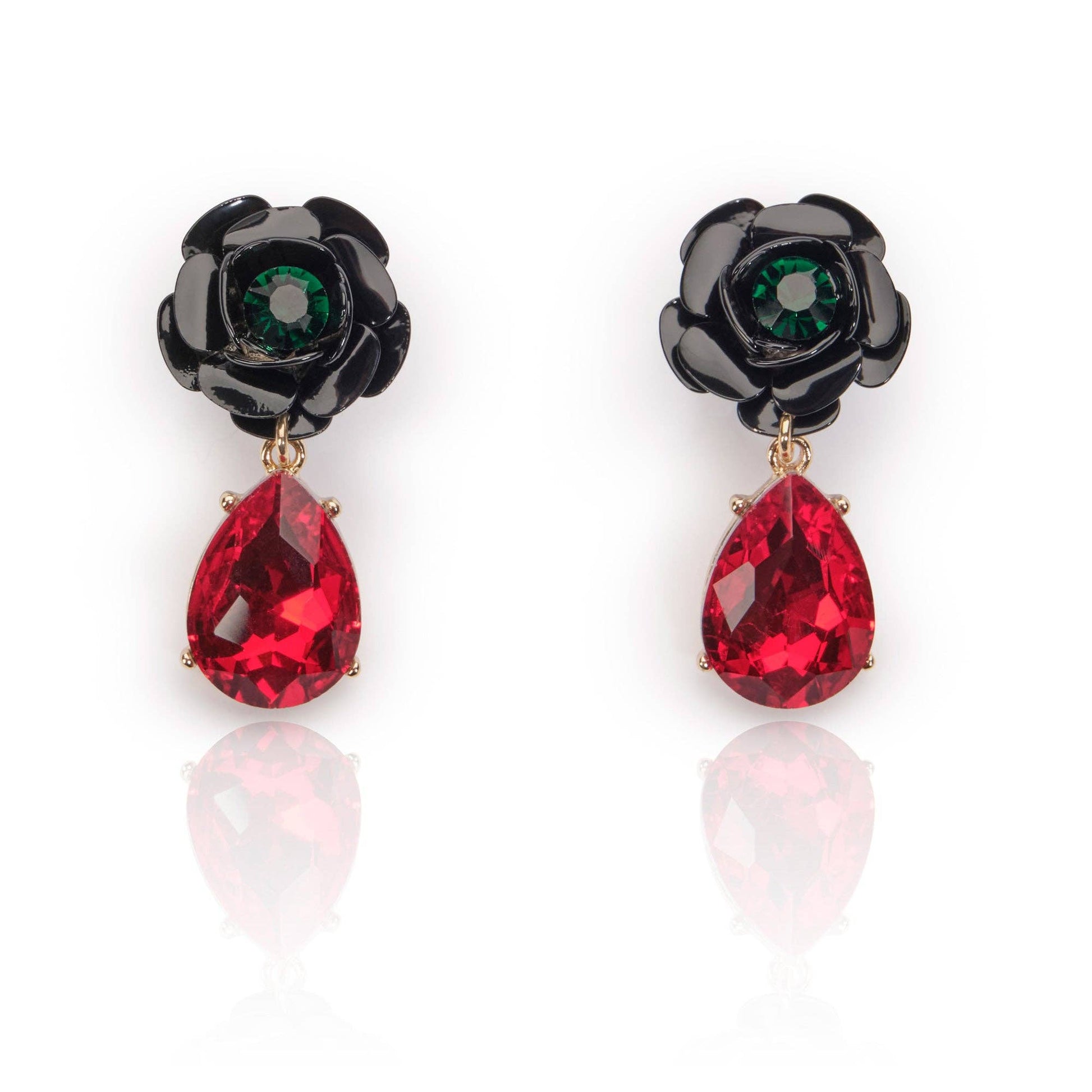 Carefully modelled enamel petals circle around a deep green jewelled centre with a striking ruby crystal teardrop. Perfect for the Pin-up girl who loves her 50s rock style or someone who loves to collect vintage style jewellery.