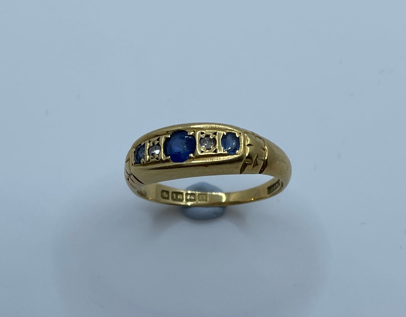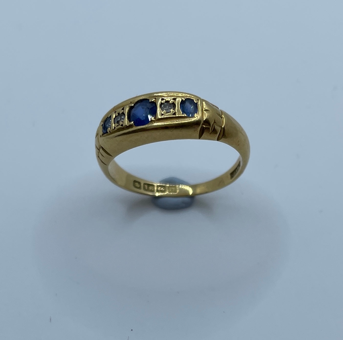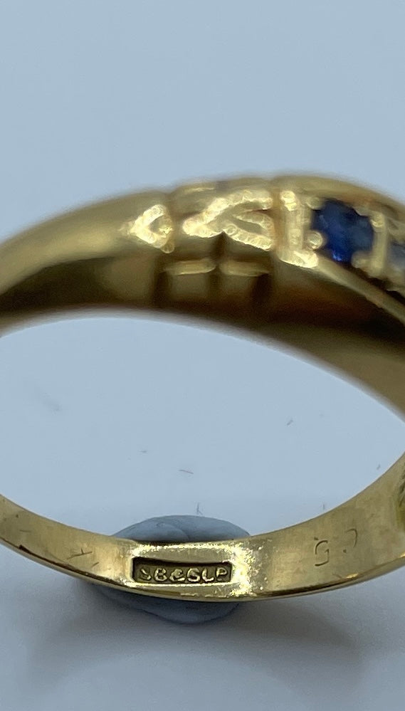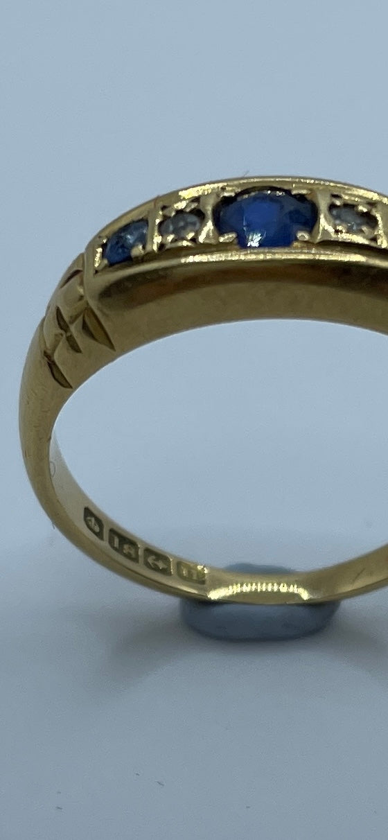 Beautiful sapphire and old cut diamond bridge ring in 18ct gold. Hallmarked for Birmingham 1912 it is set with three sapphires. the small sapphire on the right is chipped, but still has a lovely sparkle.