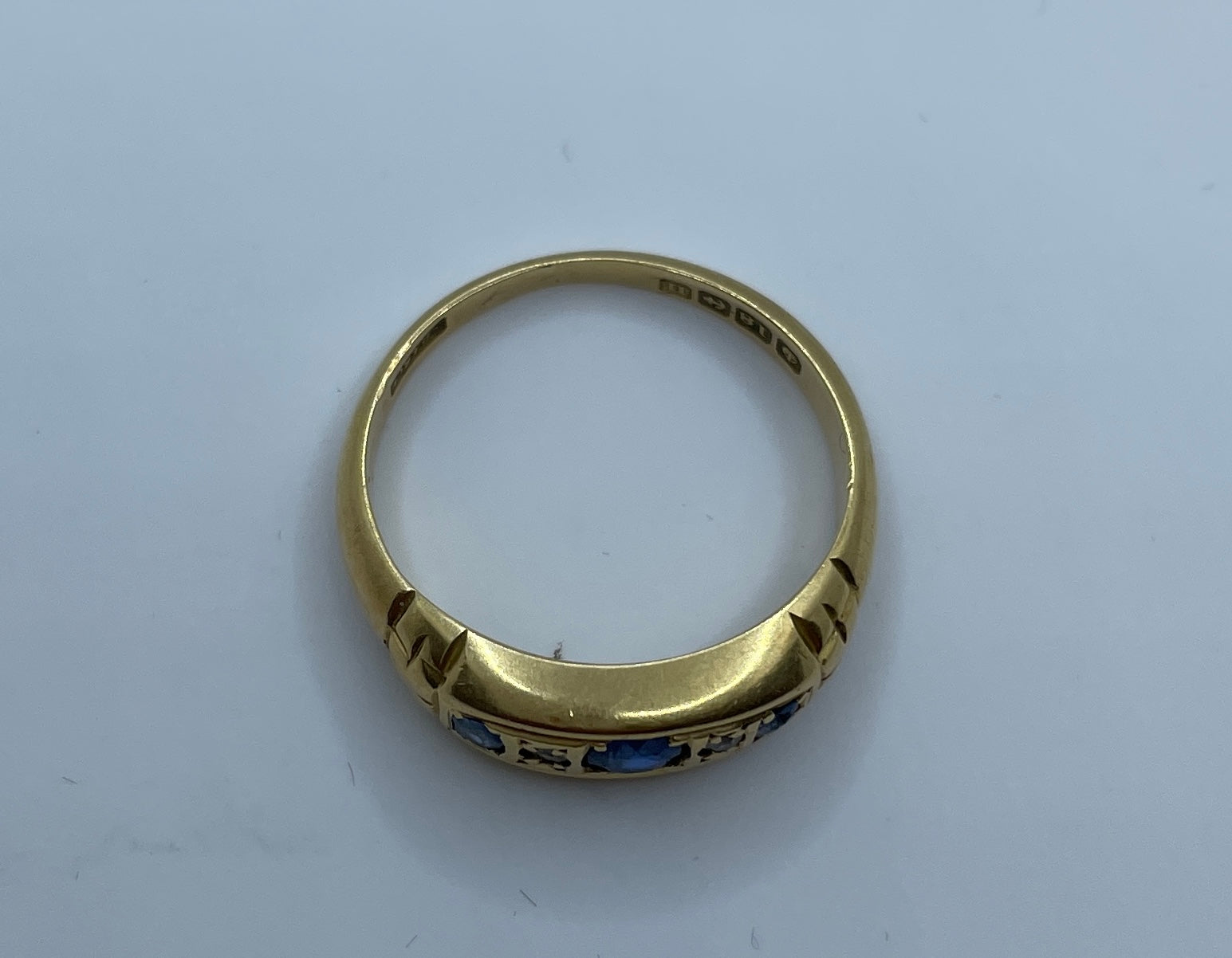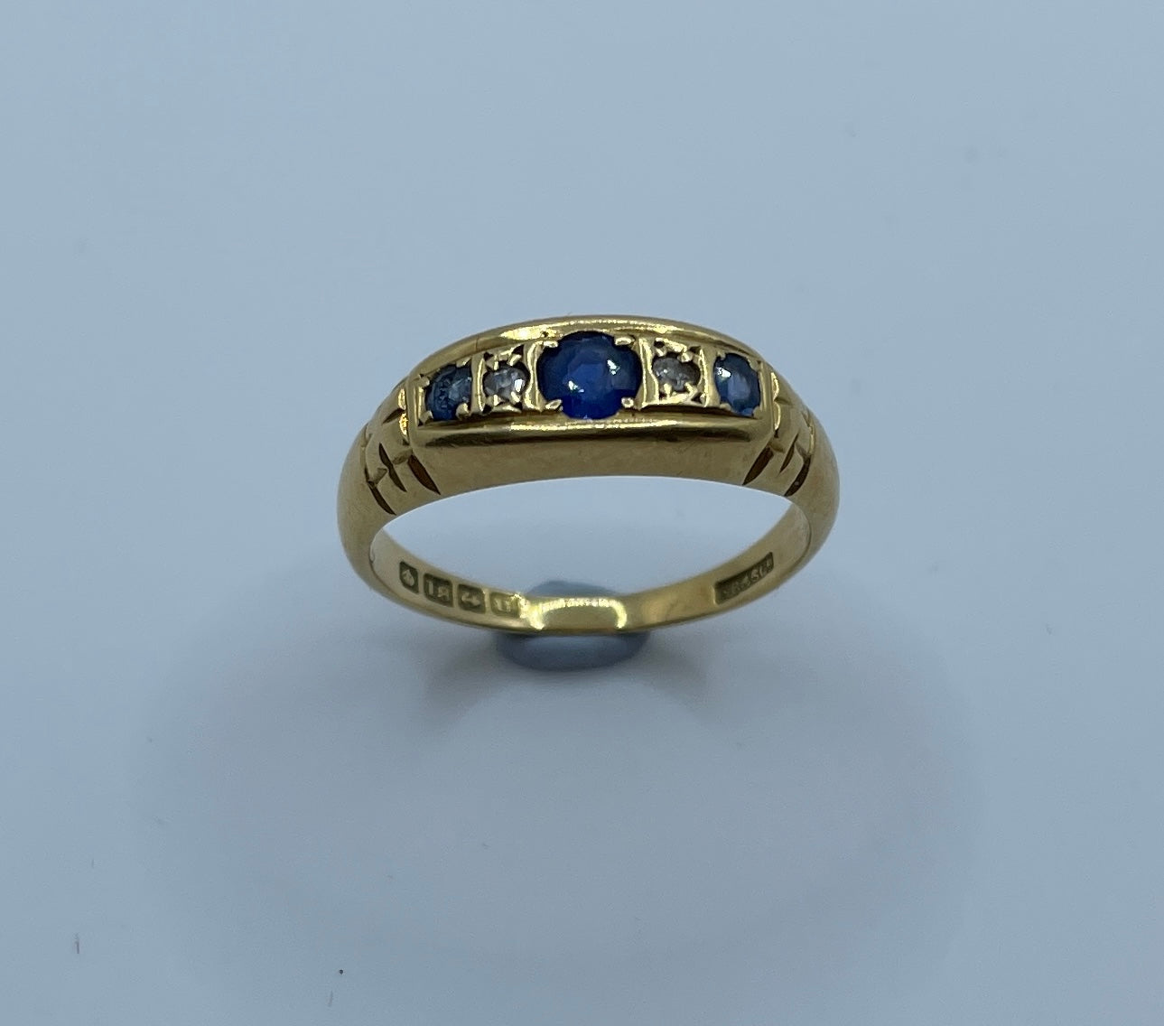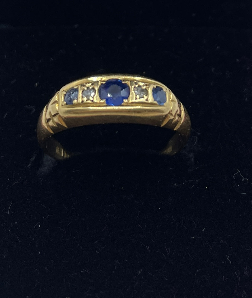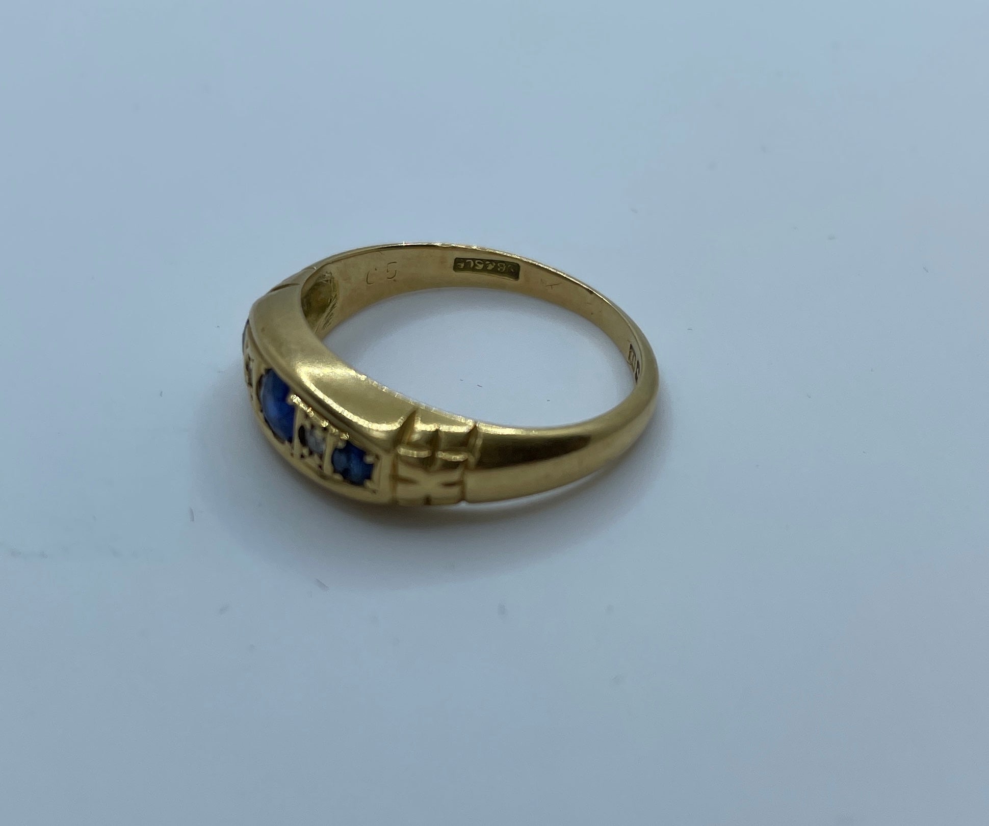 Beautiful sapphire and old cut diamond bridge ring in 18ct gold. Hallmarked for Birmingham 1912 it is set with three sapphires. the small sapphire on the right is chipped, but still has a lovely sparkle.