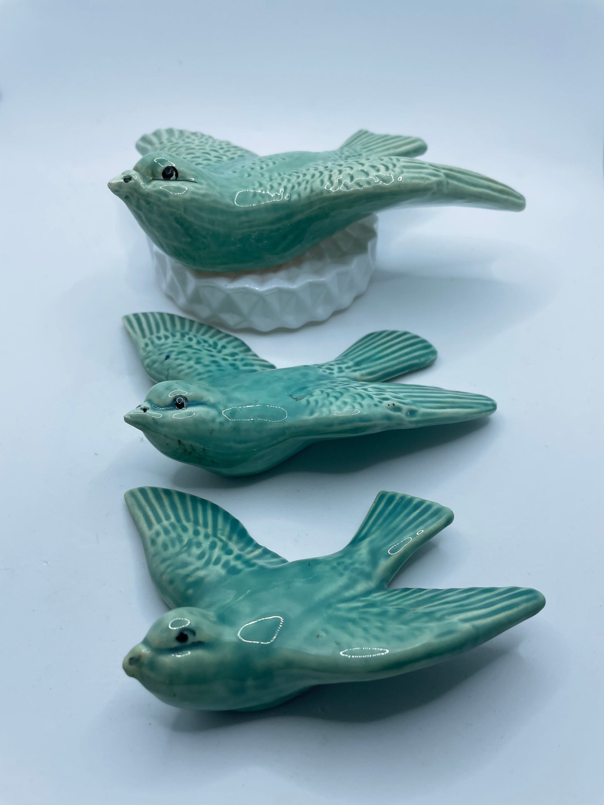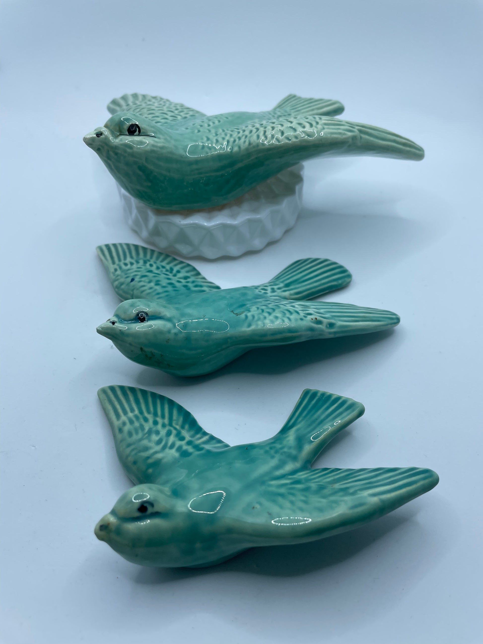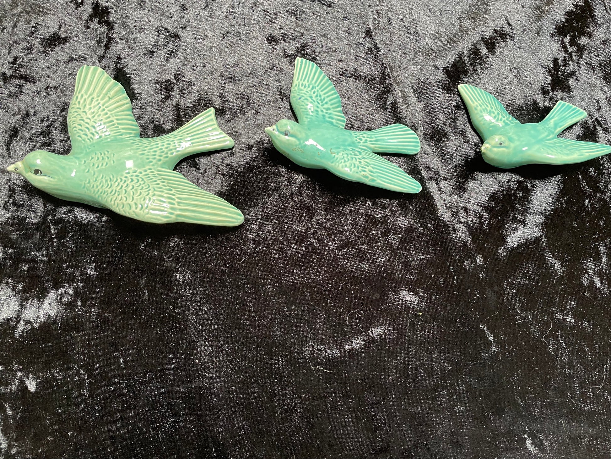 This set of birds comes from my own collection. Purchased in the 1990s they are ceramic and most likely manufactured in Japan in the 1960s when many copies of English wall birds were being made. They have areas on the rear where the glaze did not cover, but are in good condition with no breaks or hairline cracks. Hollow inside. On the wall they look beautiful.