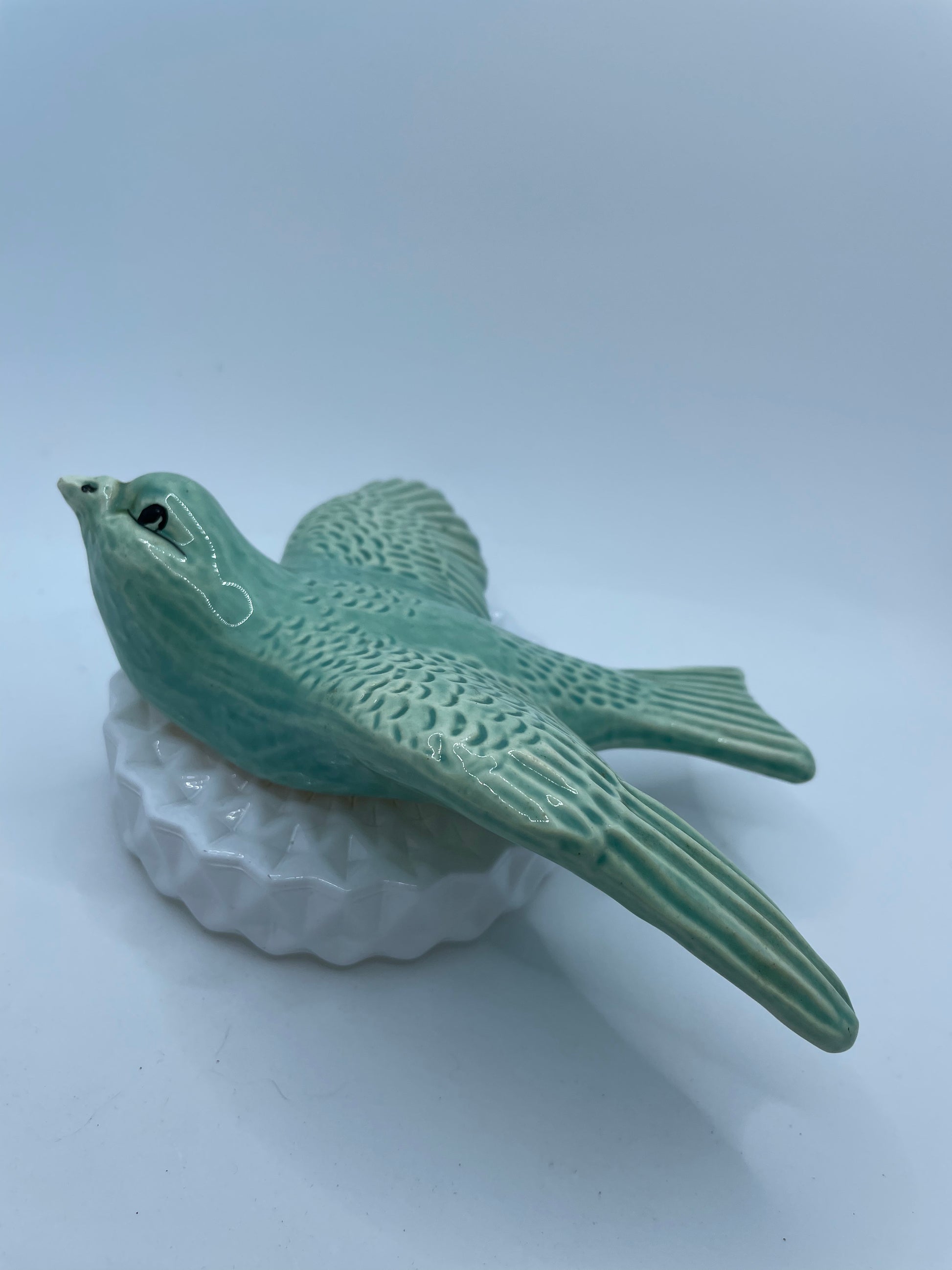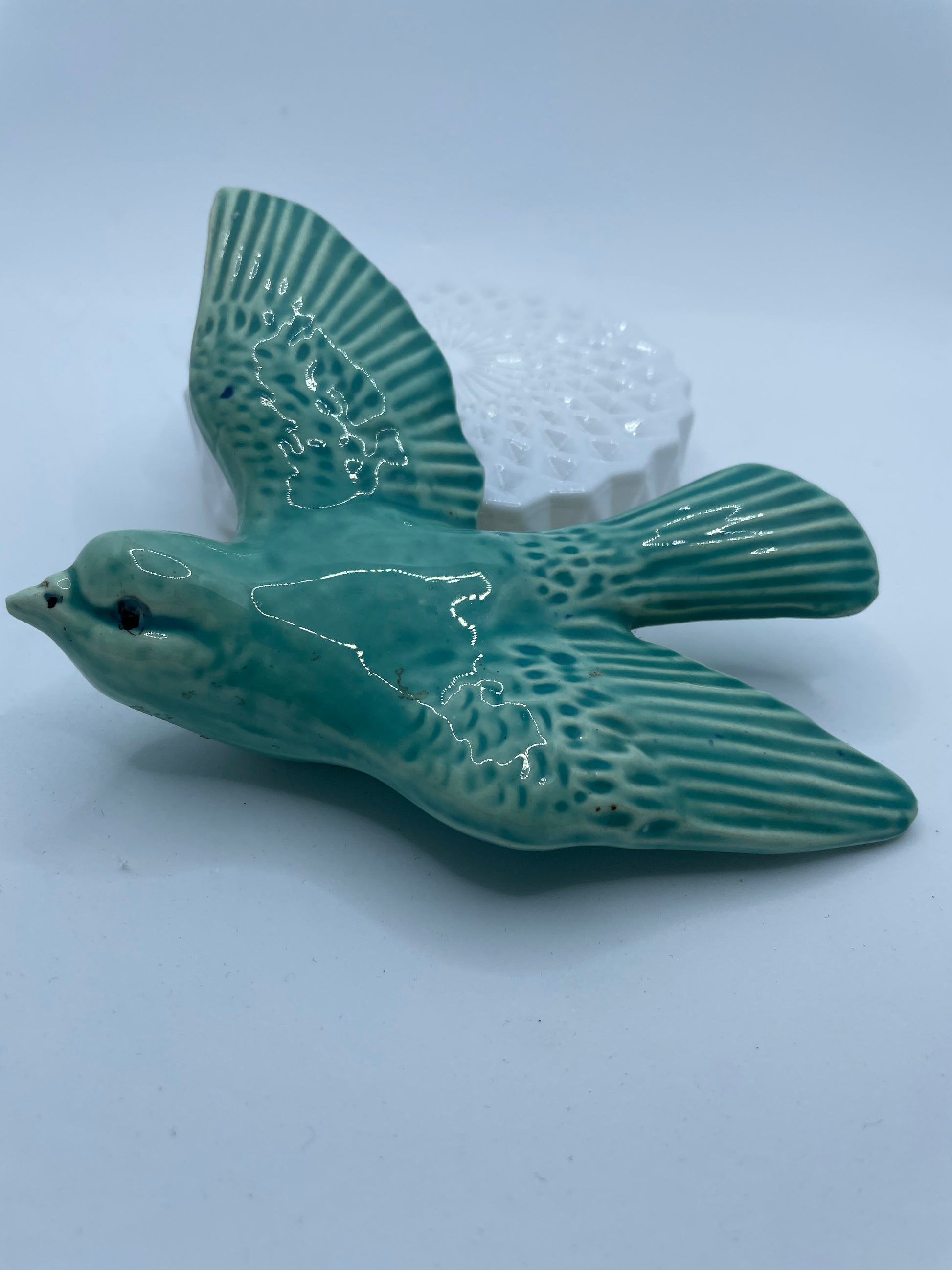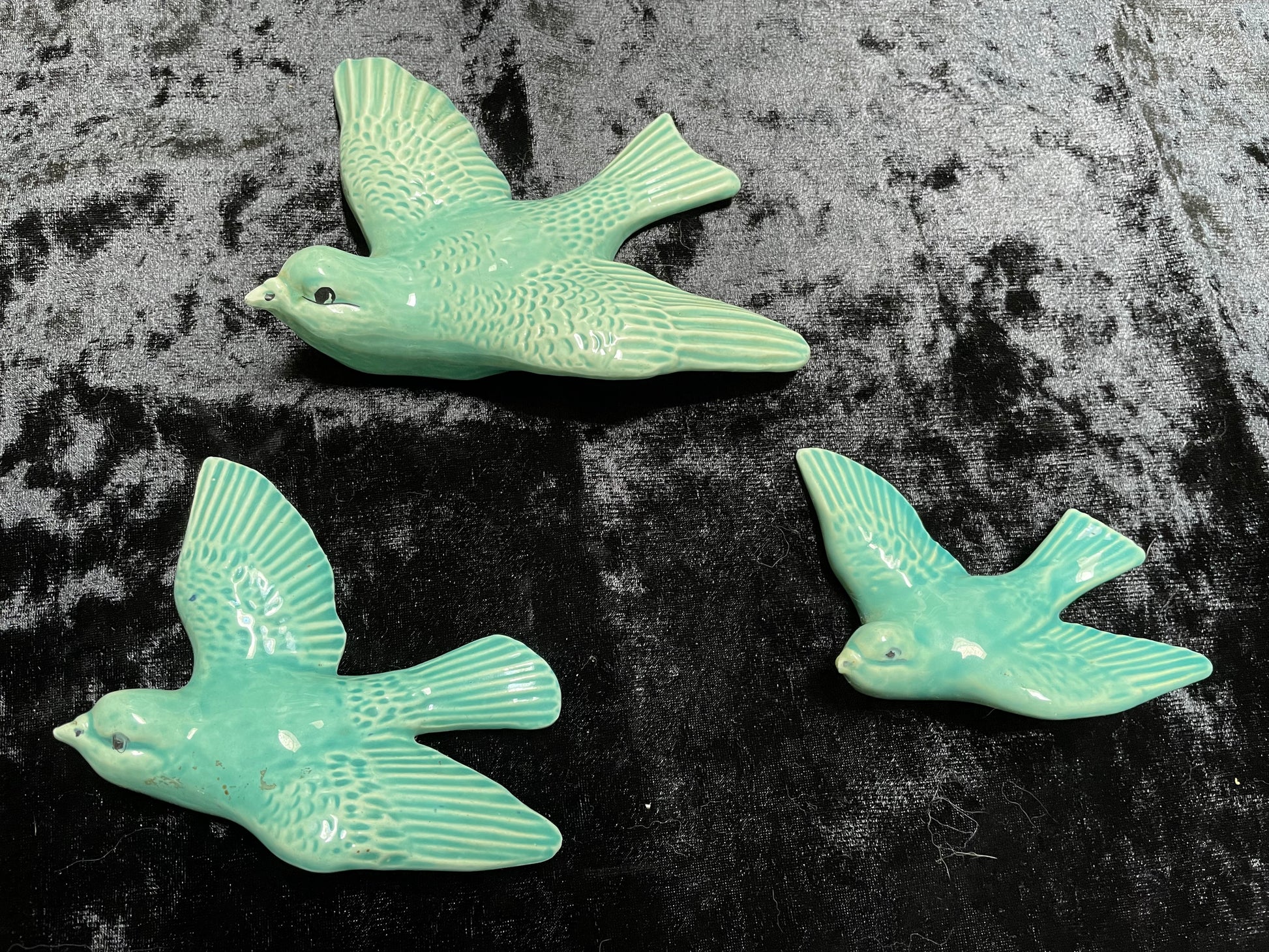 This set of birds comes from my own collection. Purchased in the 1990s they are ceramic and most likely manufactured in Japan in the 1960s when many copies of English wall birds were being made. They have areas on the rear where the glaze did not cover, but are in good condition with no breaks or hairline cracks. Hollow inside. On the wall they look beautiful.