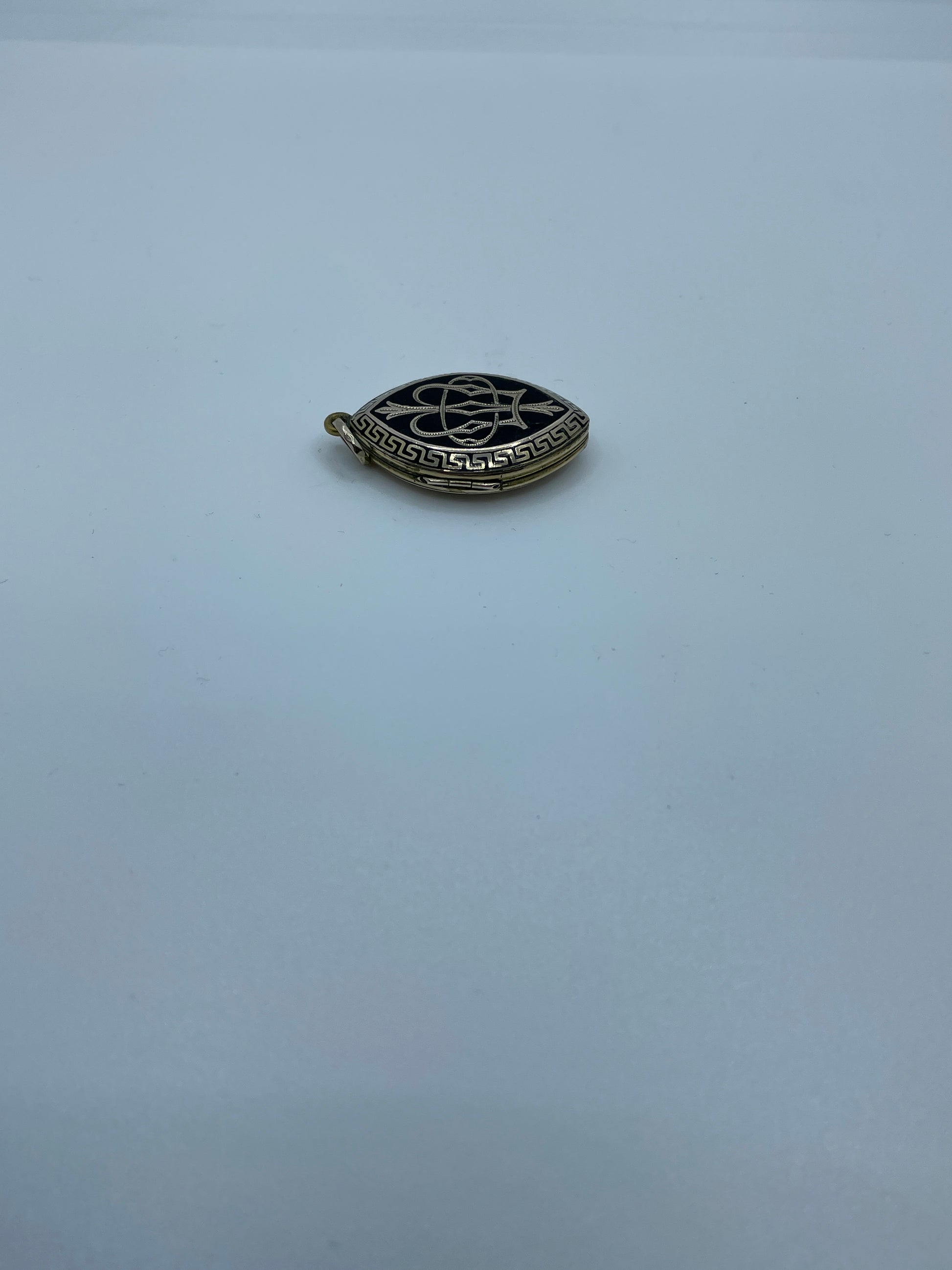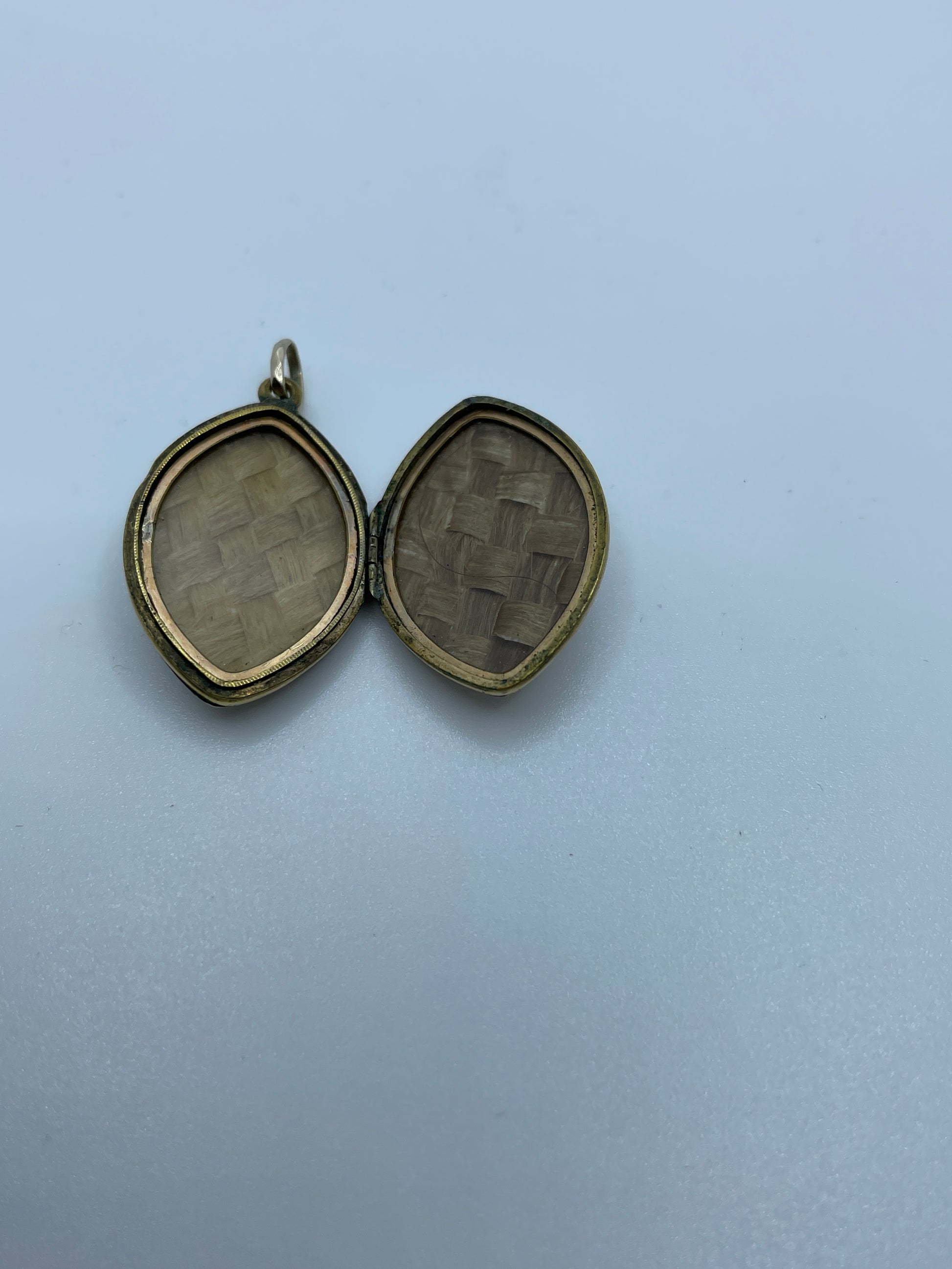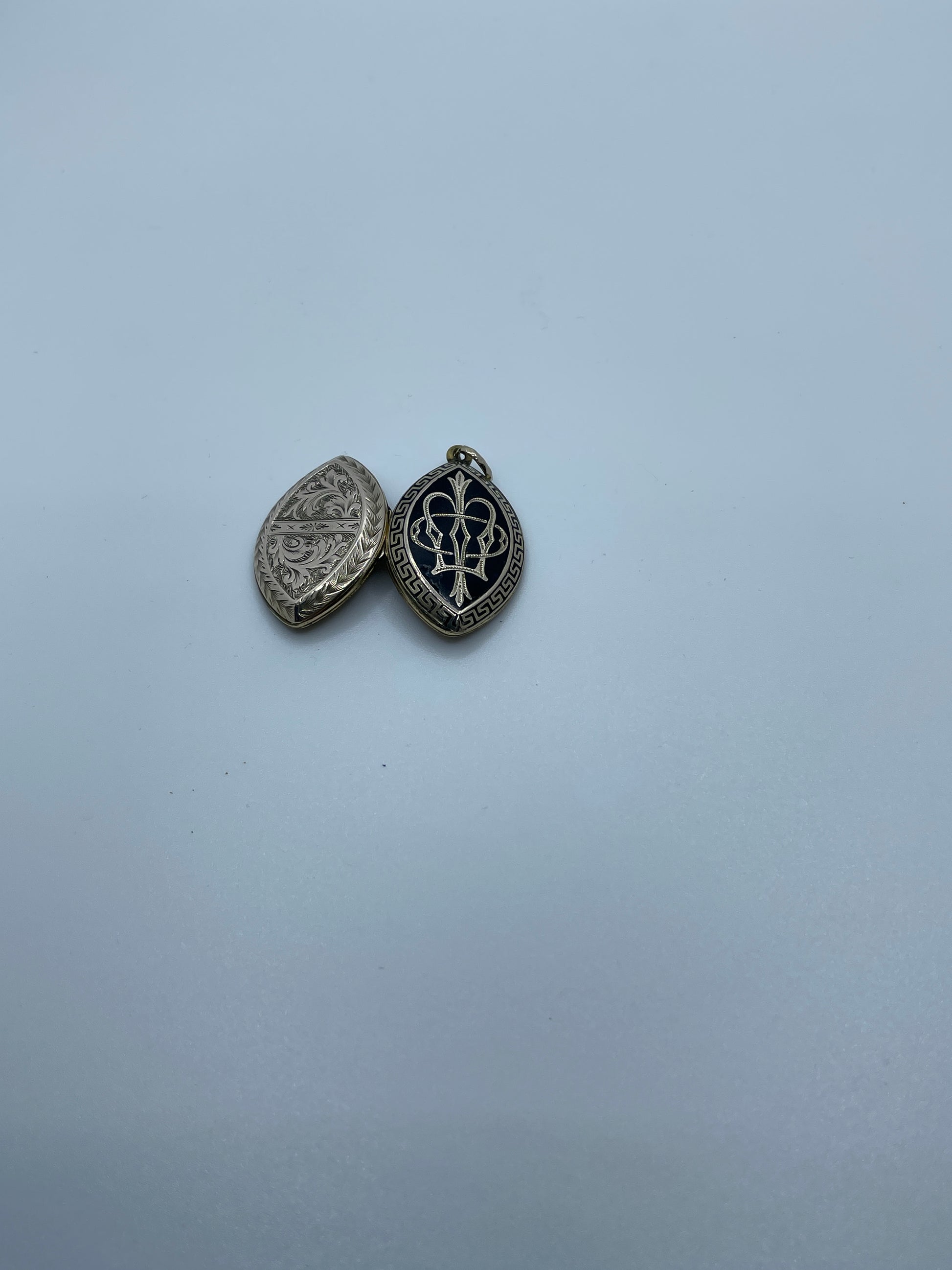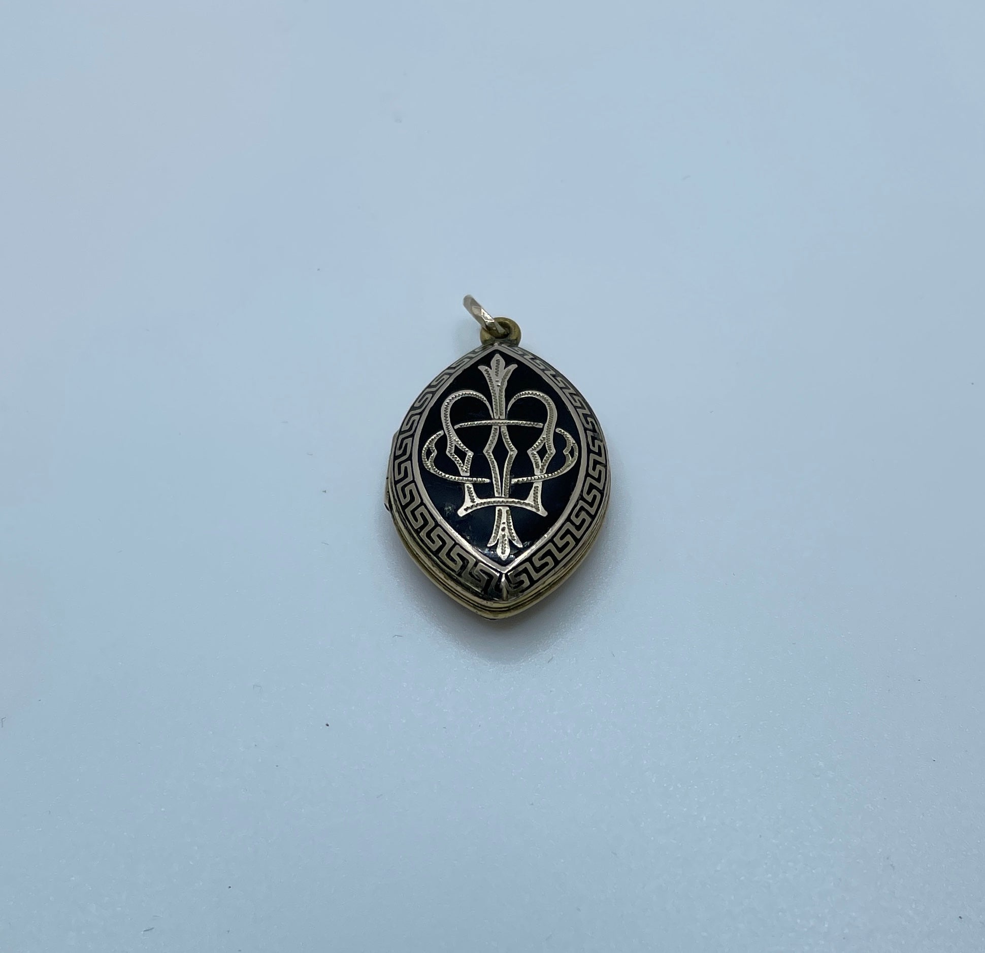 Victorian enamel memorial locket which opens to reveal two woven hair interior panels. This piece really pulls at the heart strings. The front of the locket is black enamel with gold motif and black enamel meander border. The gold filled back of the locket is beautifully engraved with a foliage design. The inside panels have woven hair and are in excellent condition. Locket closes securely. There are no hallmarks on this piece. The enamel on the front of locket has some scratching and may have had small repairs.