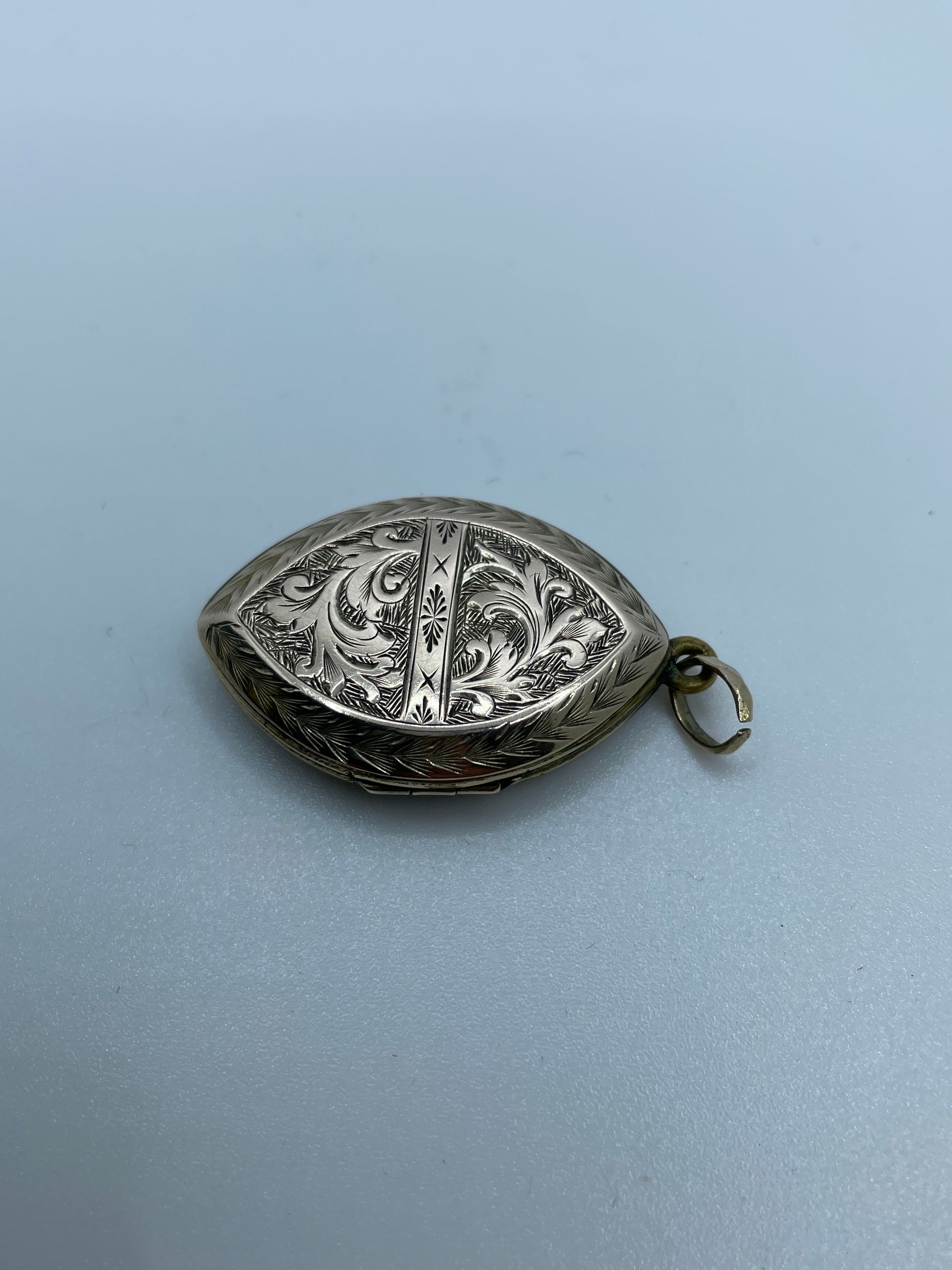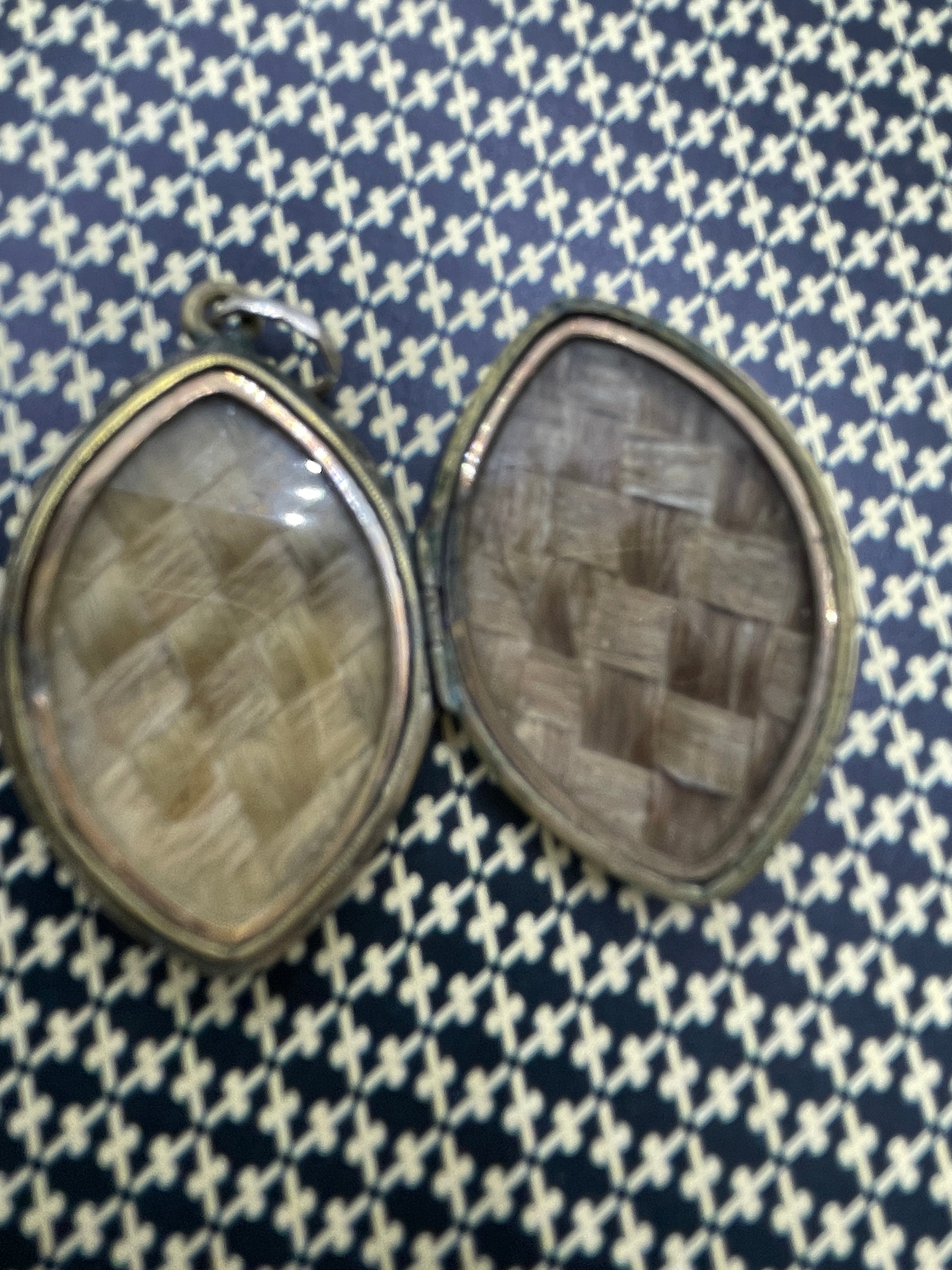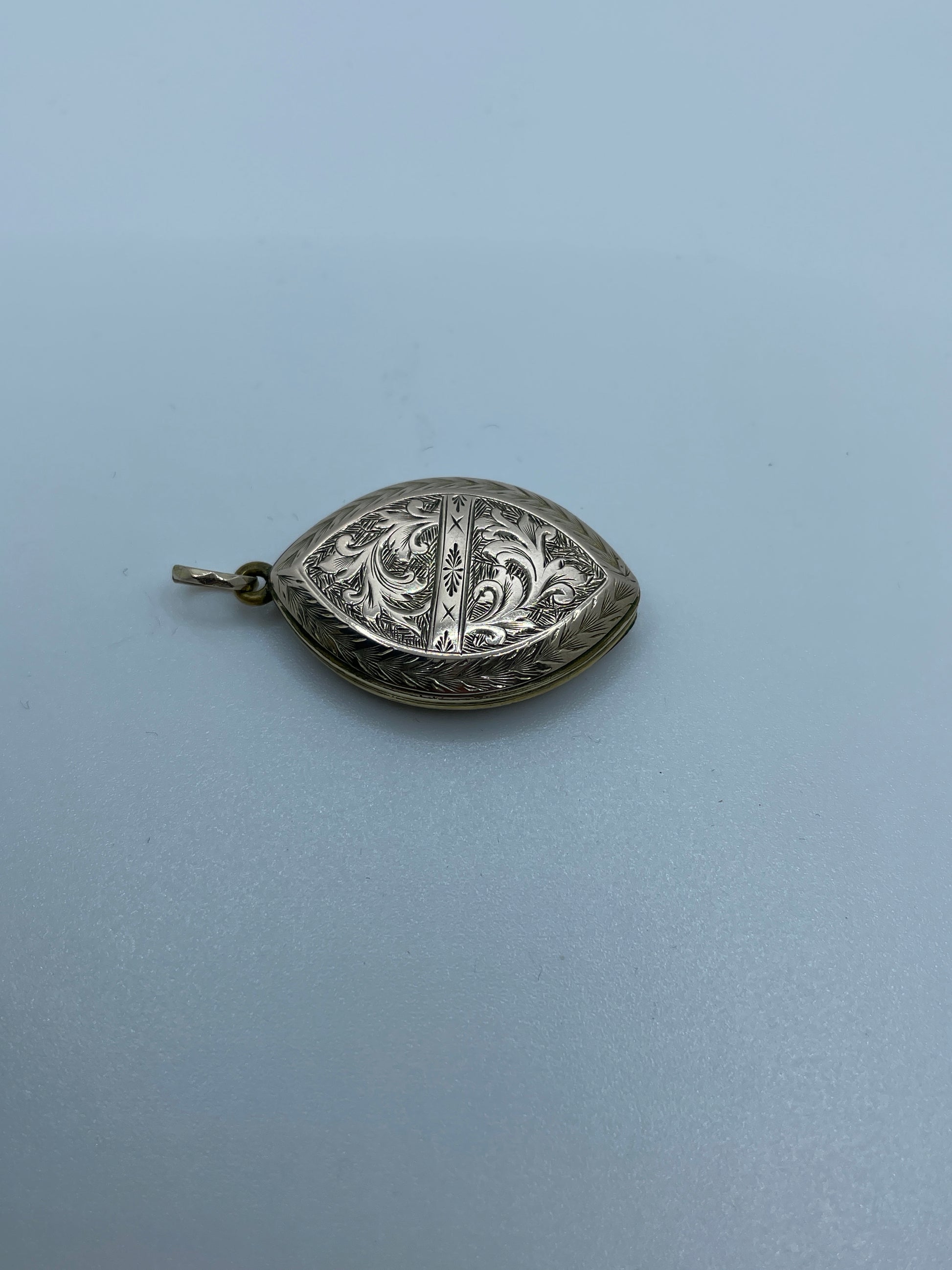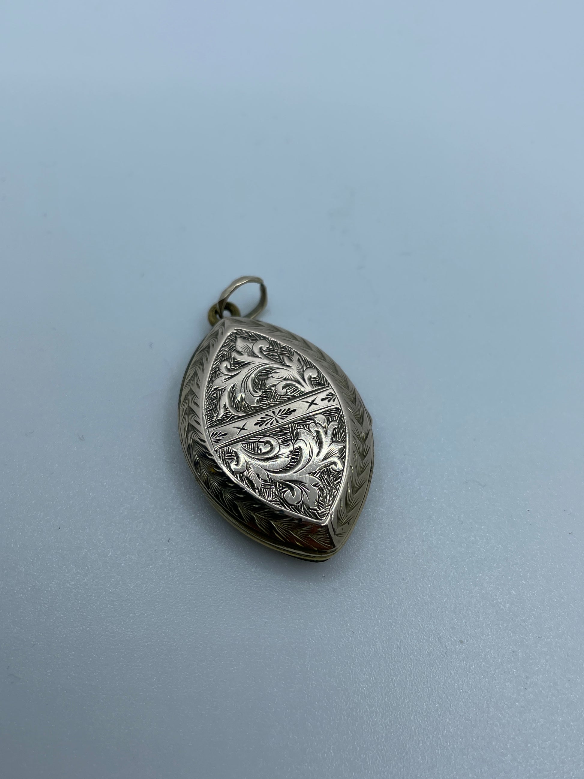 Victorian enamel memorial locket which opens to reveal two woven hair interior panels. This piece really pulls at the heart strings. The front of the locket is black enamel with gold motif and black enamel meander border. The gold filled back of the locket is beautifully engraved with a foliage design. The inside panels have woven hair and are in excellent condition. Locket closes securely. There are no hallmarks on this piece. The enamel on the front of locket has some scratching and may have had small repairs.