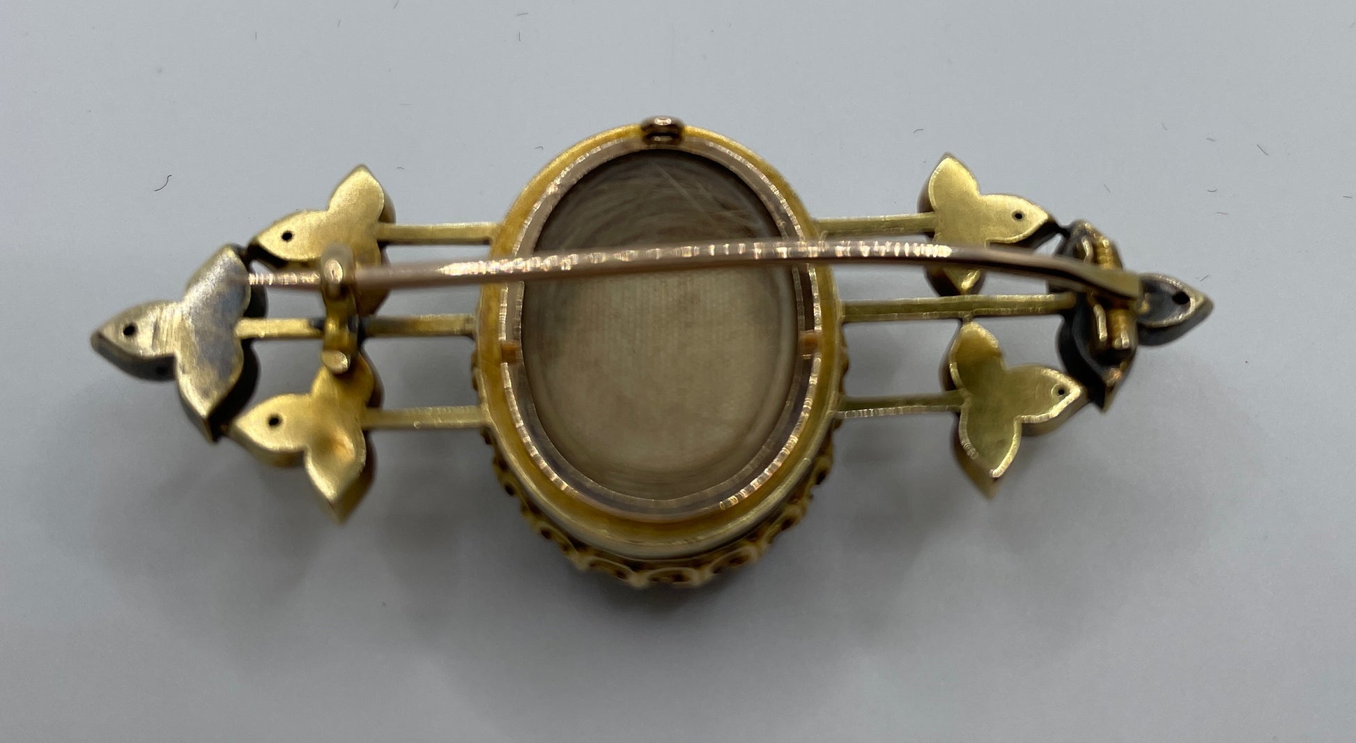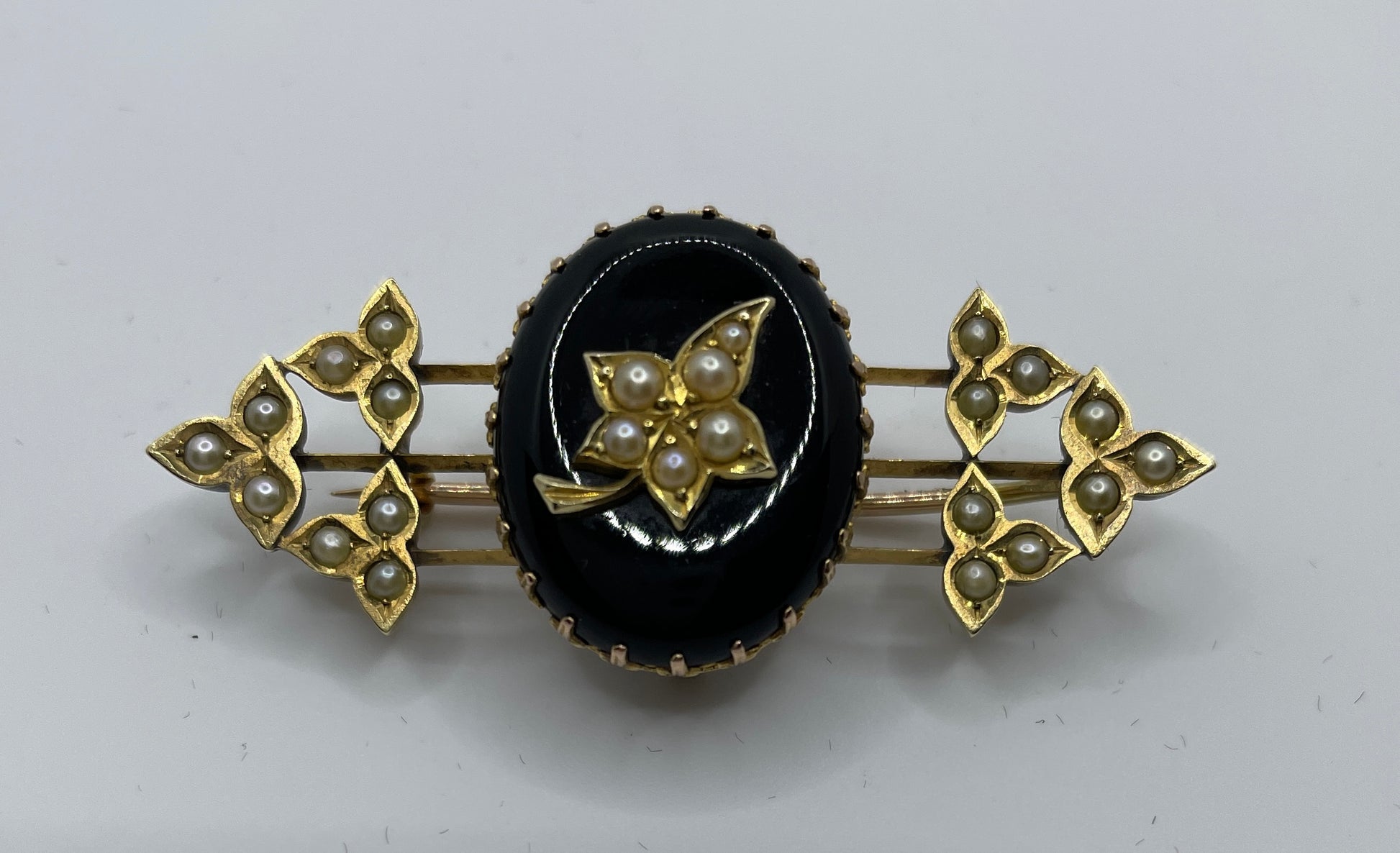 Victorian Pearl And Black Onyx Memorial Brooch with rear locket compartment. The central oval panel with a pearl set leaf, flanked either side with pearl set leaves. Locket at the back contains a lock of flaxen blond hair.