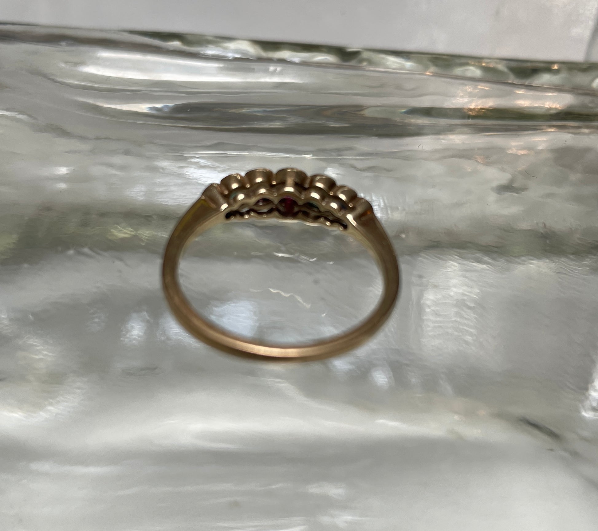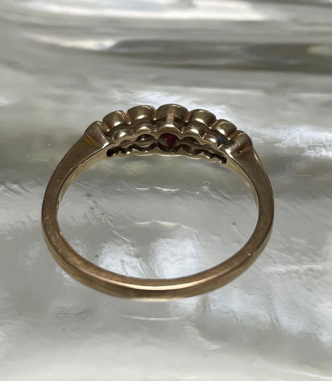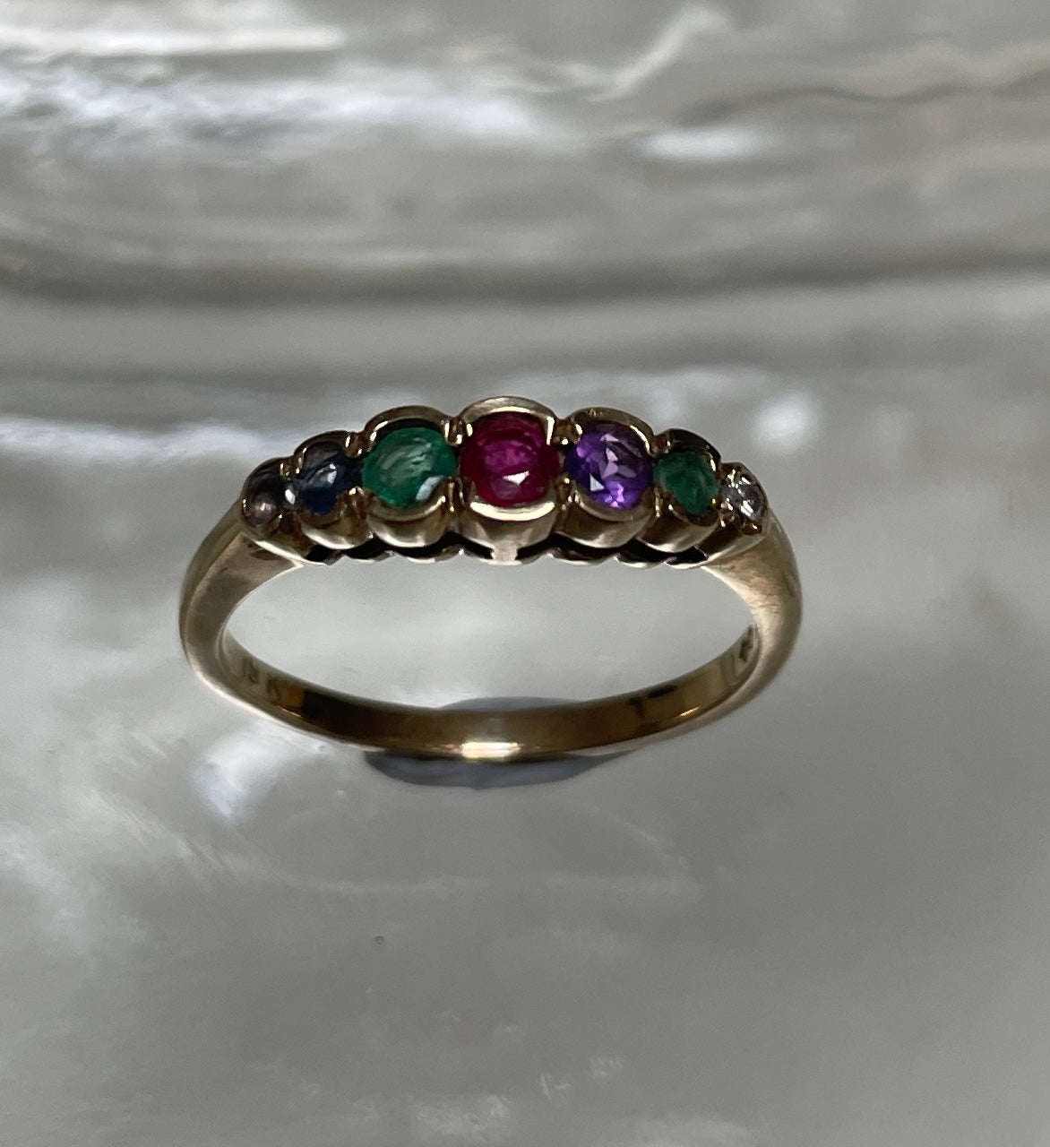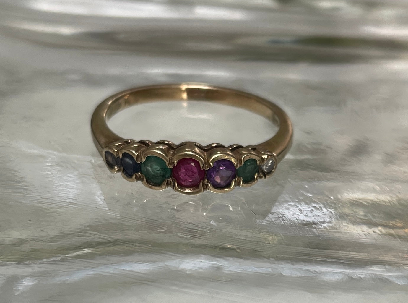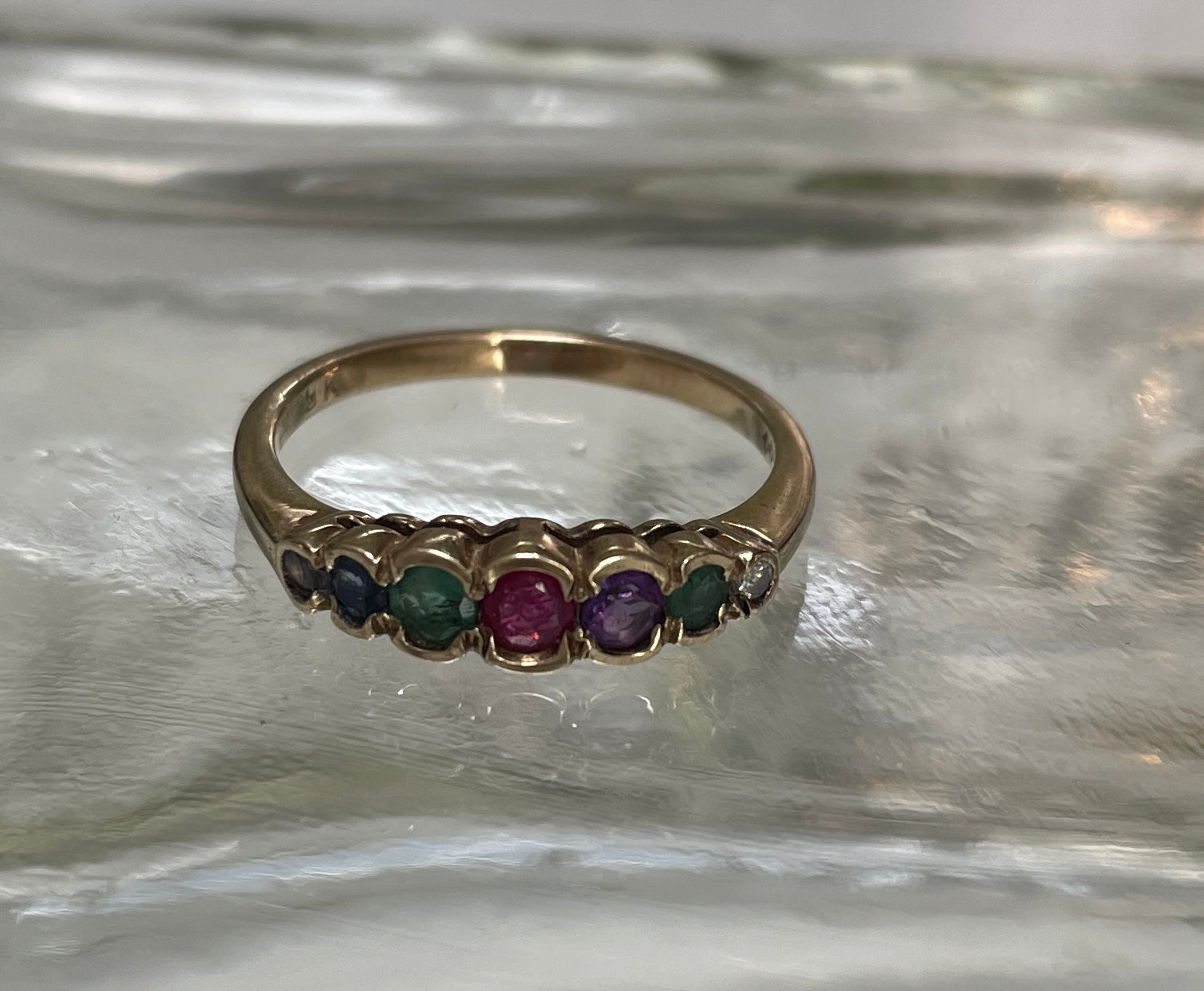 The love of acrostic jewellery of the Victorian era seen again in this vintage DEAREST ring. The 9ct band contains diamond,emeralds, amethyst, ruby, sapphires and tanzanite. Makers mark A K