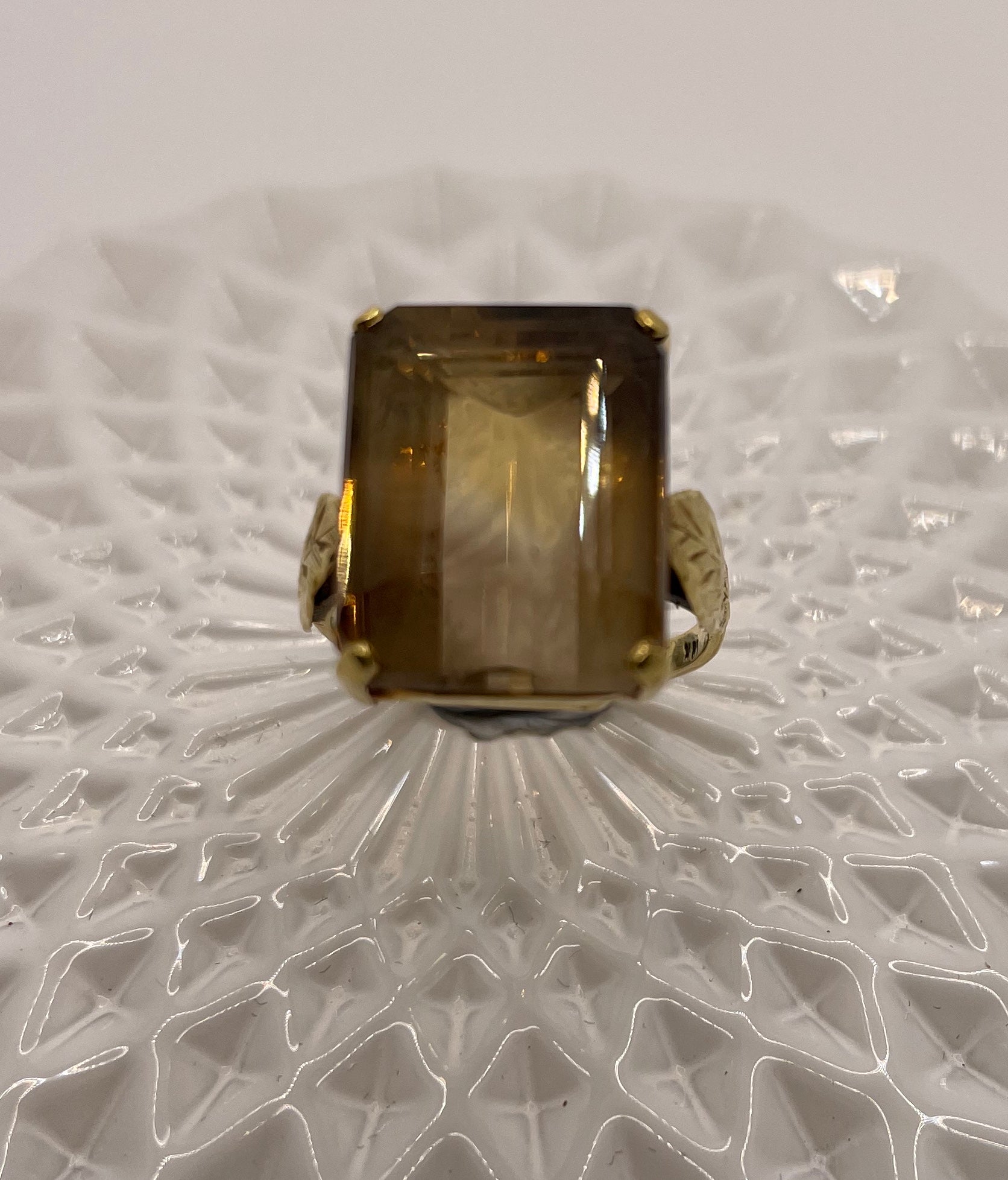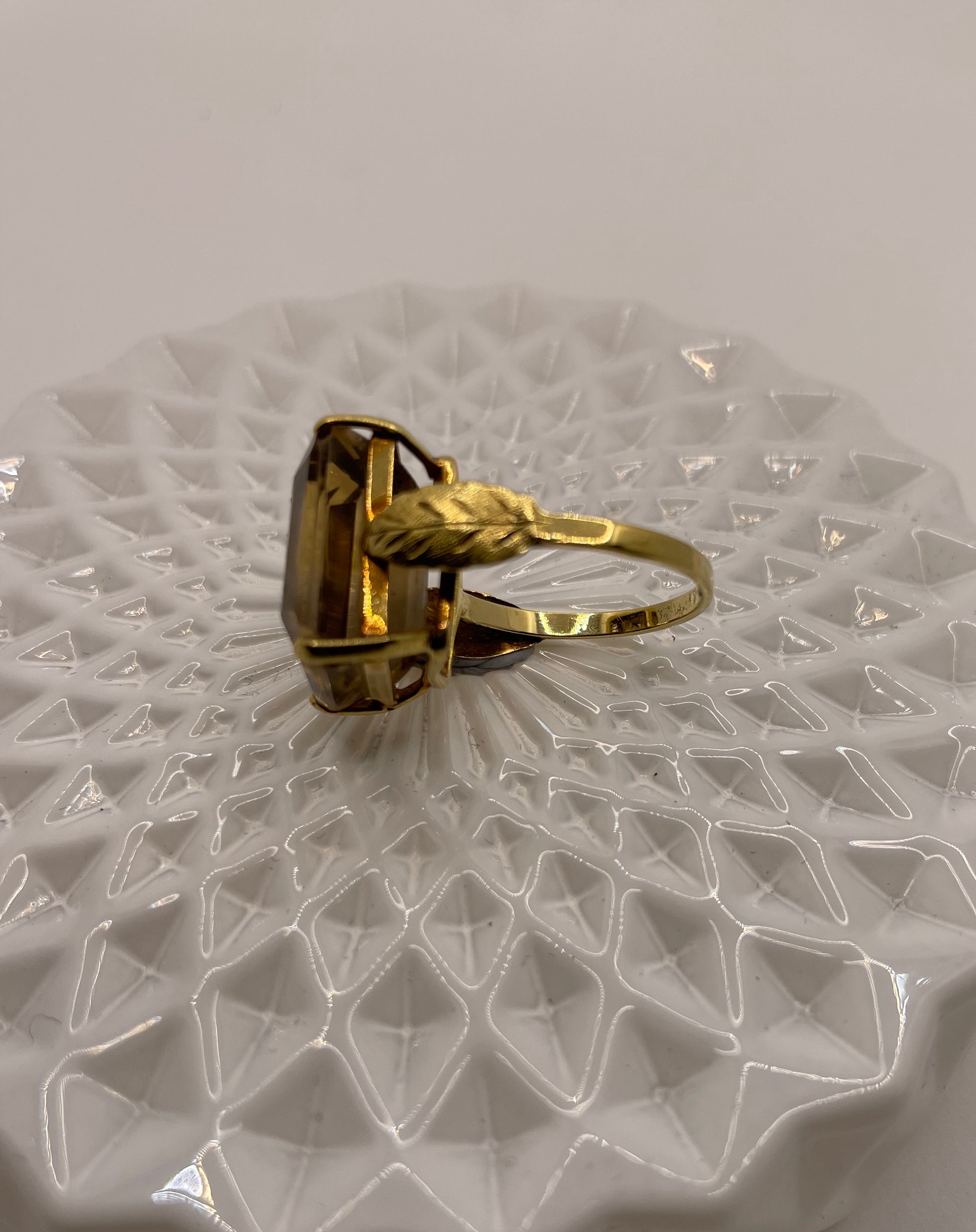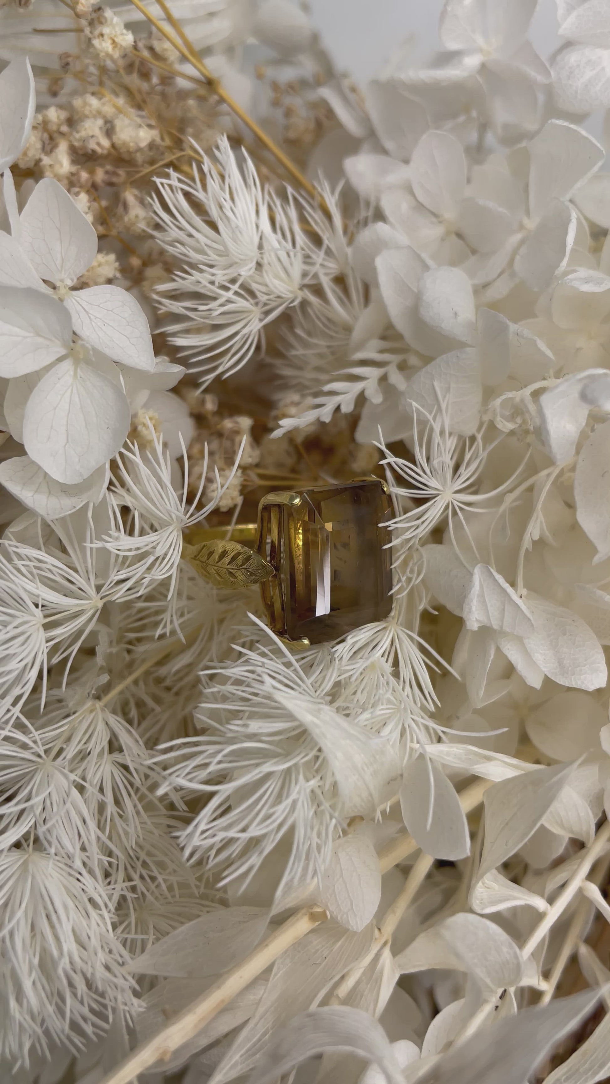 A stunning smoky quartz single-stone ring with gorgeous leaf detail to sides.