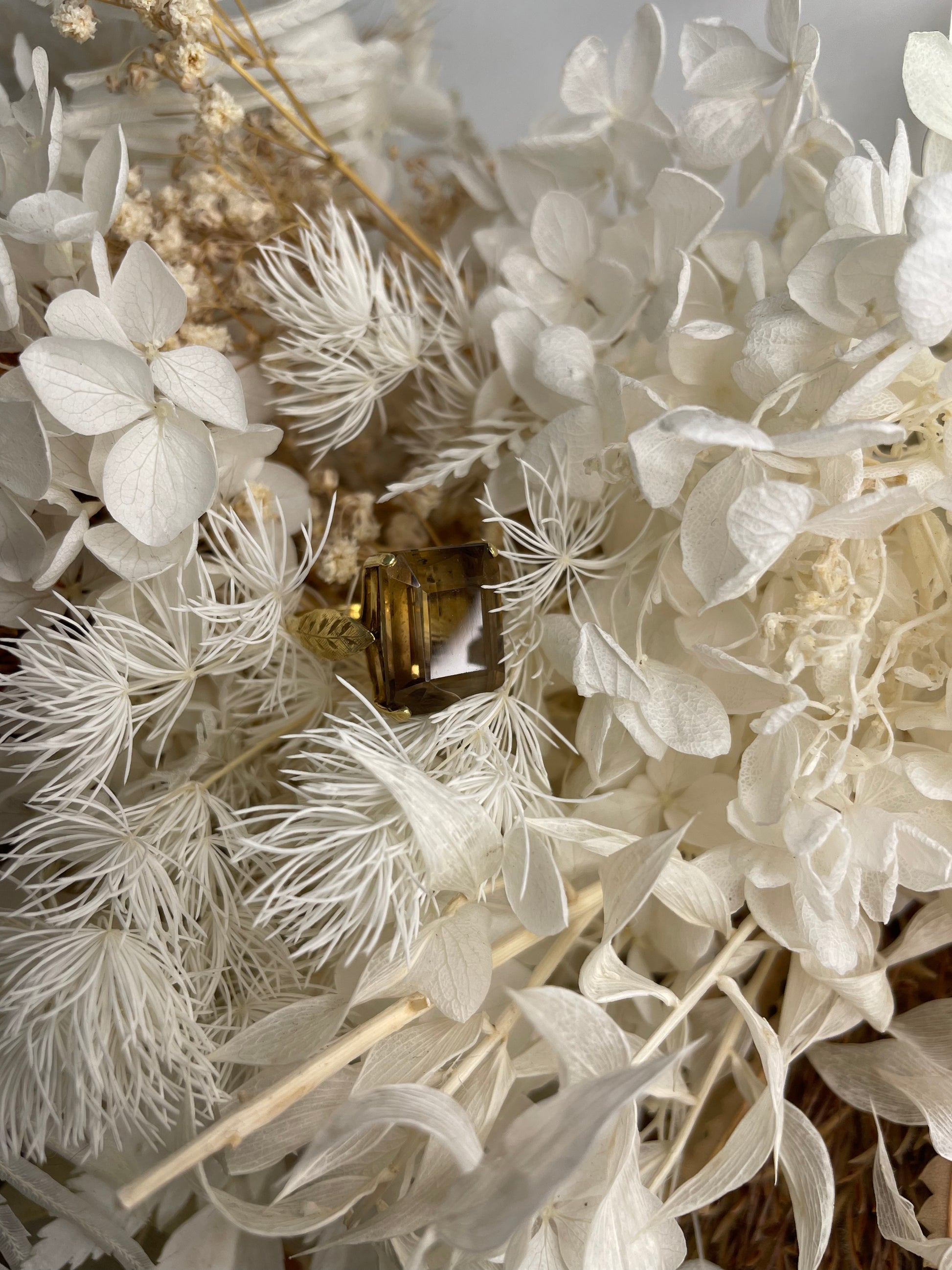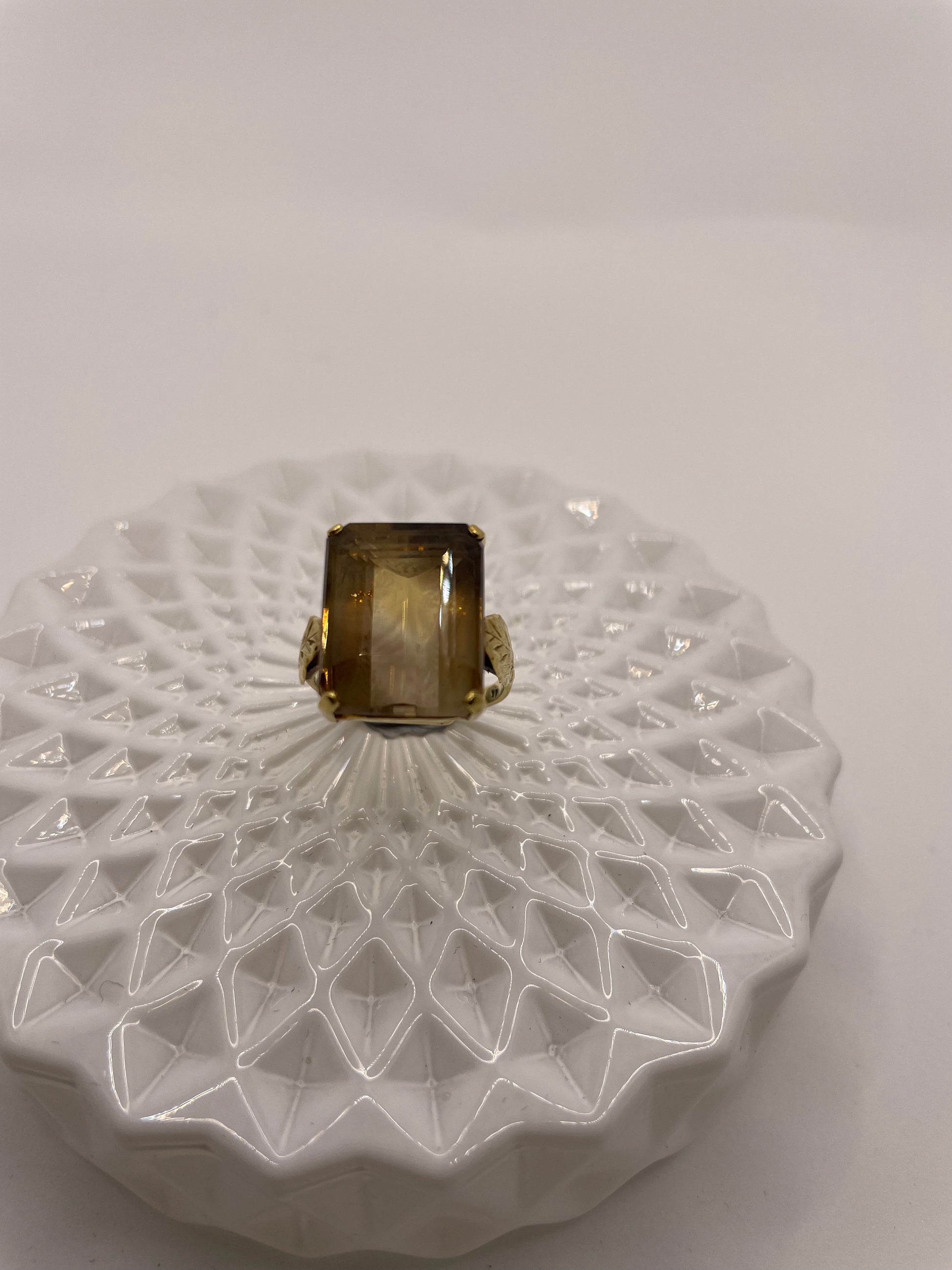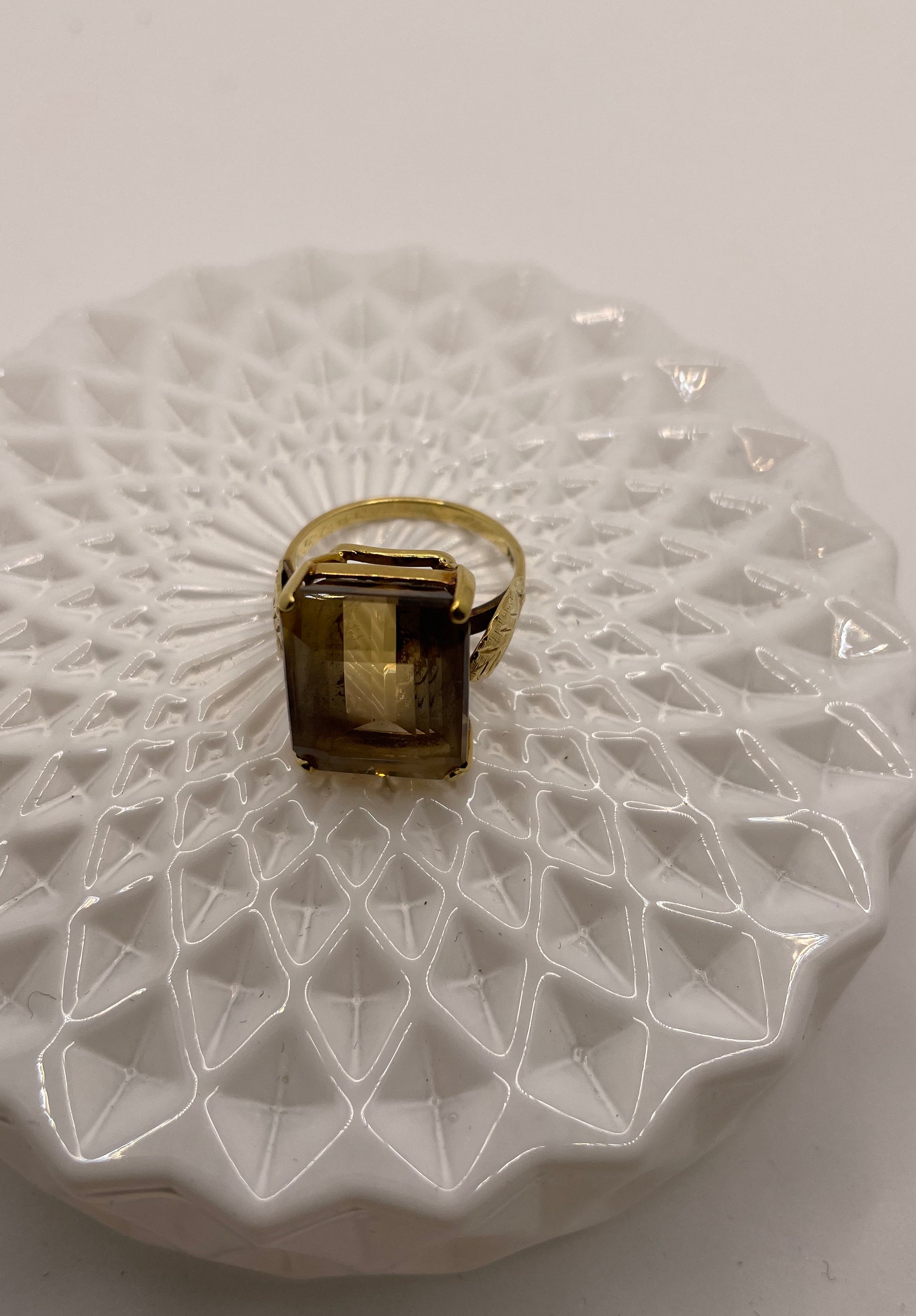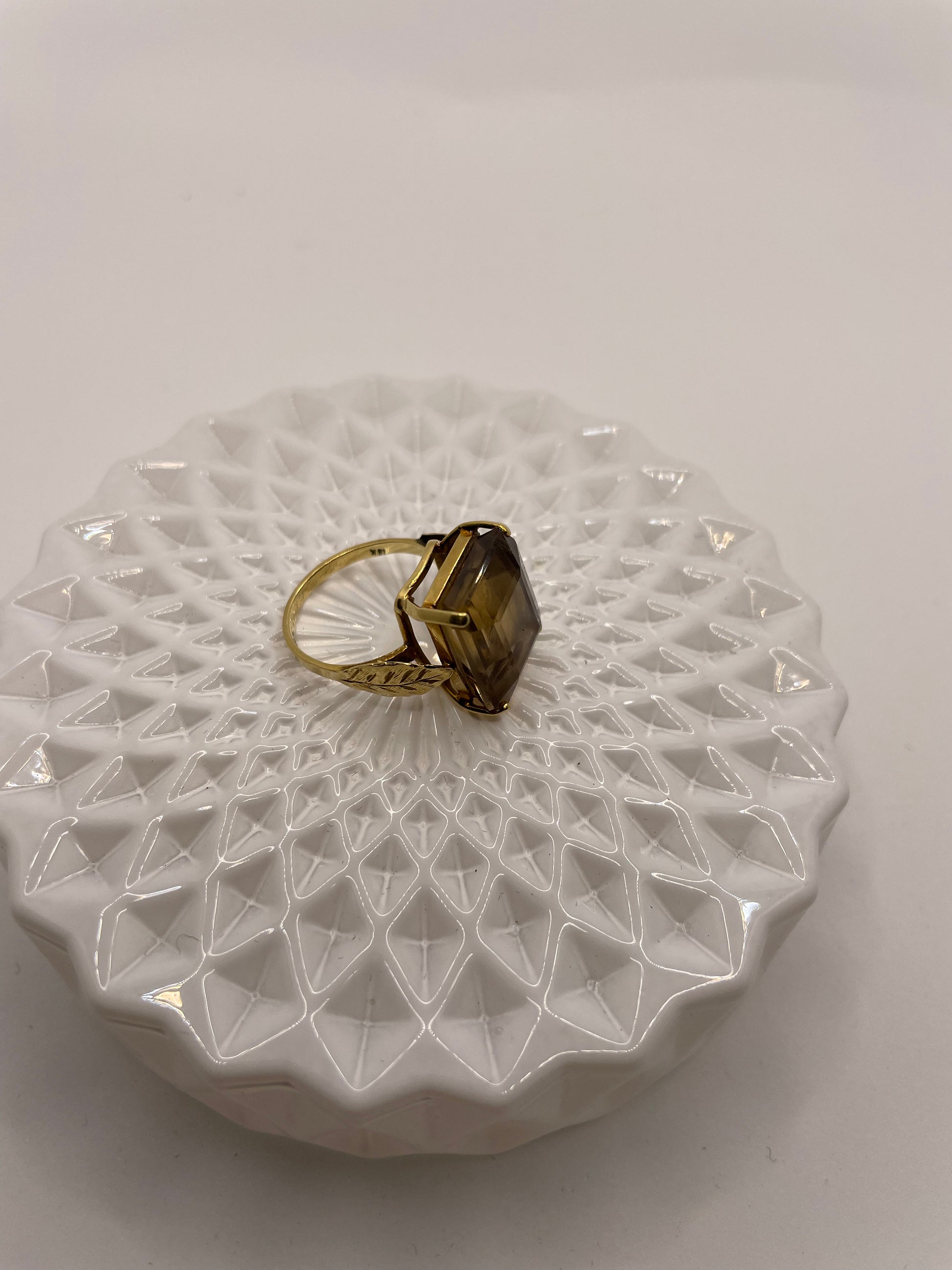 A stunning smoky quartz single-stone ring with gorgeous leaf detail to sides.